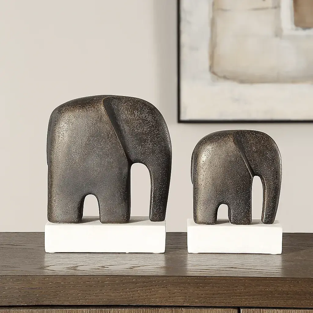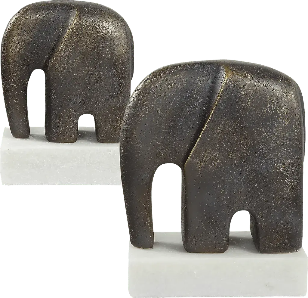 This stunning Ascan set of two antique bronze-finished elephants is beautifully crafted to bring a sense of elegance and charm to your space. Each elephant is nicely detailed and rests on a sleek white marble base, creating a striking contrast that enhances their majestic presence. Perfect for display on a shelf, desk, or mantel, these decorative accents symbolize strength and wisdom, making them a timeless addition to any decor.