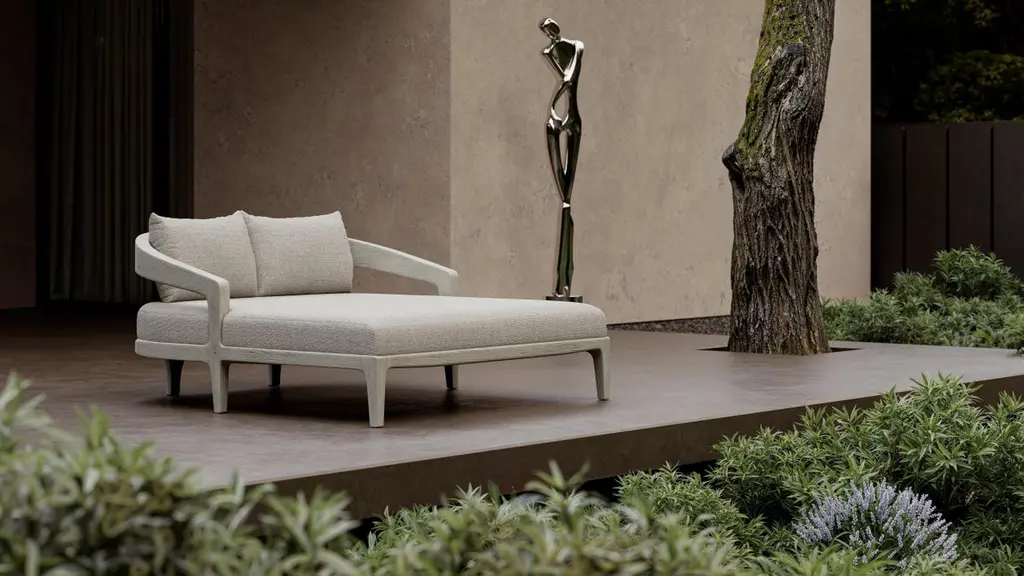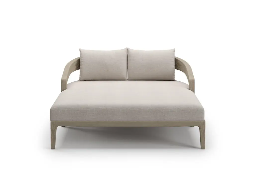 Ash Whale Daybed by SNOCDimensions: W 148 x D 164 x H 66 cm.Materials: Teak Wood. The Whale-ash Collection features an elegant and robust design style inspired by the form of a whale skeleton. This unique collection is crafted by combining sustainable and natural materials with the exceptional quality of Teak wood. Strong and thick lines in the vertical plane enhance the design, while the structure in the horizontal plane captures attention. In addition to its skeletal framework, the Whale-ash Collection provides a comfortable experience with its broad seating details, offering users not only aesthetic appeal but also ergonomic comfort. Sunbrella fabric details in natural Teak and Black Teak color options, along with a table crafted from sand and epoxy materials, complement the SNOC Collections, including lounge sets, dining sets, and daybeds.SnocSince their foundation in 2004, SNOC’s history has been interwoven with that of international design. Each chapter written with care, each product reflecting its passion. The company understands that a real story exists behind each object and behind that story, a real person desiring something more. Their ever-developing methodology focuses on defining the core of a brand and utilizing those characteristics to help nurture its soul, aiding in forging real connections. This approach , results in their unique “work in progress” style: original, versatile solutions that in their signature blend of sound, vision and design best-suit every environment and situation, arousing a range of emotions on a daily basis as well as standing the test of time.Driven by functional research, an inclusive project and product culture, and deep care for the environment, we exist as the timeless yet present essence of outdoor furniture design elevating private and public space a like with thoughtfully presented, endlessly adaptive creations.