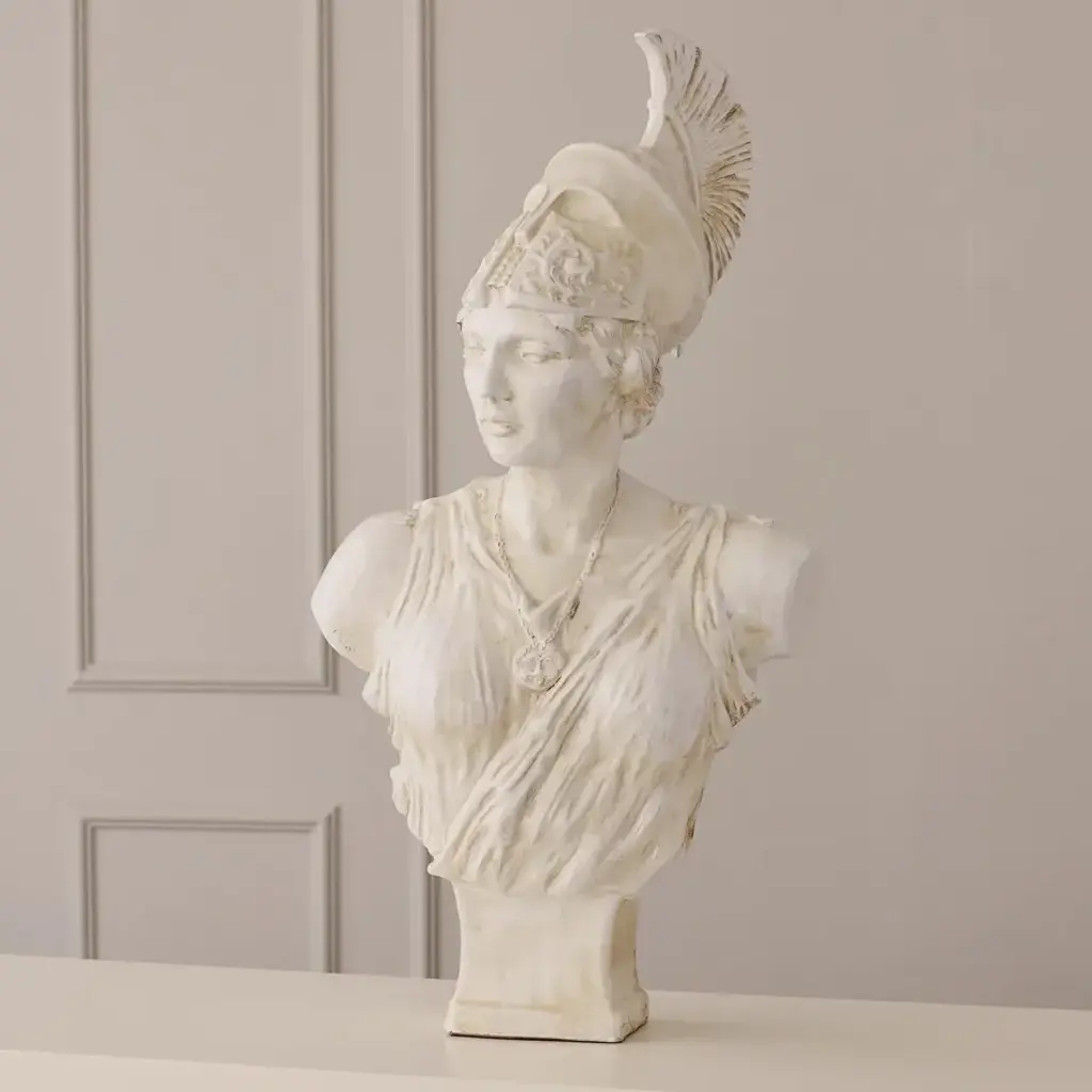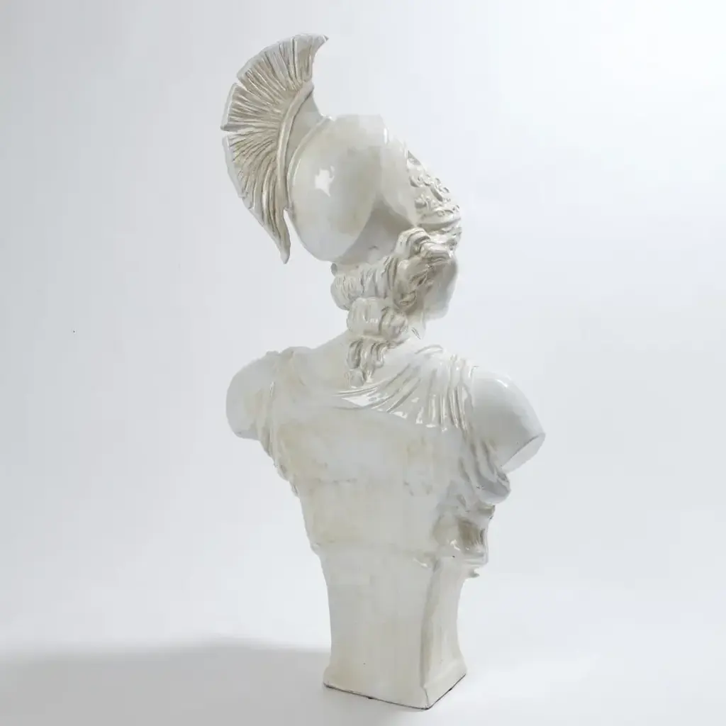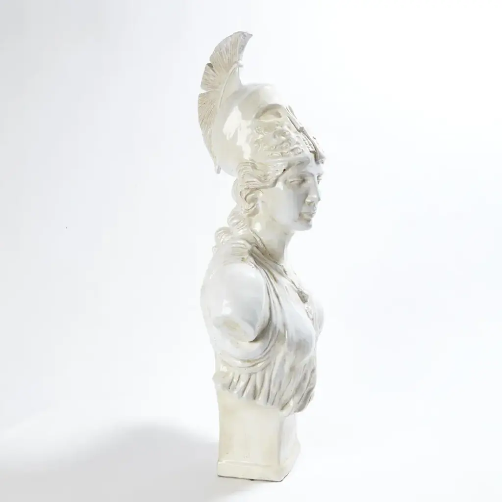 Creative Director George Sellers created Athena by hand carving it from clay; a plaster casting was then sent to Italy for production in ceramic. The original, thought to be from the 4th century BC, is on display at the Louvre in Paris, France. Athena was the Greek goddess of many things: wisdom, courage, inspiration, civilization, law, justice, just warfare, mathematics, strength, strategy, arts, crafts, and skill. Our goddess is made from terracotta, formulated in a method the Italians refer to as "calco", the act of packing a perfectly produced mold with clay. Once allowed to dry it is pulled away from the mold and transferred to a kiln where it's fired at 950 degrees, after being glazed in our signature antique white glaze. Warrior goddess extraordinaire and all from the hands of George Sellers. From a fashion forward perspective, Global Views offers accessories, furniture, statement lighting, and an assortment of rugs and mirrors to add beauty and joy to your home.