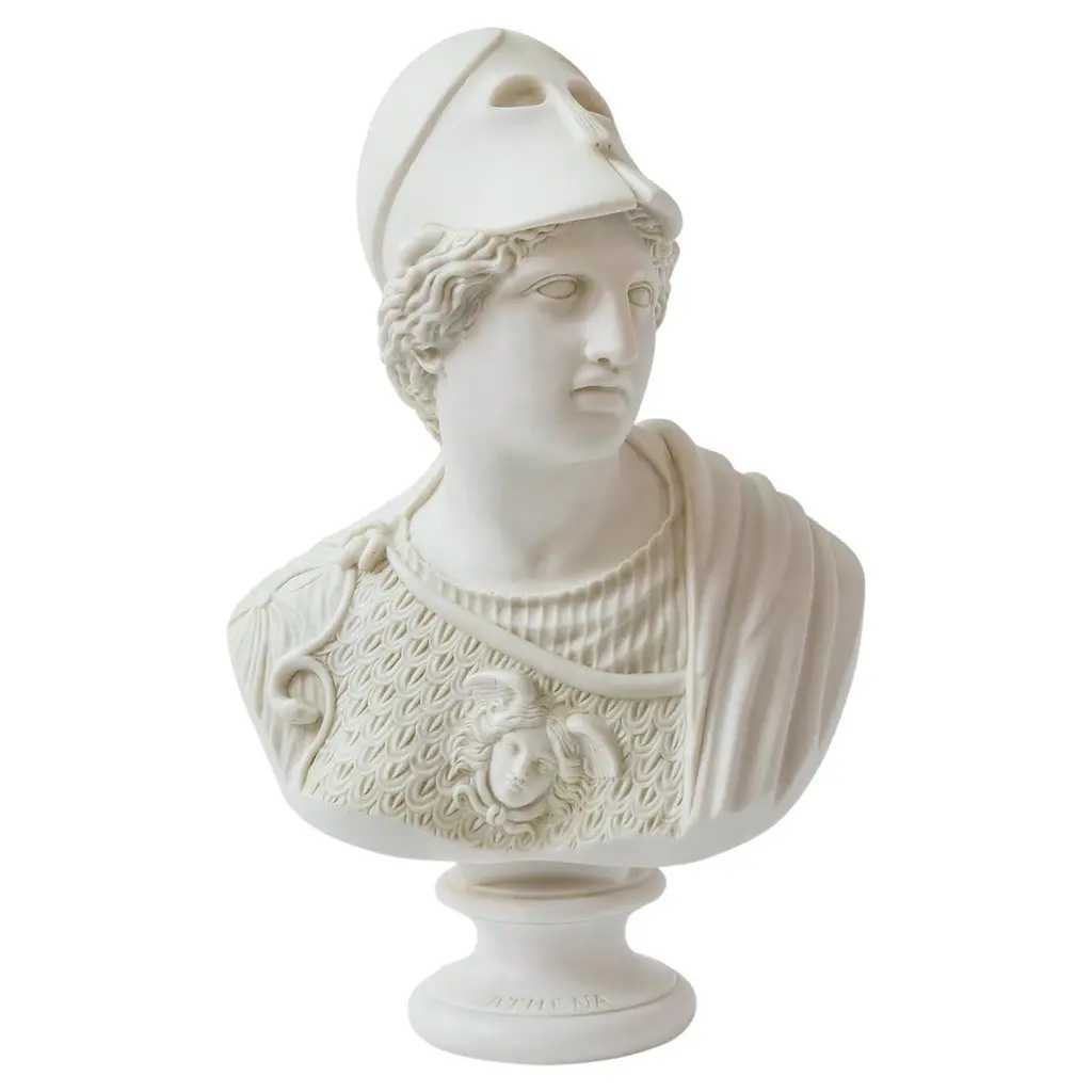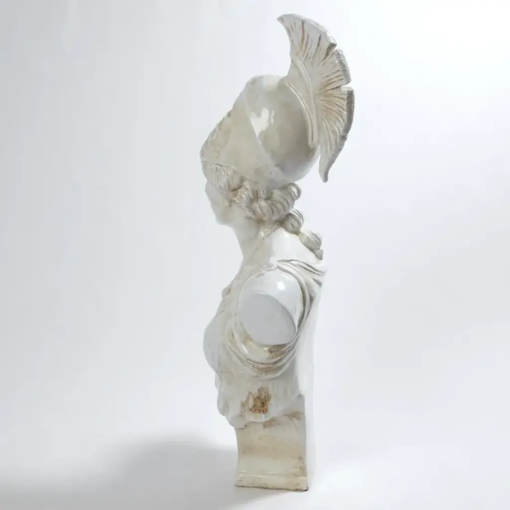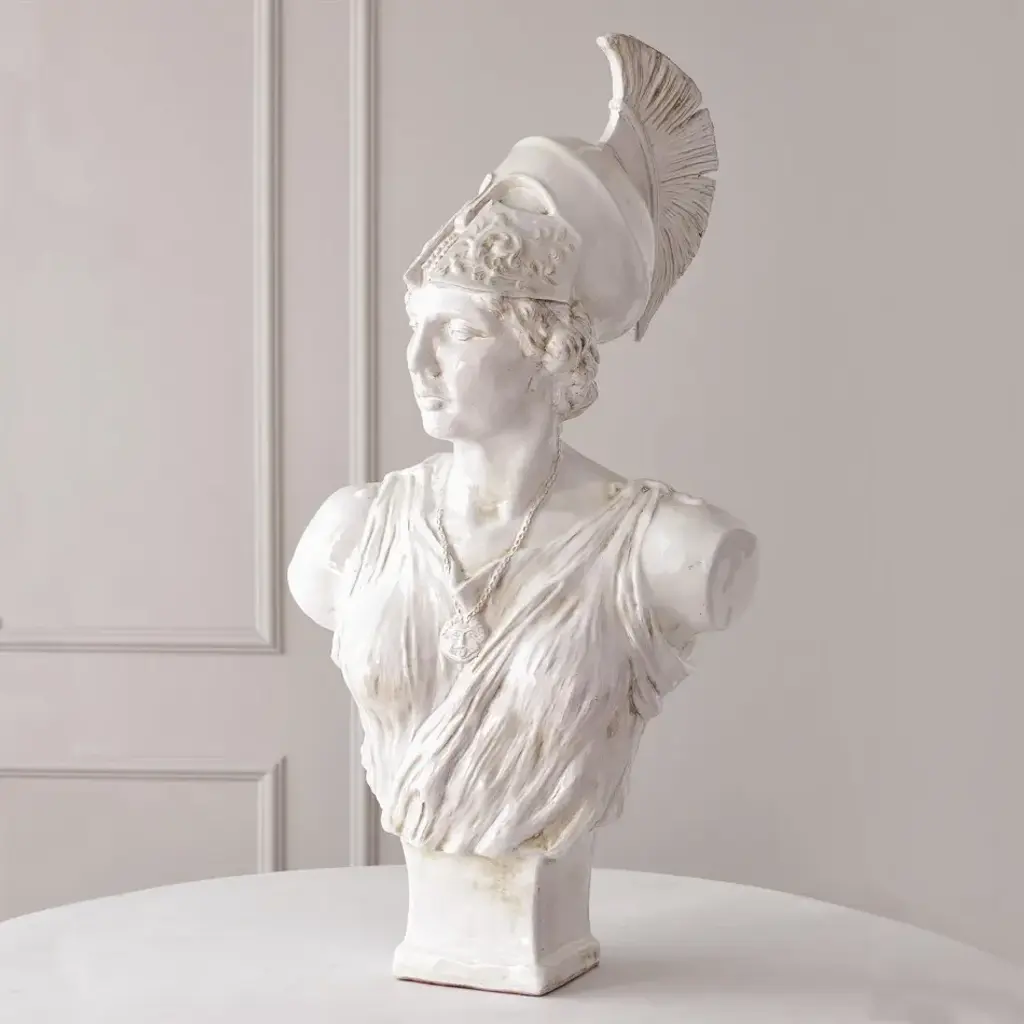 Creative Director George Sellers created Athena by hand carving it from clay; a plaster casting was then sent to Italy for production in ceramic. The original, thought to be from the 4th century BC, is on display at the Louvre in Paris, France. Athena was the Greek goddess of many things: wisdom, courage, inspiration, civilization, law, justice, just warfare, mathematics, strength, strategy, arts, crafts, and skill. Our goddess is made from terracotta, formulated in a method the Italians refer to as "calco", the act of packing a perfectly produced mold with clay. Once allowed to dry it is pulled away from the mold and transferred to a kiln where it's fired at 950 degrees, after being glazed in our signature antique white glaze. Warrior goddess extraordinaire and all from the hands of George Sellers. From a fashion forward perspective, Global Views offers accessories, furniture, statement lighting, and an assortment of rugs and mirrors to add beauty and joy to your home.