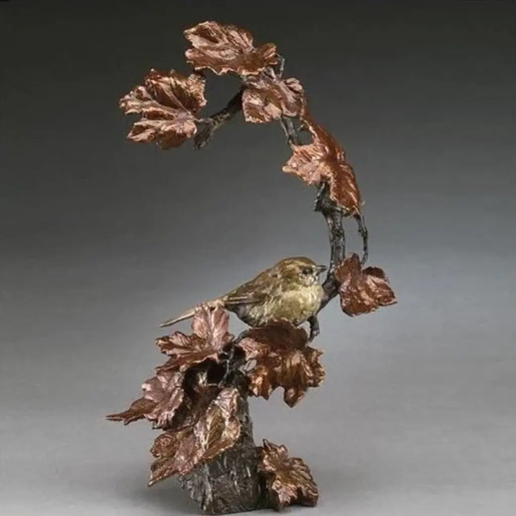 The "Autumn''s Return" Bronze Bird on Branch Sculpture by acclaimed designer Mark Hopkins celebrates the rich, warm floral hues of fall in evocative detail and unique gravity-defying style. An intricately textured little bird sits among the changing autumn leaves, rendered in the finest bronze available and finished with a very special "hot patina" technique in which chemical solutions are applied to reveal deep blends of natural and metallic hue. Express your love for the beauty of nature and enhance any space with organic flair, or give it as a thoughtful gift for a nature-loving friend or family member. Crafted with pride in the USA. Internationally renowned American artist Mark Hopkins creates bronze sculptures that have thrilled collectors and casual art fans alike for more than two decades. Mark Hopkins'' unique balance of organic inspiration and singular contemporary design has been called "bronze in motion" for its fluid look, which often appears to display natural beauty in defiance of gravity. About Mark HopkinsMark Hopkins takes his inspiration for every facet of life on Earth, from the majesty of wildlife to mankind''s interaction with nature, and produces limited-edition pieces that evoke a sense of awe and respect for the mysteries and loveliness of the world around us. Collectors of his work include Barbara Mandrell, Clint Eastwood, Bill Clinton, Colin Powell, George and Barbara Bush and a host of other luminaries and corporations including the National League Association of Baseball Club Owners, the Atlanta National Golf Club, Humana, Coca-Cola and others. Each Mark Hopkins sculpture is crafted with pride in the USA. Captivated by form and design, Mark has personally created a signature style of vibrant vitality resulting from decades of study. Encouraged by parents and teachers from an early age, Mark''s unique talent developed alongside his technical skills of sculpting and casting. As an artist, Mark is constantly challenging himself to render the rich beauty of life and the deep emotion of the human soul into flowing sculptural form, noting "I strive to express beyond the image, to catch spirit, to reveal deeper emotions, and to share joy. "About the Production ProcessFrom the artist''s hand to the final polishing stages, many intricate steps go into the creation of a limited edition bronze sculpture. First the reproduction mold is made in which layers of silicone rubber and plaster are delicately applied to the original work. Then hot wax is poured into the reproduction mold to form an exact replica of the original sculpture. When the wax replica is removed from the mold, it is then inspected and refined or "chased" by hand to remove any imperfections that may have occurred in the reproduction process. Next, ceramic cup and wax sprues, or gates, are added which later will help channel the molten bronze into the shell to create the sculpture. The next step is creating the ceramic shell by alternately dipping the wax replica over a period of several days into a vat of liquid slurry, then a vat of silica crystals. The shell is then set to dry, and the process repeats until the shell has reached the appropriate thickness and strength. The finished shell is placed in a high temperature oven that melts and removes the wax (the traditional "lost wax" method). The hardened or "fired" shell is secured, so the molten bronze can now be poured into the wax impression.