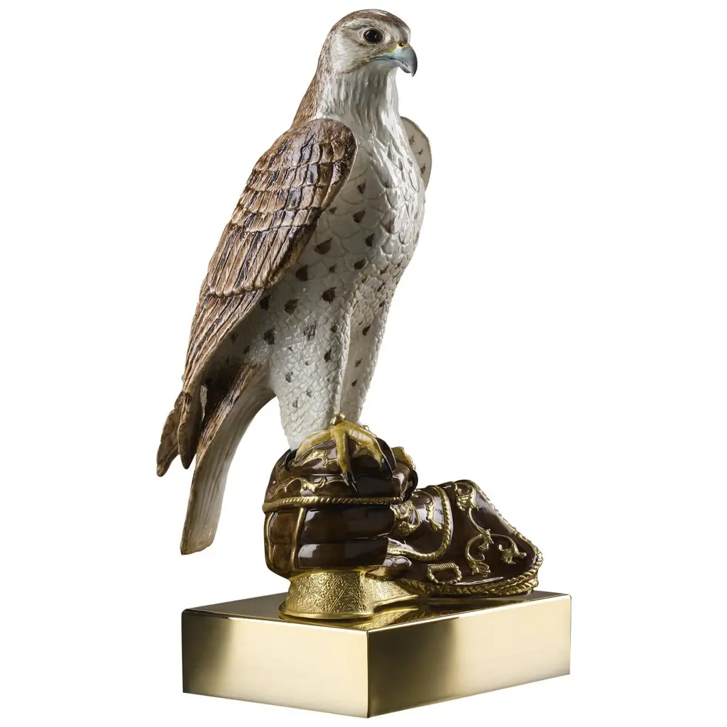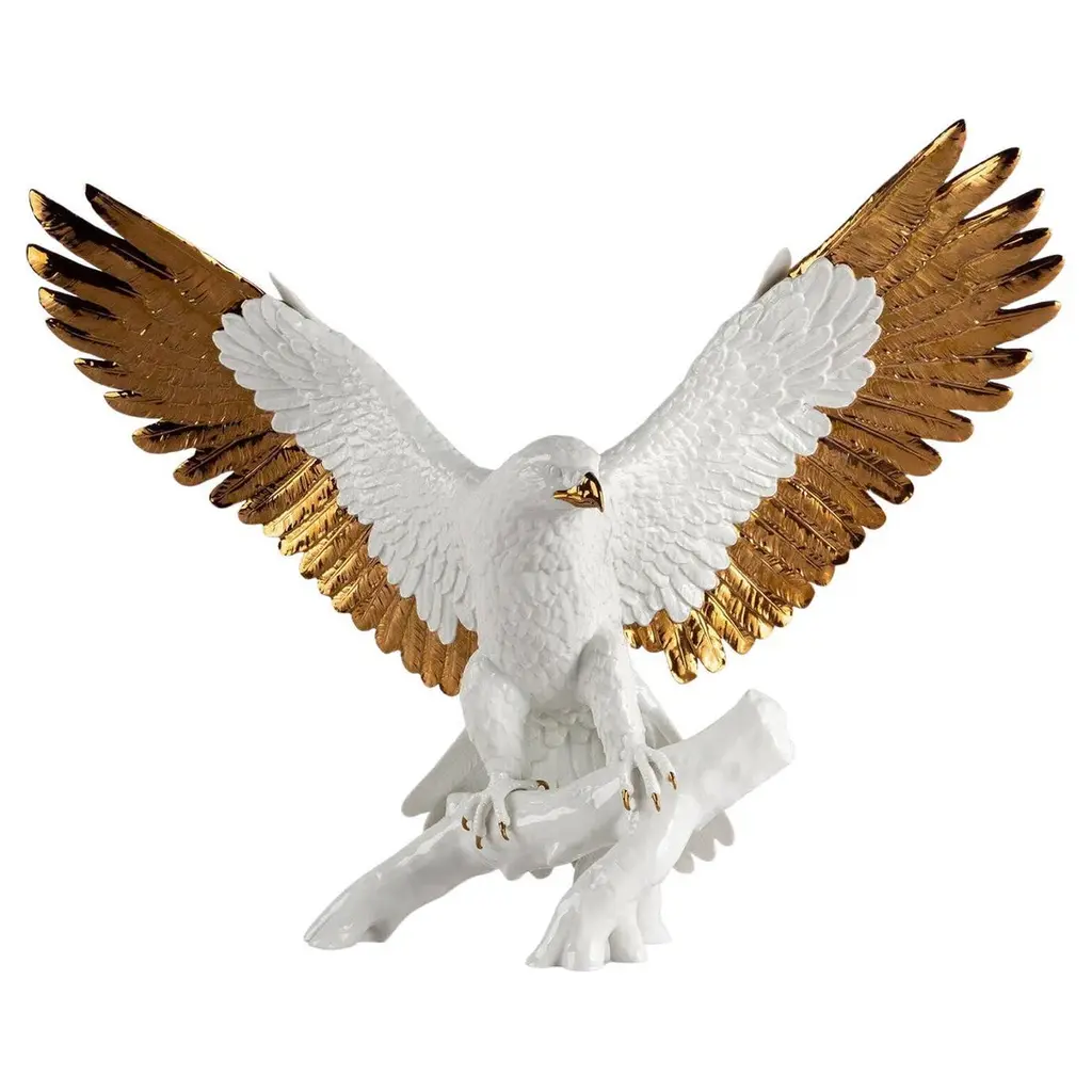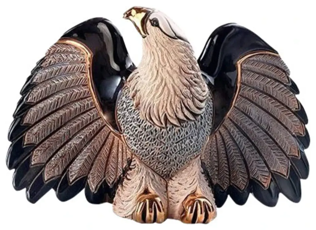 Piece launched in 2012Hand-carved ceramic eagle sculpture.. each piece uniqueWeight is approx. 3. 5 lbs. Accented with rich gold trimHand-enameled colors individually fired for each hueArtistic style influenced by Dali, Picasso, and MiroA work of South American ceramic art, the Bald Eagle Sculpture from De Rosa Collection brings the bold beauty of the wild bird to your home in stunning detail and unique style. About the De Rosa CollectionThe De Rosa family has been intimately involved with ceramics, since 1945 when the founder, Jorge De Rosa attended the Argentinian National School of Ceramic Design. These South American ceramic works of art have been decorating homes and offices world wide since that time. Although the process has changed somewhat over the years the elegance and sophistication of the De Rosa Collection figurines has been secure. From the vibrant blue dolphin sculptures to the sleek black panther figurines, each piece in the De Rosa Collection is a unique piece of fine ceramic. Their artists take inspiration from surrealist art and South American artists like Dali, Picasso, and Miro to create these stunning ceramic wildlife figurines. Each figurine is first hand carved by talented artisans. Bold enamel coloring is then applied, again by hand, with a firing of each piece with each new shade applied. The figurines are then finished with a lustrous 24k gold or platinum trim giving each whimsical wildlife figurine its singular signature of elegance. Because of this exceptional process no two pieces from the De Rosa Collection will be exactly alike.