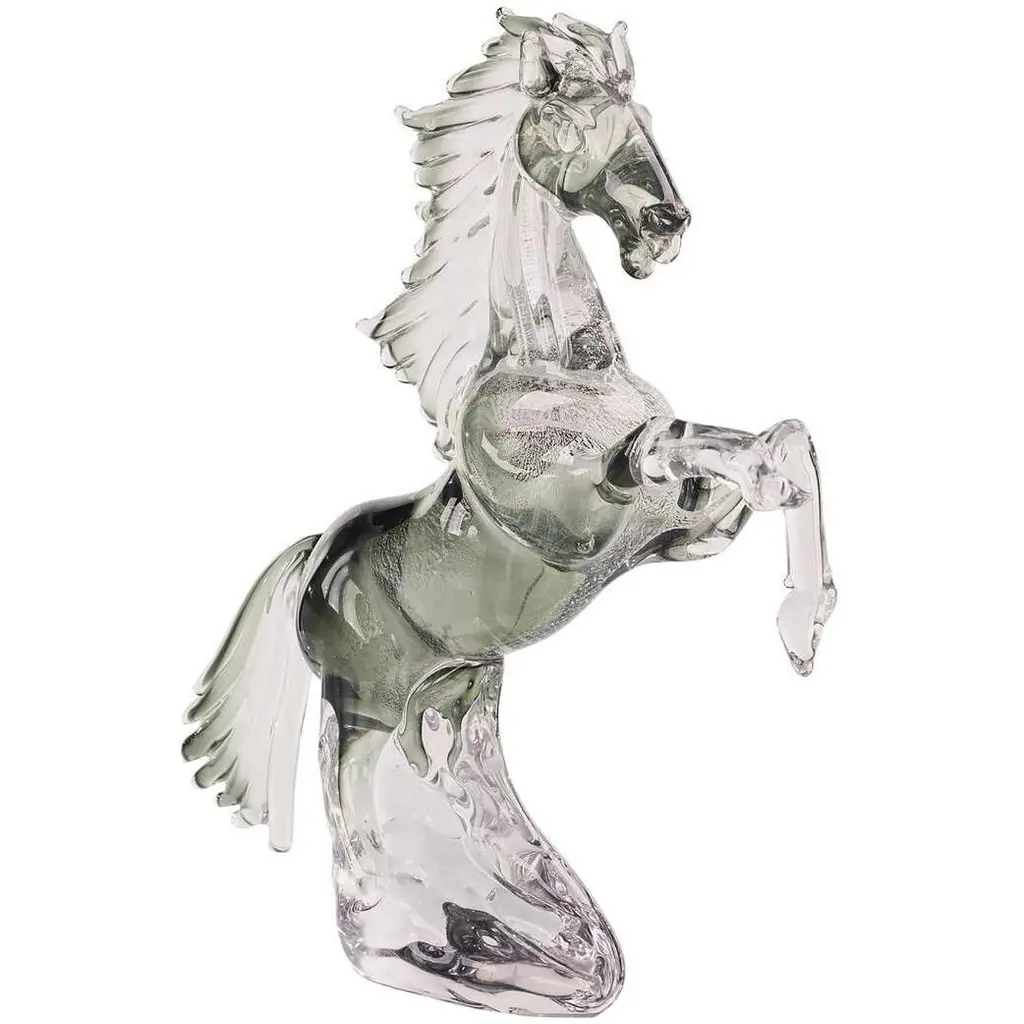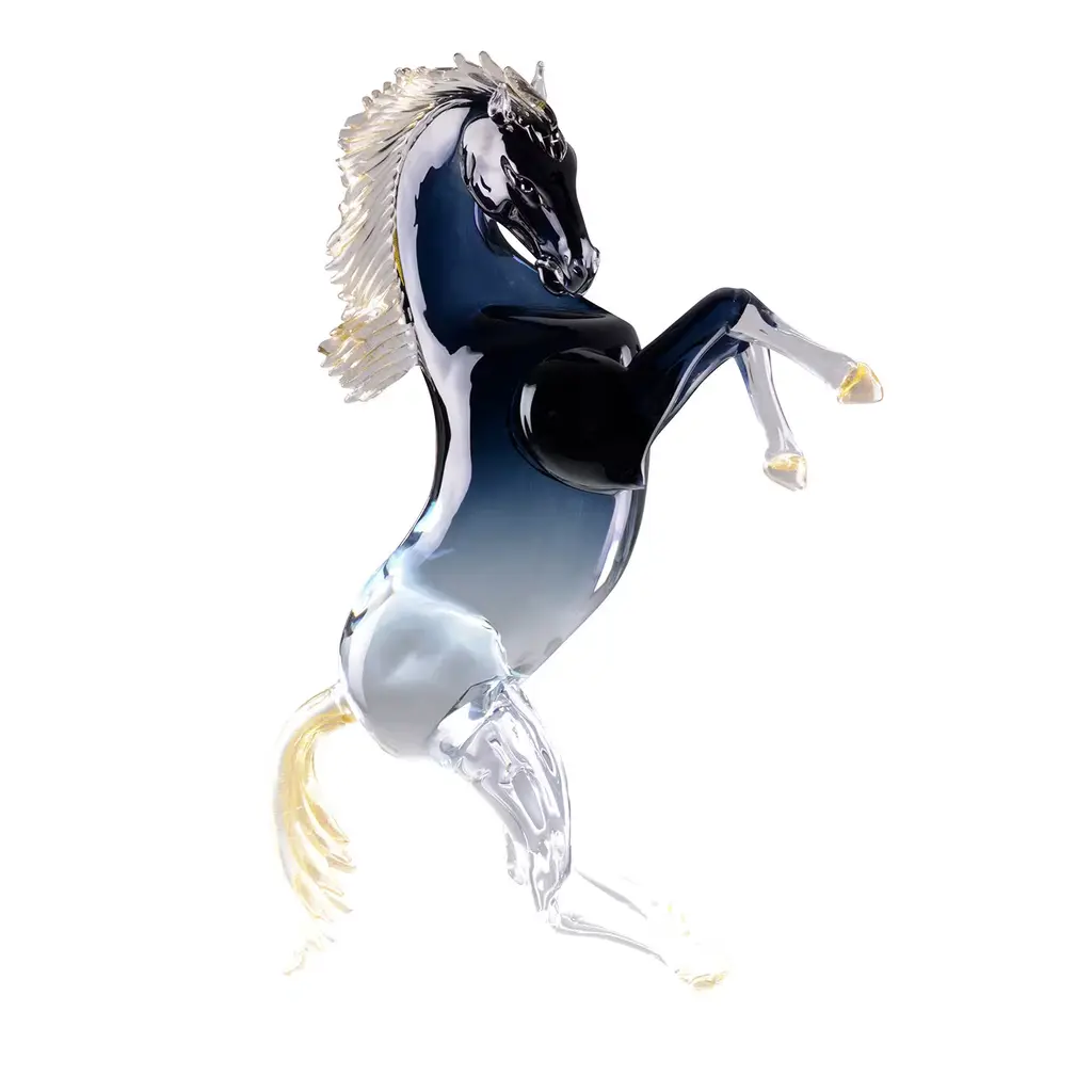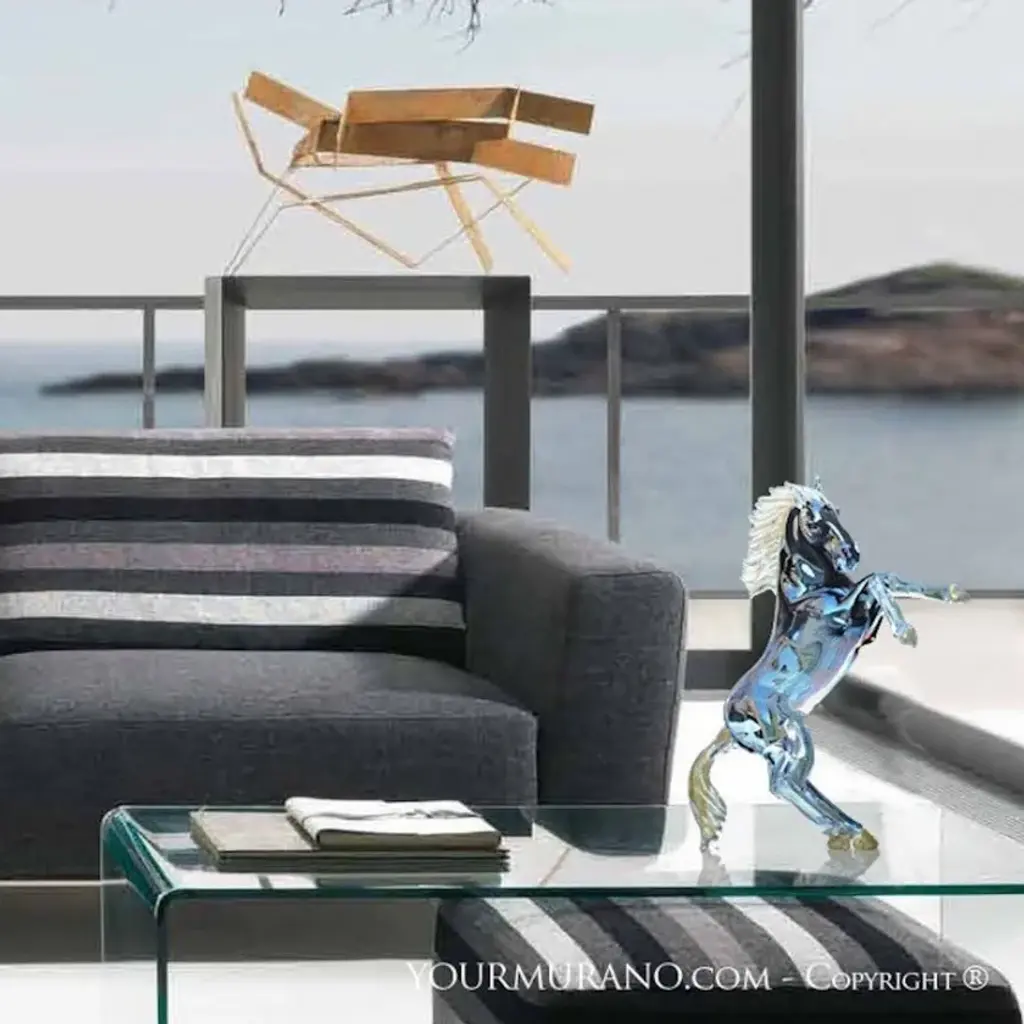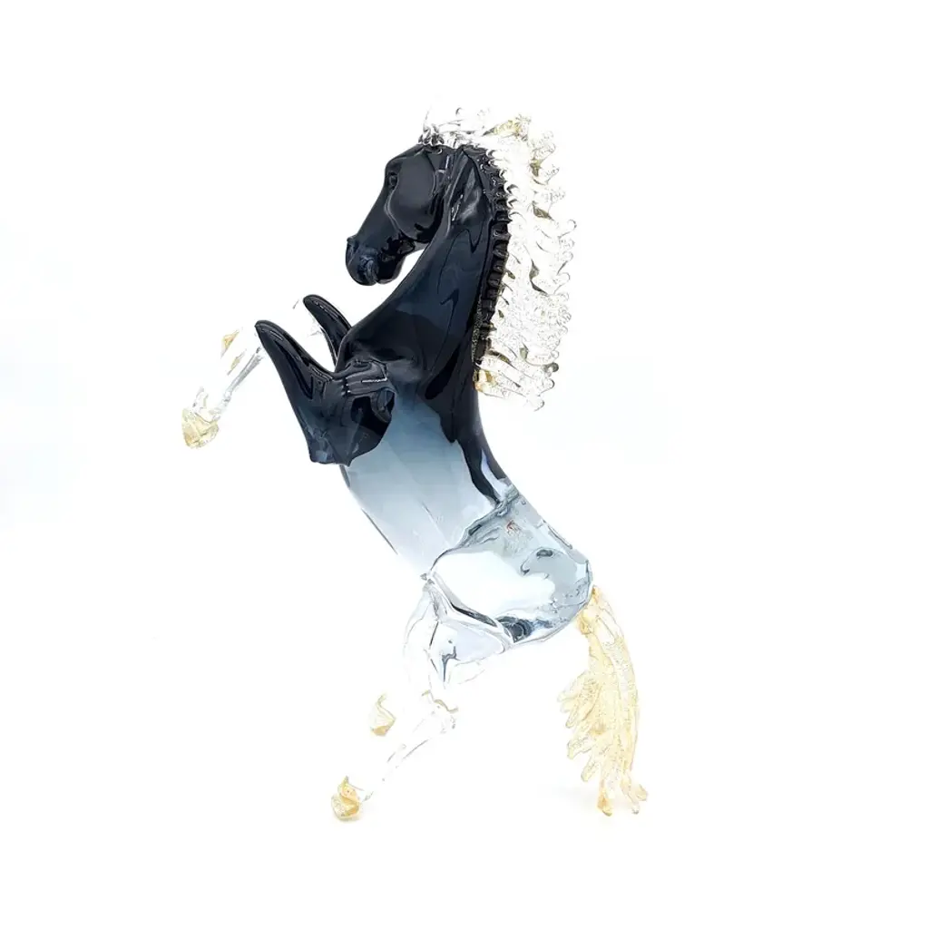 BALIO is a murano glass sculpture representing a dark blue horse with gold leaf detailing. This outstanding hand-crafted creation is perfect for any home decor solutions. Fearlessness of expressing your own artistic flair and freedom to design your home décor as you wish. Fearlessness and freedom as the key characteristics of these incredible horse-shaped sculptures. From sinuous vigorous designs to more essential and simple ones, we offer you a wide choice of glass sculptures from which you can choose. Don't be afraid to dare and display one of these distinctive items in your living room or in your hallway, you will impress anyone with your breathtaking style! A style that you can achieve only with original decorative objects Made in Italy. All products are handcrafted and prime production quality. Insubstantial variations in shape, size, colour, small imperfections and/or tiny air bubbles in the glass are not considered defects; they are inevitable and are typical of manual production of the glass and characterize handcrafted production.
