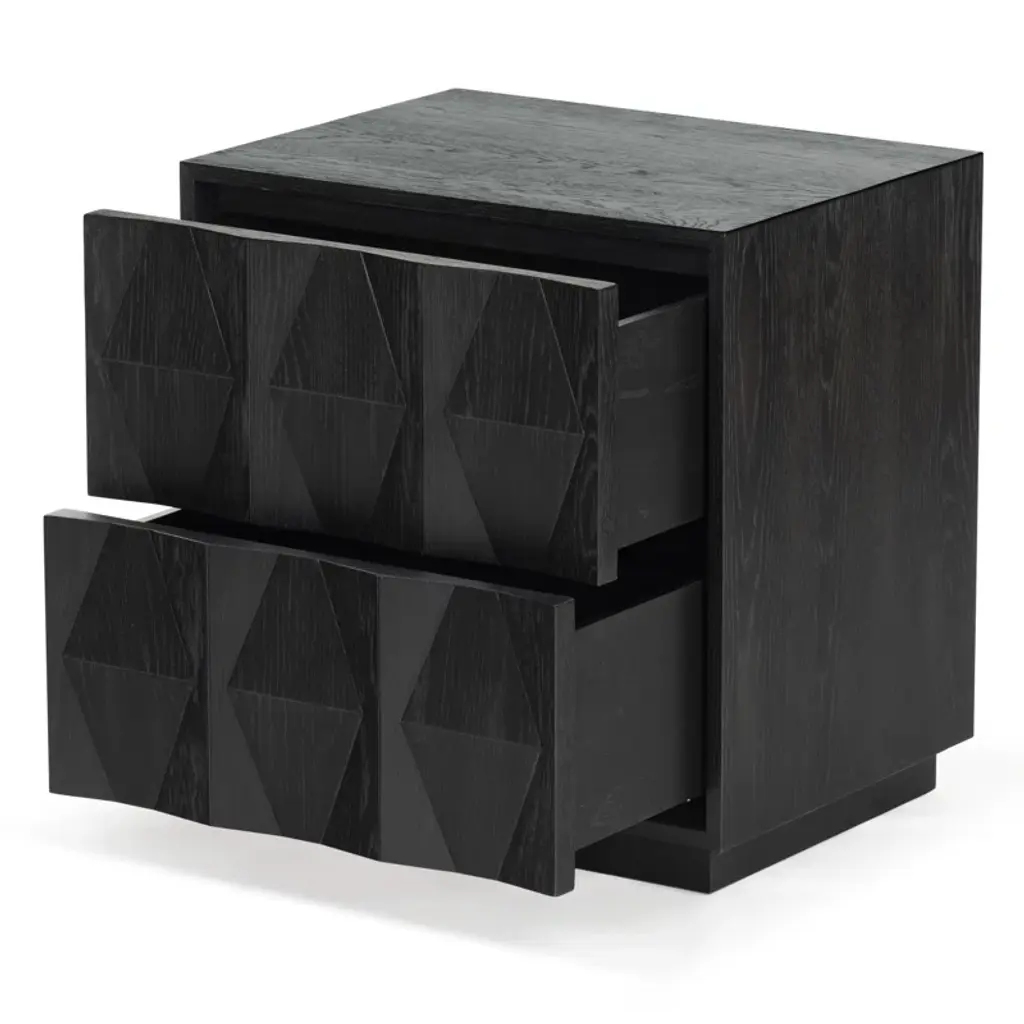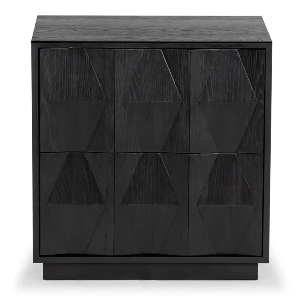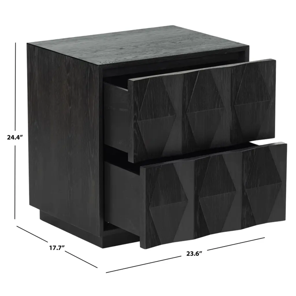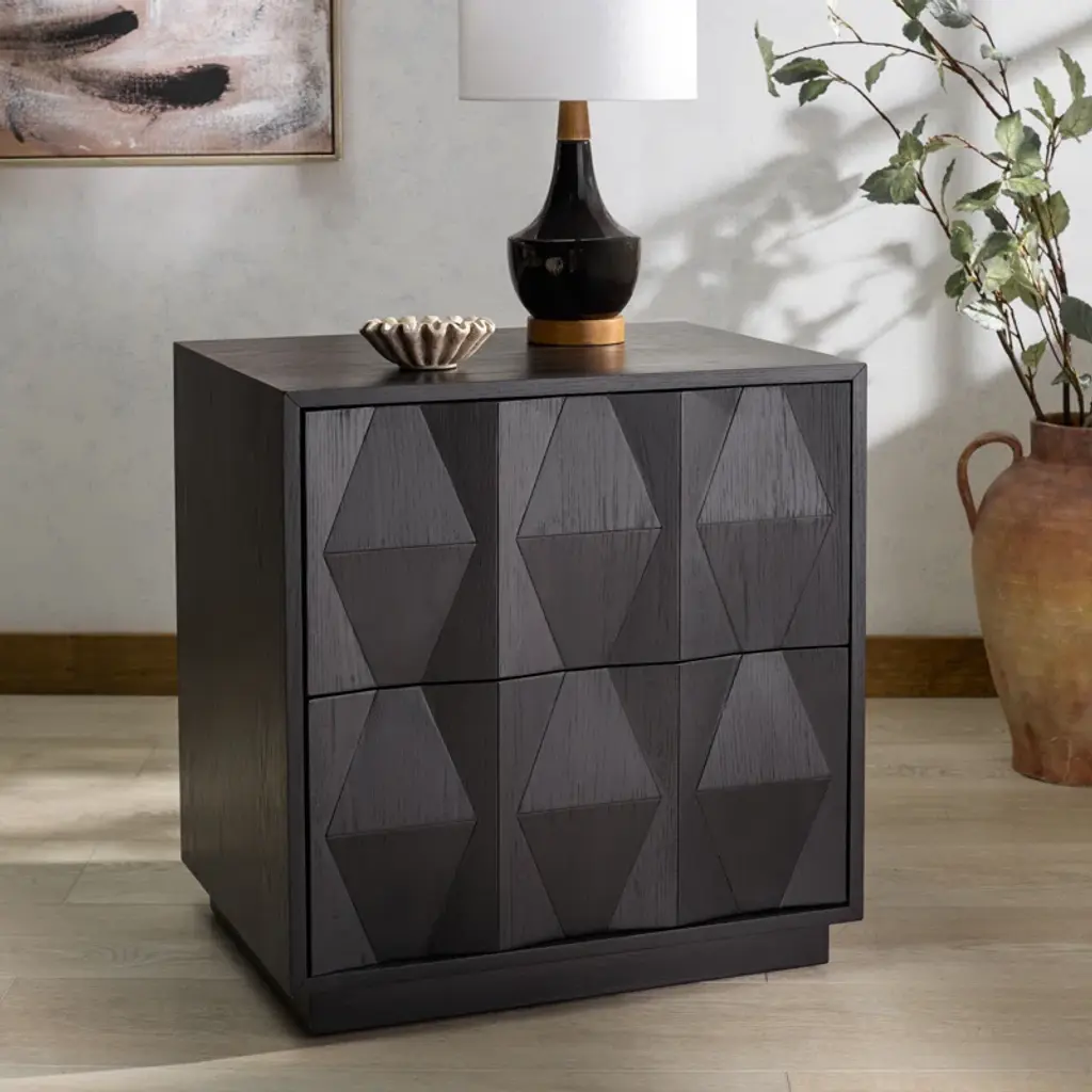 Discover the elegance and practicality of the Riabelle Wood 2 Drawer Nightstand. Crafted from robust rubberwood and graced with oak veneer finishing, this nightstand in a rich color offers a sophisticated ambiance to your bedroom. The unique geometric design on the drawer fronts adds an artistic flair, making it a striking piece alongside your bed. With ample storage space within its two smoothly gliding drawers, this nightstand keeps your essentials organized and within reach. The warm, natural tones and sturdy construction make it a reliable and stylish choice for your furniture collection. Enhance your bedroom's decor with this tasteful and functional nightstand from Riabelle.