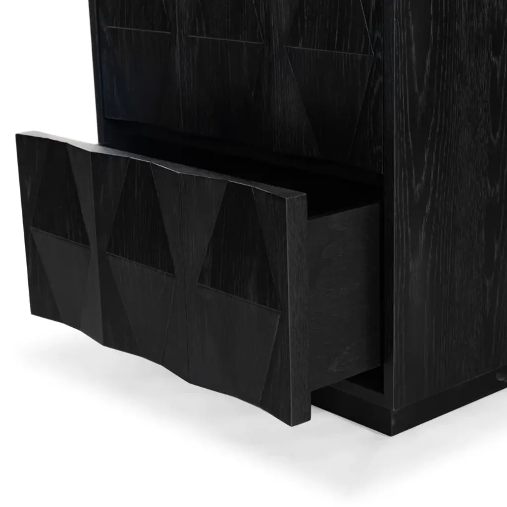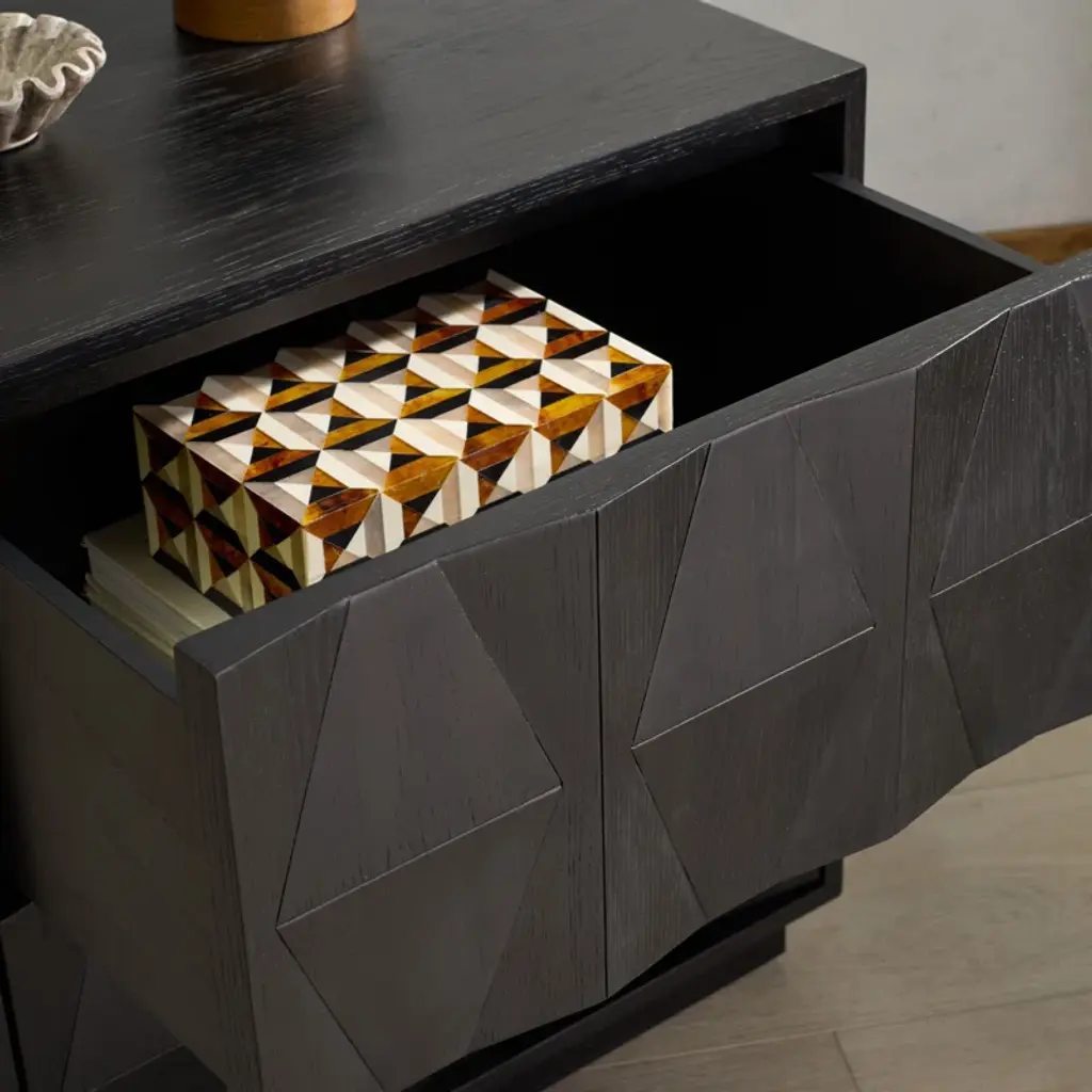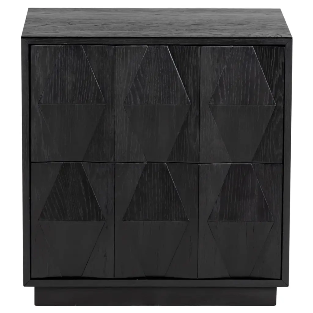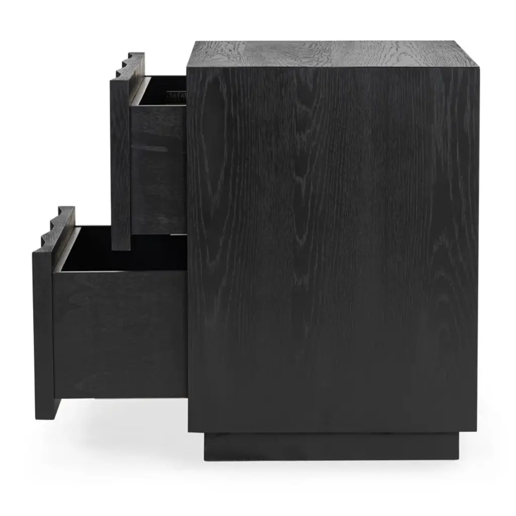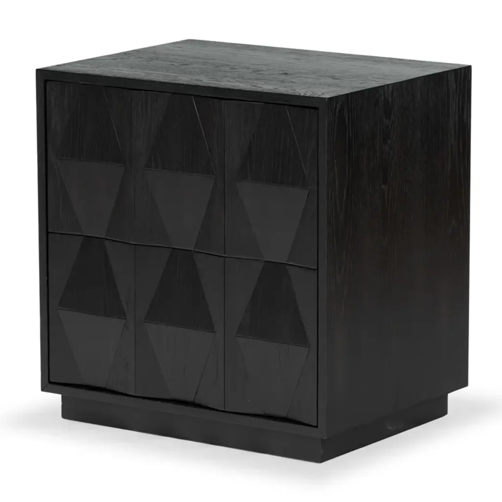 Discover the elegance and practicality of the Riabelle Wood 2 Drawer Nightstand. Crafted from robust rubberwood and graced with oak veneer finishing, this nightstand in a rich color offers a sophisticated ambiance to your bedroom. The unique geometric design on the drawer fronts adds an artistic flair, making it a striking piece alongside your bed. With ample storage space within its two smoothly gliding drawers, this nightstand keeps your essentials organized and within reach. The warm, natural tones and sturdy construction make it a reliable and stylish choice for your furniture collection. Enhance your bedroom's decor with this tasteful and functional nightstand from Riabelle.