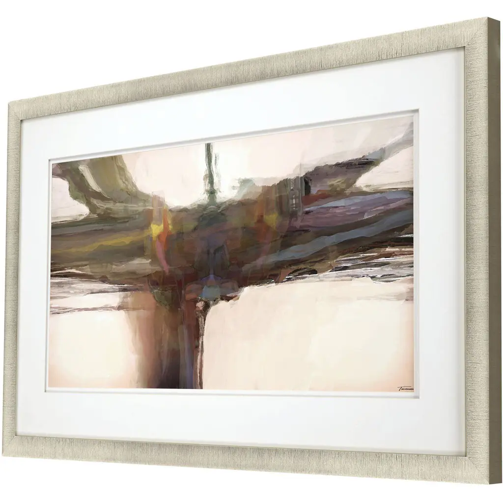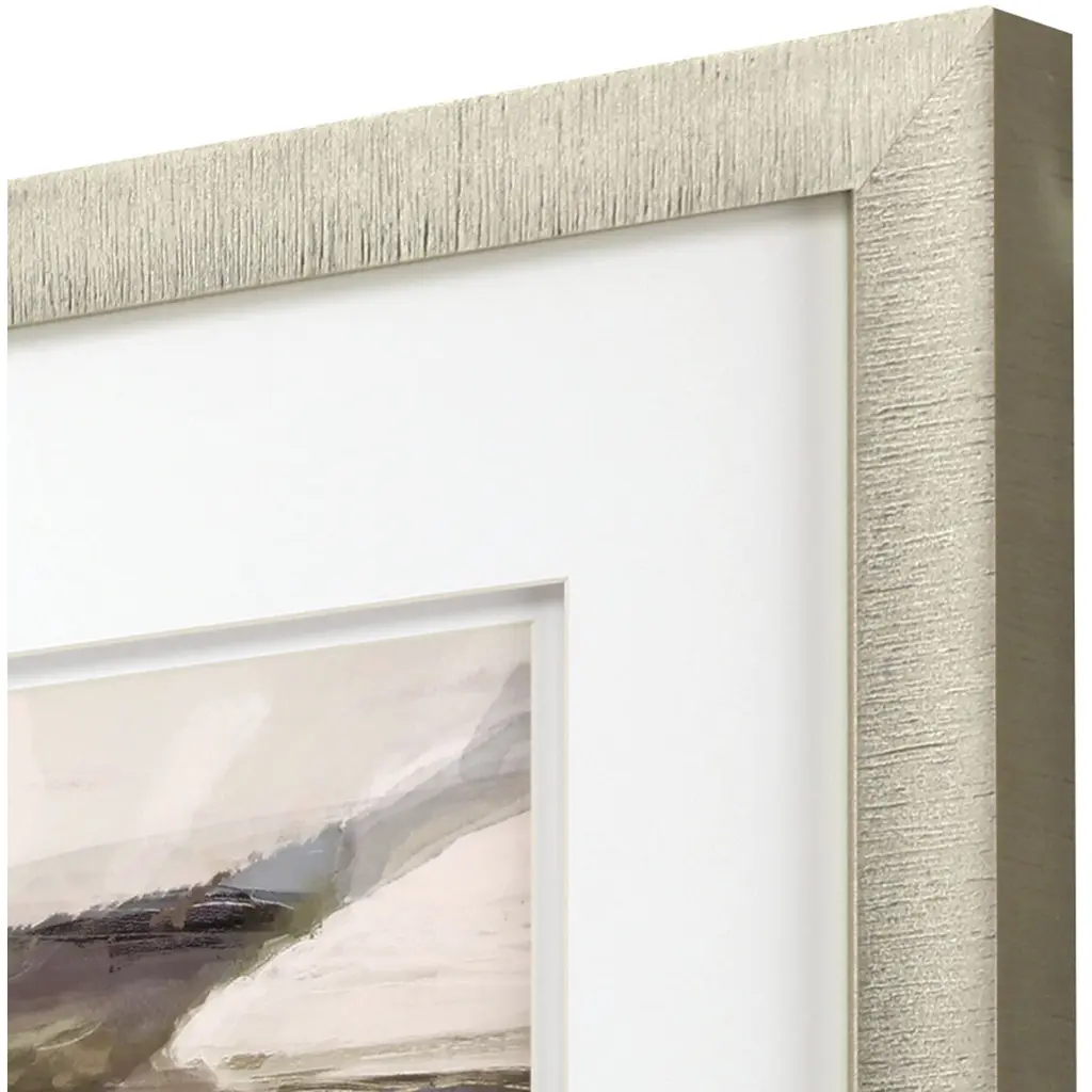 Geometric abstract forms are double-matted in white with raised matting. Framed in a champagne gold block contemporary moulding.