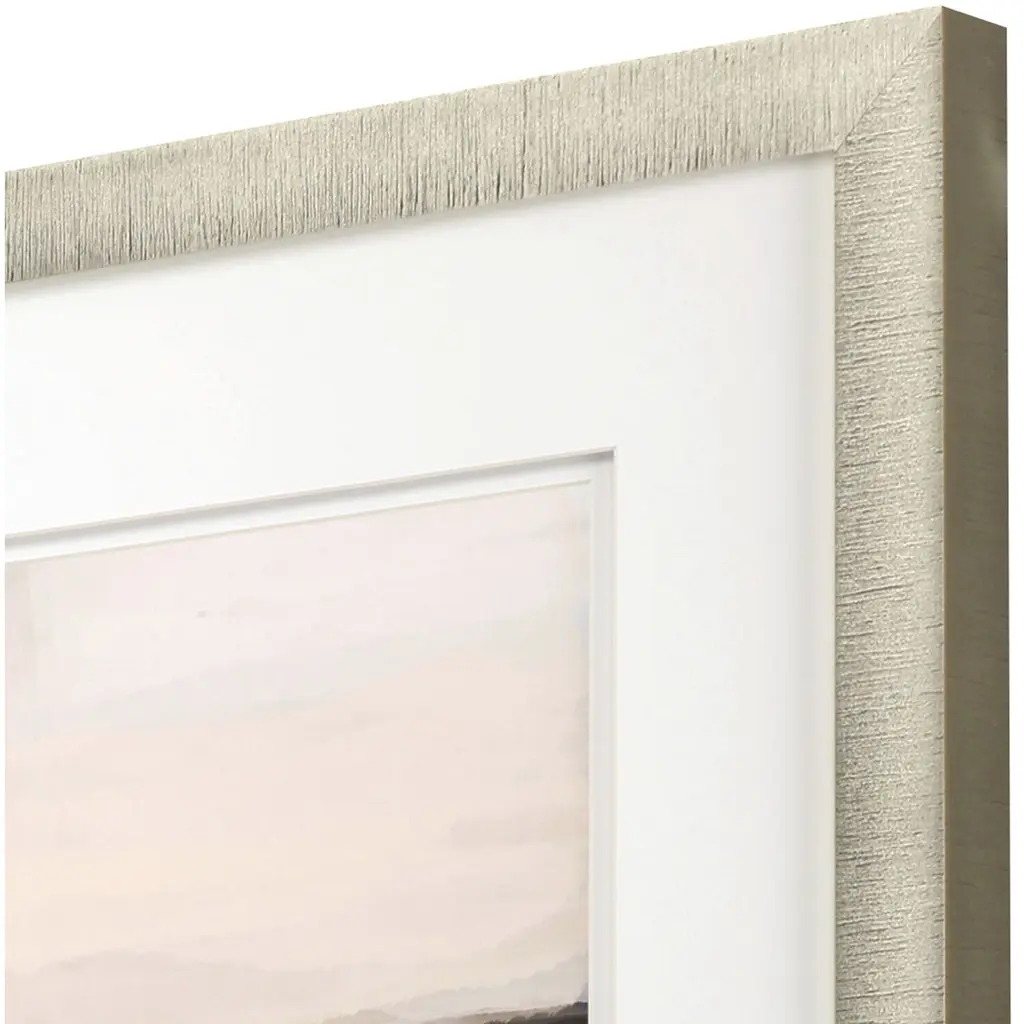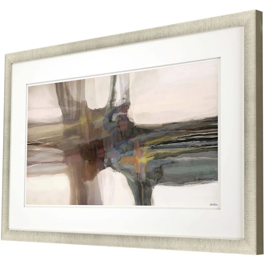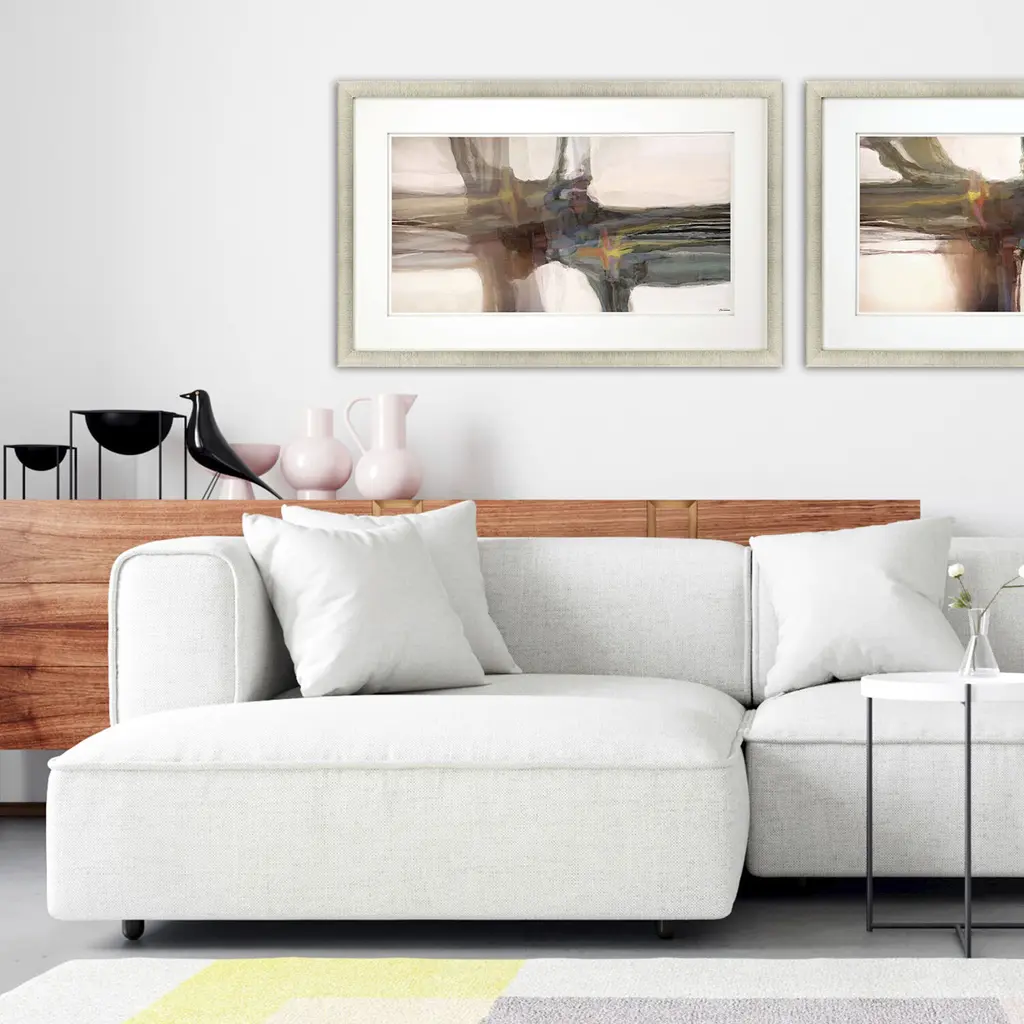 Geometric abstract forms are double-matted in white with raised matting. Framed in a champagne gold block contemporary moulding.
