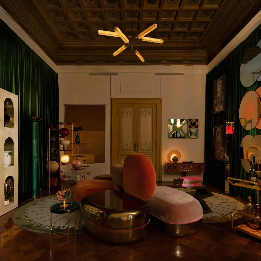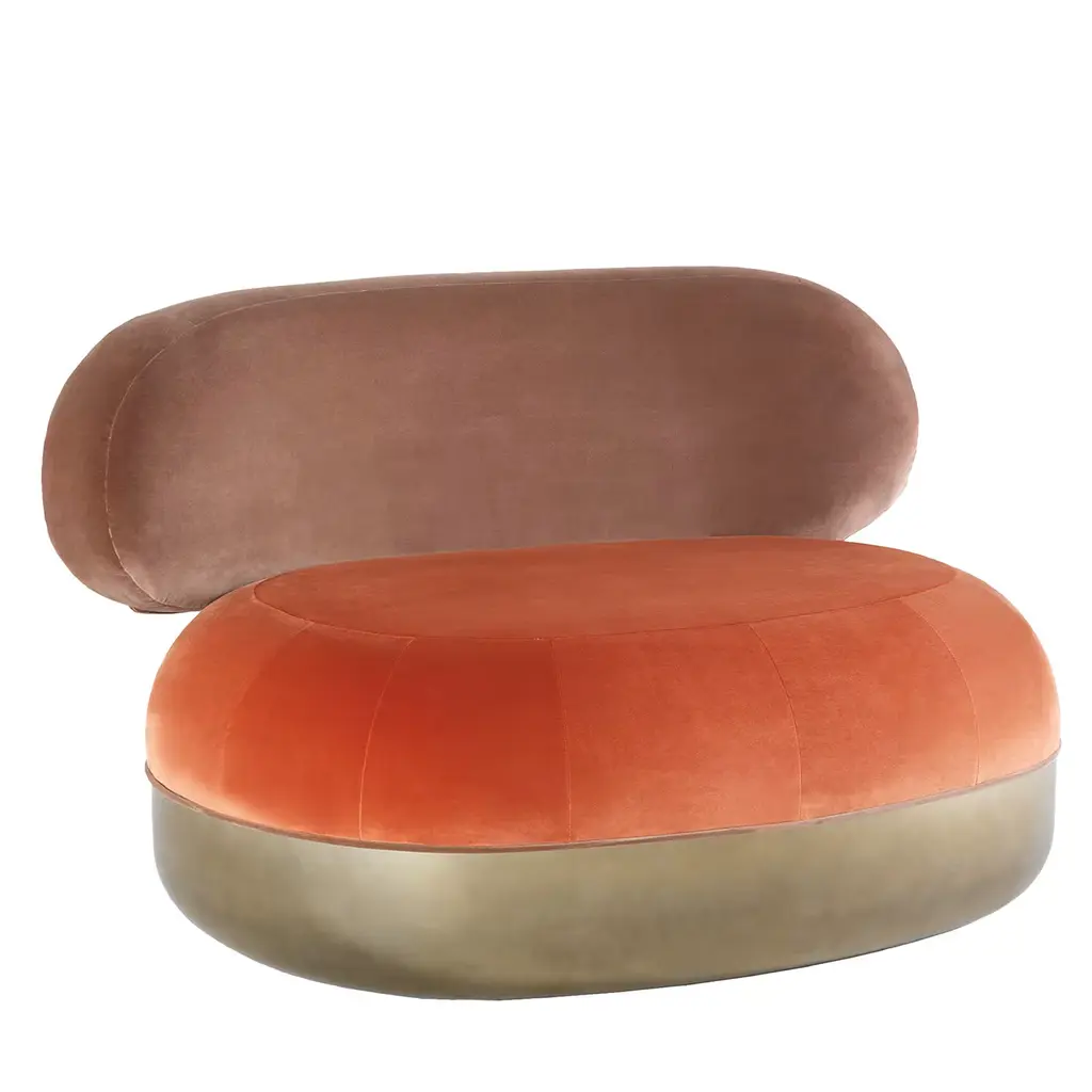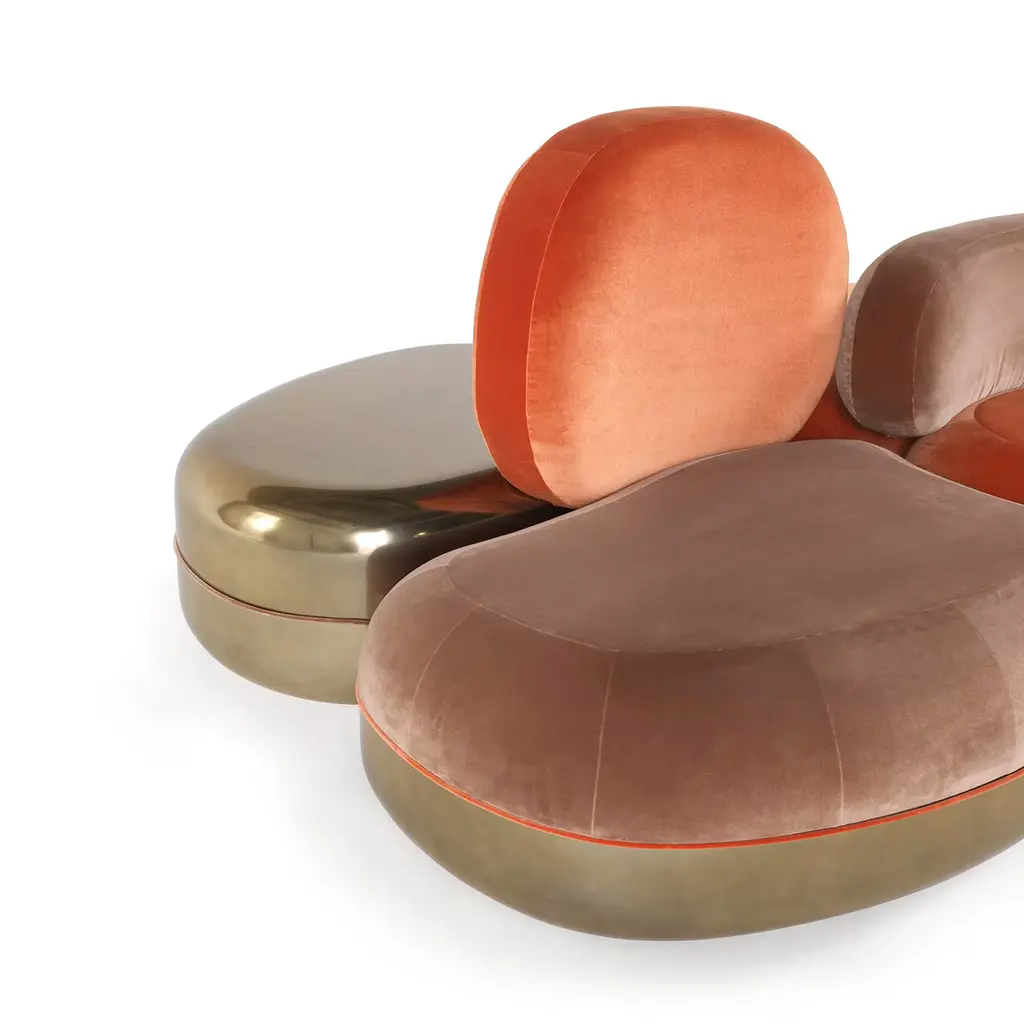 "Between sculpture and design, Belmer is a wonder-object suggesting a newly discovered sociality. With its big dimension, it goes against the trend of miniaturization, appearing as an alien organism, coming from a galaxy where everything is yet to be discovered." Sofa with base in CNC machine-shaped solid wood with glossy patinated gold finishing. Seat and back with structure in multilayered wood and high-density polyurethane foam at different densities upholstered in the velvet of two contrasting hues: Coral - Pink. Variation Details: Sofa with base in CNC machine-shaped solid wood with glossy patinated gold finishing. Seat and back with structure in multilayered wood and high-density polyurethane foam at different densities upholstered in the velvet of two contrasting hues.