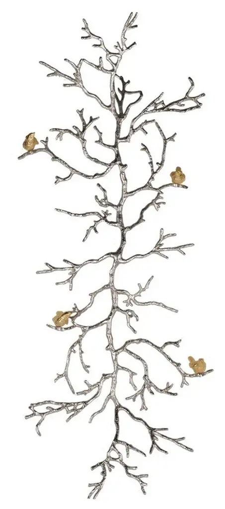 Brimming with rustic charm, this iron wall decor sized 17x5.5x22" features a silver branch with two birds sitting apart. Echo the elegance of this piece by adorning a neighboring wall with calming pastoral paintings sure to set a soothing tone in your master suite.Includes: single wall Sculpture only
