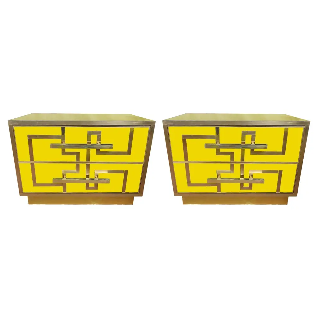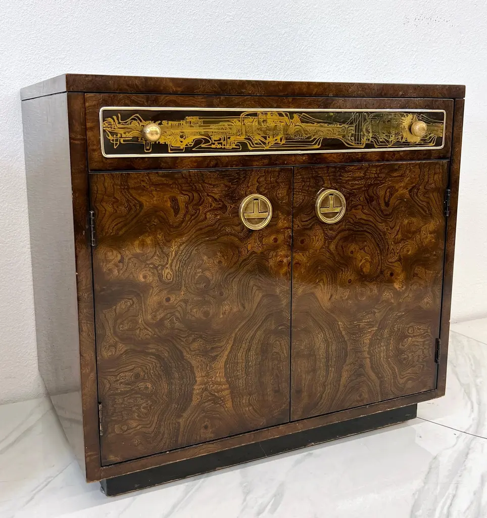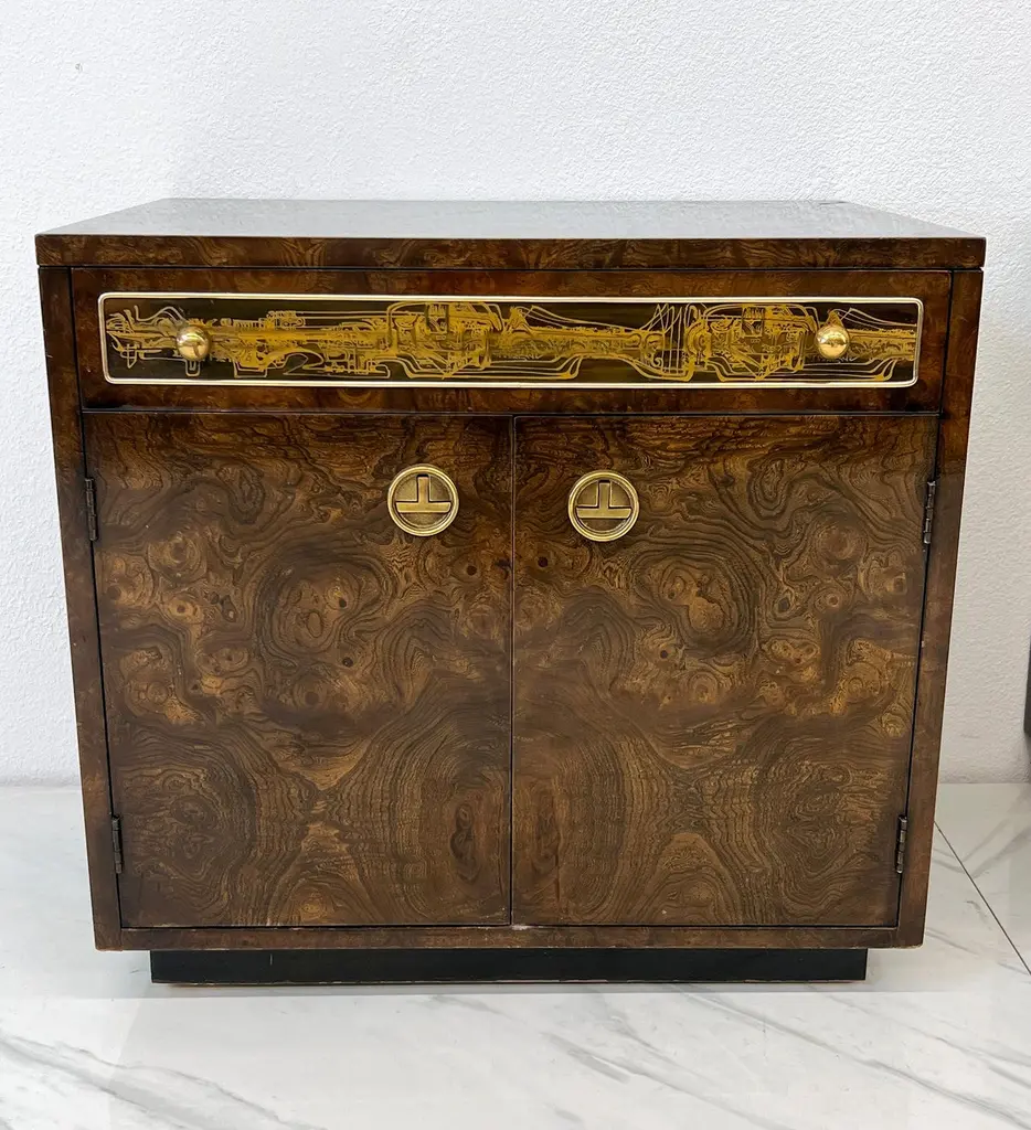 Feast your eyes on this absolutely stunning pair of Bernhard Rohne acid-etched brass and amboyna burl nightstands for Mastercraft. These aren’t just bedside tables—they’re functional sculptures with a side of opulence.Let’s talk details. The rich, dark amboyna burl wood? Decadent. The ebonized plinth base? Baughman-approved sophistication. The round, nearly flush brass handles? Minimalist, yet oh-so-tactile. But the real showstopper? That acid-etched brass plate sitting front and center, swirling with psychedelic patterns in a spectrum of deep browns to luminous golds—like a Philip and Kelvin LaVerne fever dream. Also let’s not forget the solid brass sphere knobs crowning this masterpiece; because, obviously, these deserve a regal finishing touch.Now, we won’t lie—these beauties have seen some things. The tops have a few battle scars, and the wear throughout tells a story of a life very well-lived. But honestly? That just adds to the mystique. Because perfection is overrated, but character? Timeless.For the collector who craves statement pieces with soul, these Bernhard Rohne nightstands are ready to add a little magic to your space.