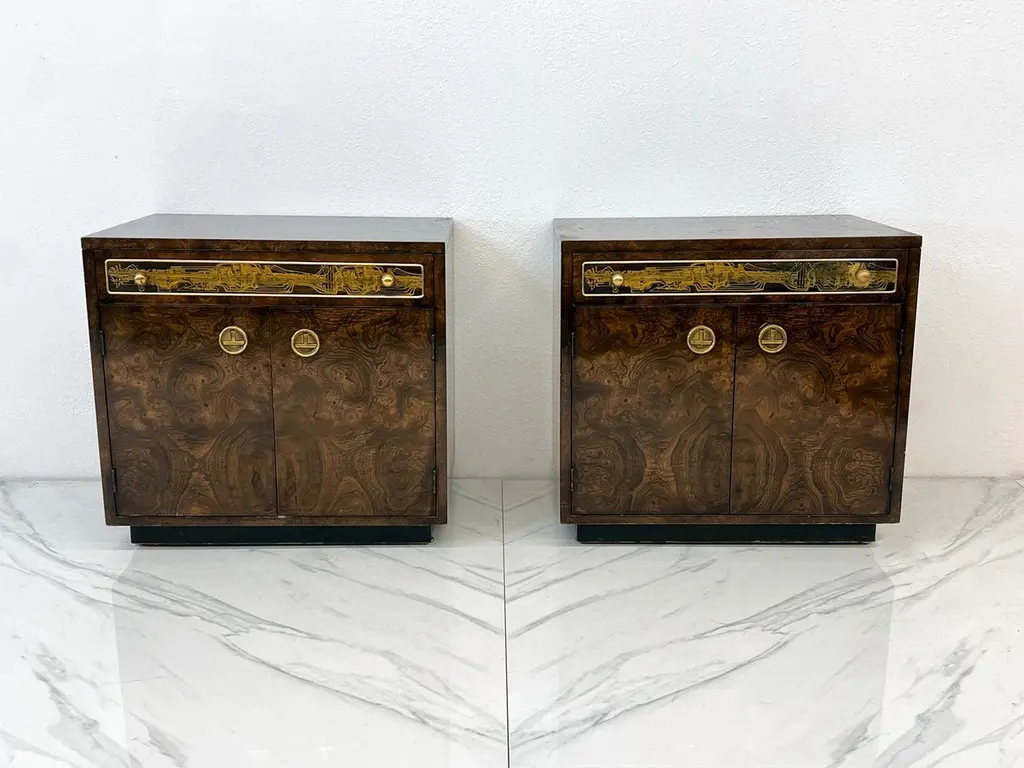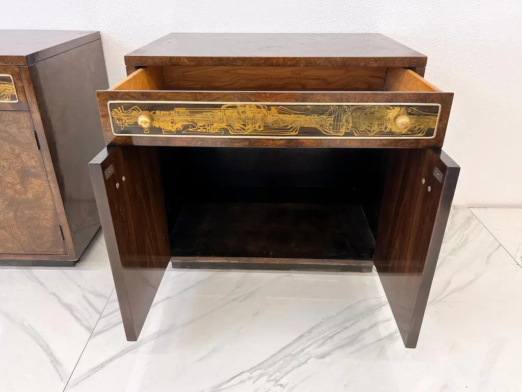 Bernhard Rohne Mastercraft Burl And Acid Etched Brass Nightstands, 1970's