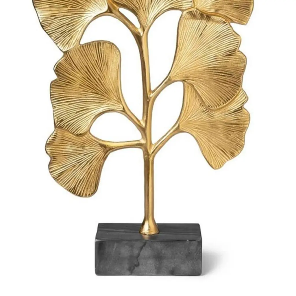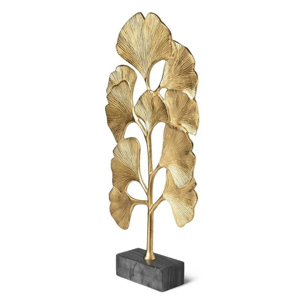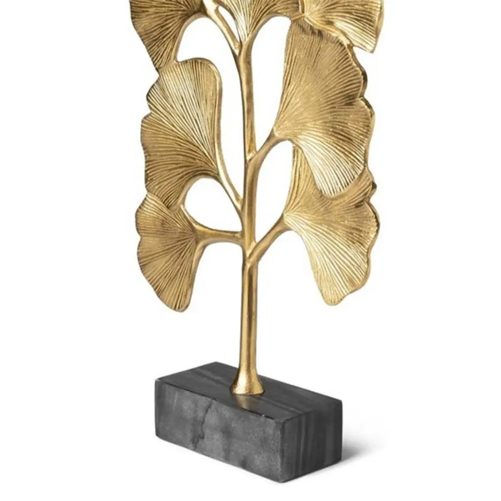 Sculpture Biloba High with metal structurein gold finish and with grey marble base.