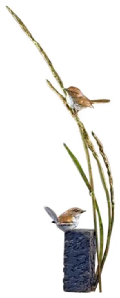 This remarkable Bird Pair and Branch Bronze Sculpture "Tree for Two" by Mark Hopkins features a delicate pair of wrens resting on a tree branch adorned with vibrant fall leaves. Kind of make you wonder what they are chatting about! A truly special work of art designed for the bird lover and for collectors of Mark Hopkins sculptures. Created by Mark Hopkins using the lost wax process Limited Edition of 25 pieces Handcrafted and patinaed Released in 2015 Made in the USA