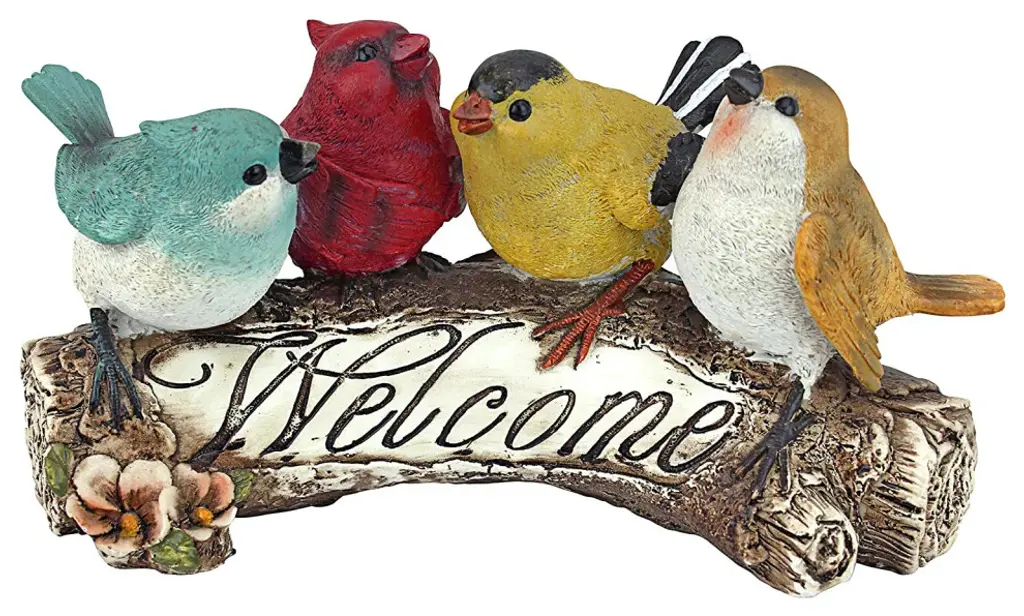 Features:Our bird welcome sign statues are sculpted 360 degrees for a even "chirpier" cheerful welcome to greet guests to your home and gardenPERFECT HOUSE WARMING GIFT - Give these adorable, brightly colored song birds as the perfect house warming gift with a little bit of garden hospitality!HIGH QUALITY FIGURINES - Hand-cast using real crushed stone bonded with durable designer resin, our multicolored birds are topped with a UV resistant finish for outdoor useDESIGN TOSCANO GARDEN DECOR - Exclusive to the Design Toscano brand, this four bird statue will be the perfect accent for front yard lawn, garden wall or home entrywayOur Acorn Hollow collection birdy welcome sign sculpture measures 4. 5"Wx10. 5"Dx5"H 2 lbs.Cast in quality designer resinHand painted
