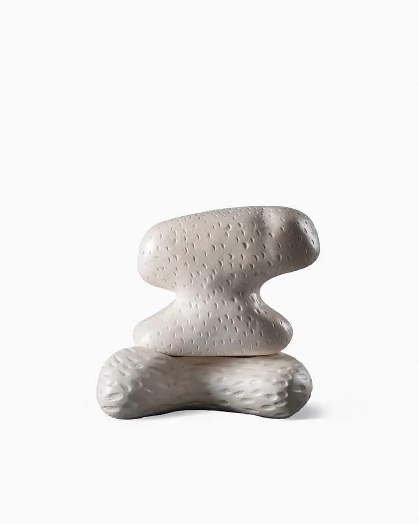 Sculpture composed of two elements made by slip casting in white clay. The still-fresh surface is hand-scratched. Brown engobe beneath a chalky matte white glaze.ll Bitossi ceramics are entirely handmade by our artisans at every stage of the production process.Presented in 2022, the collection consists of five large-scale sculptures. The forms evoke organic elements and decorative or chromatic details inspired by textures found in the Bitossi Archive. The fluid, soft, nature-inspired forms are crafted using slab-building and slip-casting techniques and finished with a range of surfaces from earthy matte tones to luminous gold and platinum glazes.Each piece retains visible traces of the artisanal process: corrugated cardboard impressions, rough hand-worked textures, and expressive fingerprints left by the sculptor, transmitting a powerful creative energy.Design by Faye ToogoodFaye Toogood (United Kingdom, 1977) has made sustainability, material research, and the fusion of different creative disciplines the defining features of her work. Her creations — whether garments, furniture, or artworks — are sculptural expressions that reinterpret the past through a contemporary lens.
