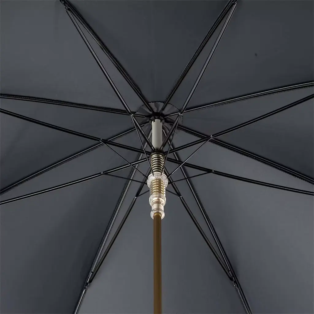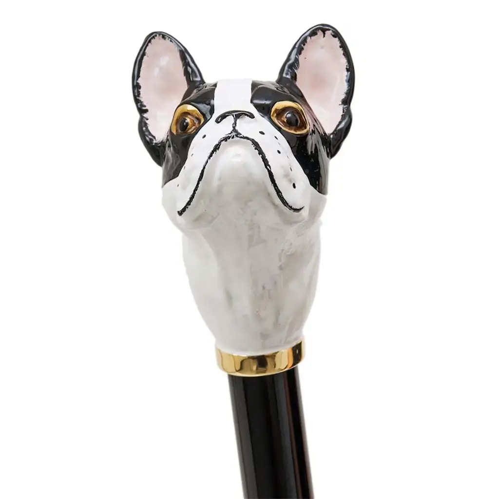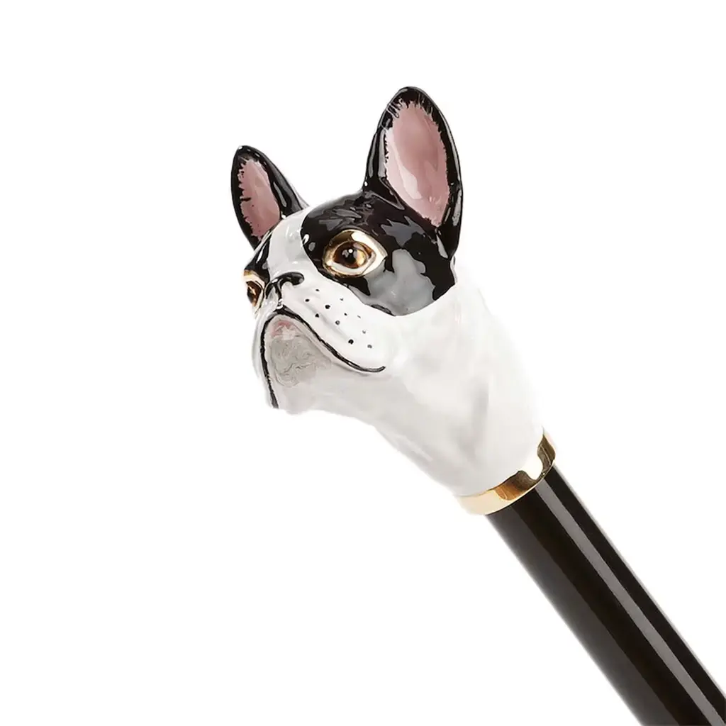 Designed and crafted in Italy by Pasotti, masters of luxury umbrellas, this black polyester umbrella boasts a 102-centimeter canopy for well-rounded downpour protection. On a golden shaft, the umbrella is topped with a brass and enamel French bulldog bust, for just the right touch of whimsy to brighten any rainy morning commute. Automatic opening.