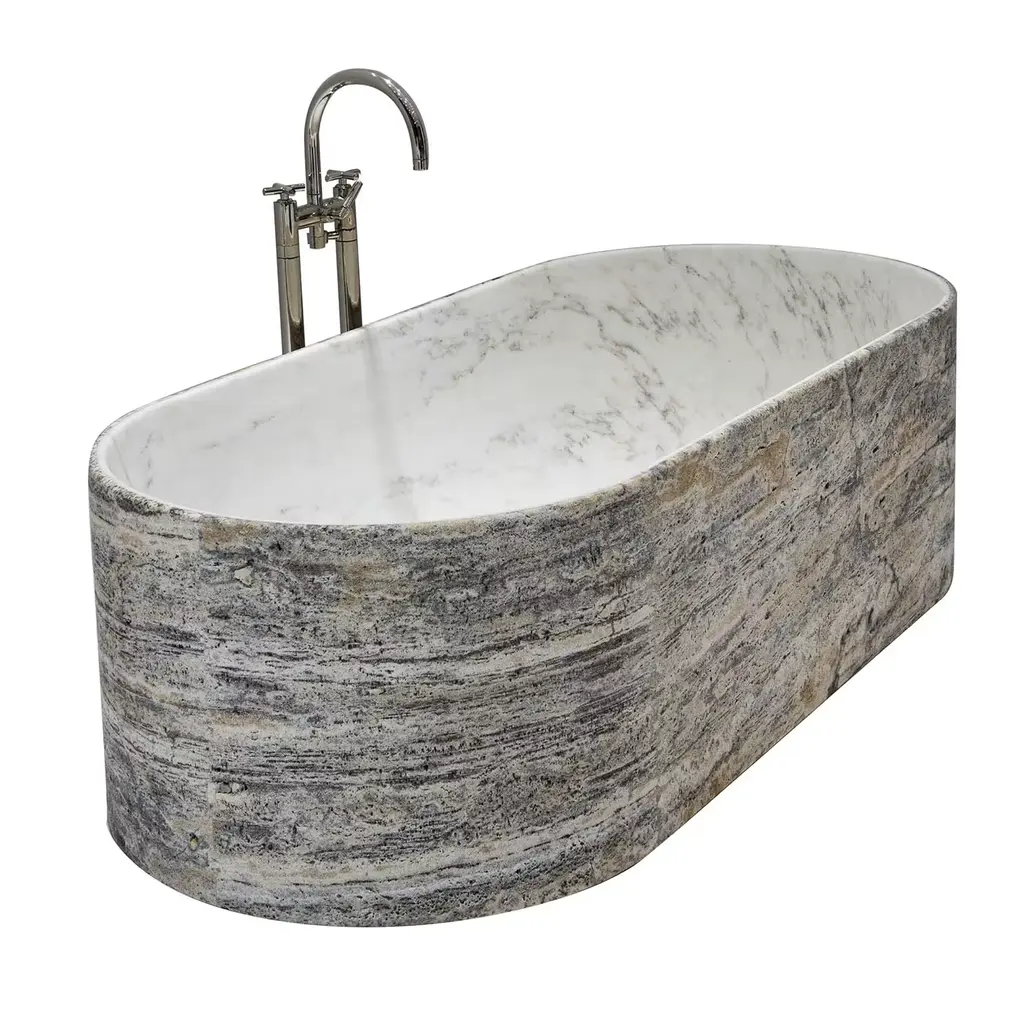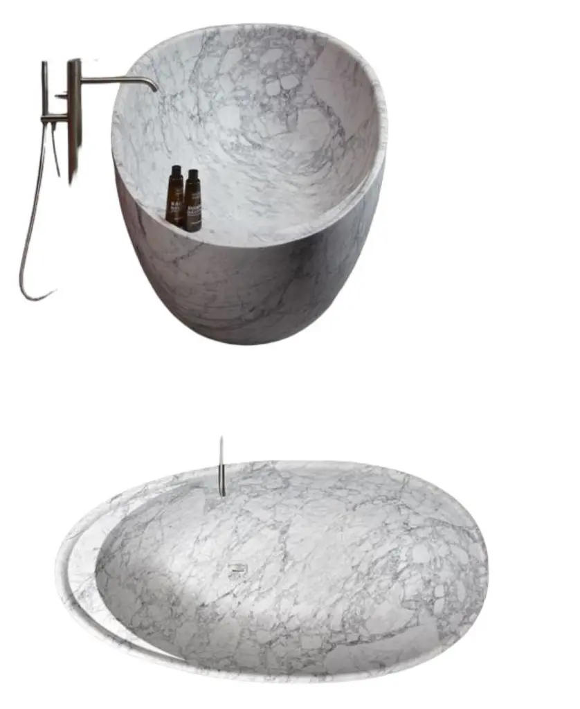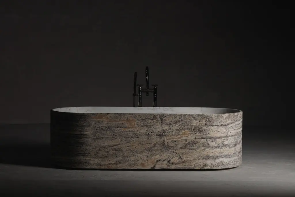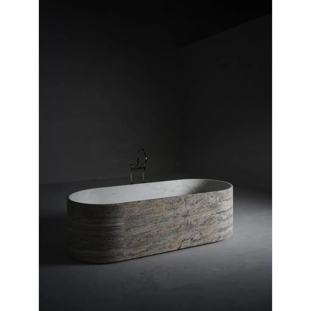 Blessed Tub Circle by Kreoo Designed by Christophe PilletDimensions: D 80 x W 180 x H 50.Materials: Travertino Silver and Bianco Del Re marble.Weight: 553 kg.Available in different marble and travertine options. Prices include a drain with a marble cover. For custom drain requests: technical details and price surcharge to be defined. Please contact us.The evolution of the Blessed collection maintains its aesthetic foundation unchanged. Now also available in a freestanding bathtub version, in elongated oval or rectangle, the range dedicated to the world of bathroom design by Christophe Pillet is characterized by the material contrast between the outer and inner surfaces, offered in two different types of marble. The result is an elegant antithesis, not only in color but also in the texture of the natural stone, with different veins and nuances meeting at the top edge, crafted to achieve a minimal and striking thickness. Bianco Carrara and Bianco del Re are the options dedicated to the internal silhouette of the tub, while the exterior can be customized in a wide range of marbles, travertines, and semi-precious stones.Kreoo: the new marble experienceKreoo links its name to the best Italian tradition in marble manufacturing and brings to new light the primordial charm of a material that has witnessed the evolution of civilizations and cultures.From the bathroom and living room to coverings, home accessories, and lamps, the company works with natural stone in various forms and aesthetic compositions, enriching it with other materials such as metals, wood, and glass. The result is a fascinating and chromatic language, suitable both indoors and outdoors. Expressed in contemporary but still customizable designs, Kreoo highlights workmanship know-how and excellence.The brand, born in 2010 by the experience of Decormarmi and its worldwide distribution strength, has led to major international projects, especially in hospitality and luxury residential.