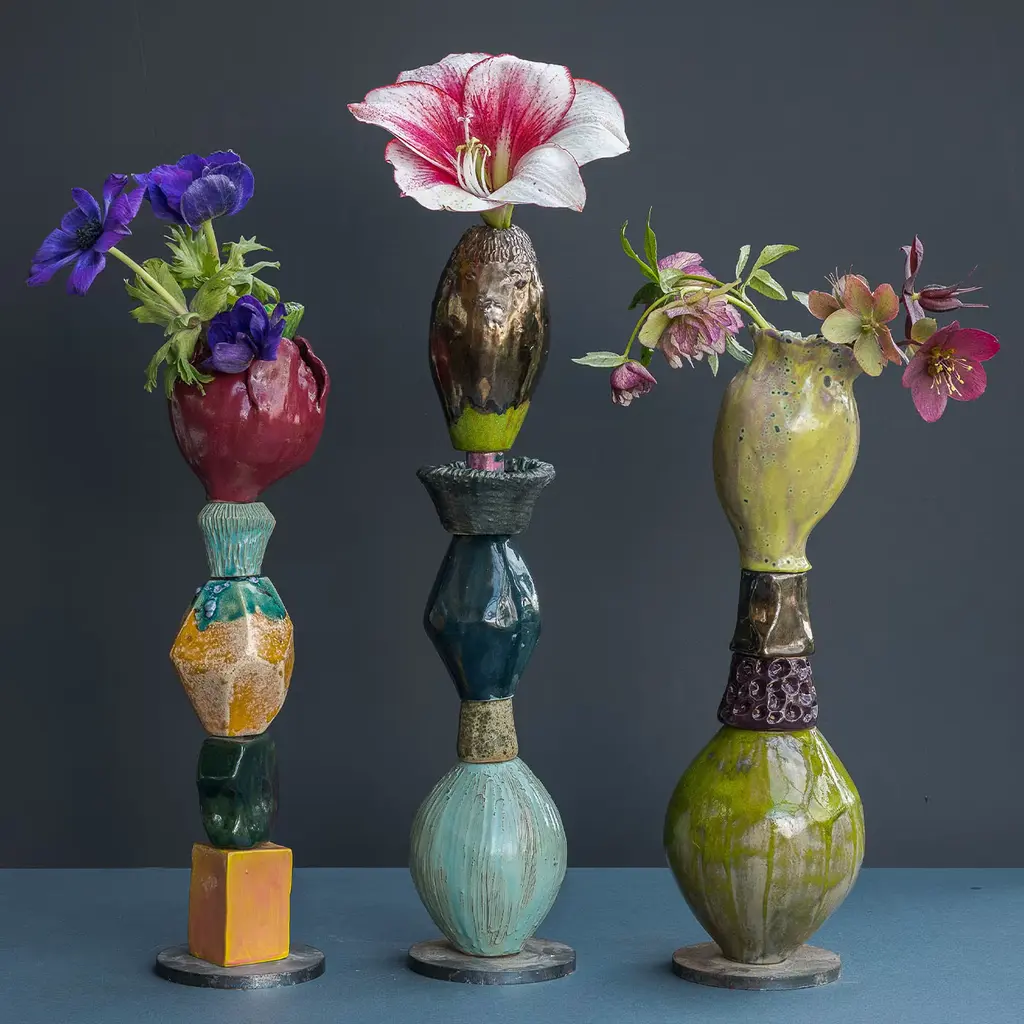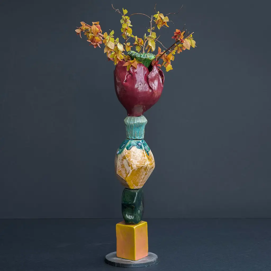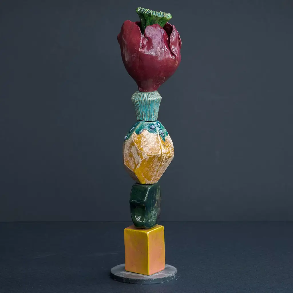 These sculptures are made with different ceramic elements fired individually and then stacked together on an iron base, the piece at the top which is often a giant bloom or seed can contain any sort of flower that can eventually become part of the sculpture. polished and glossy surfaces meet with rustic and rough ones, organic and fluid shapes are here paired with geometric and solid volumes, and bold and shiny colors match with mat and soft tones. Every piece is unique.