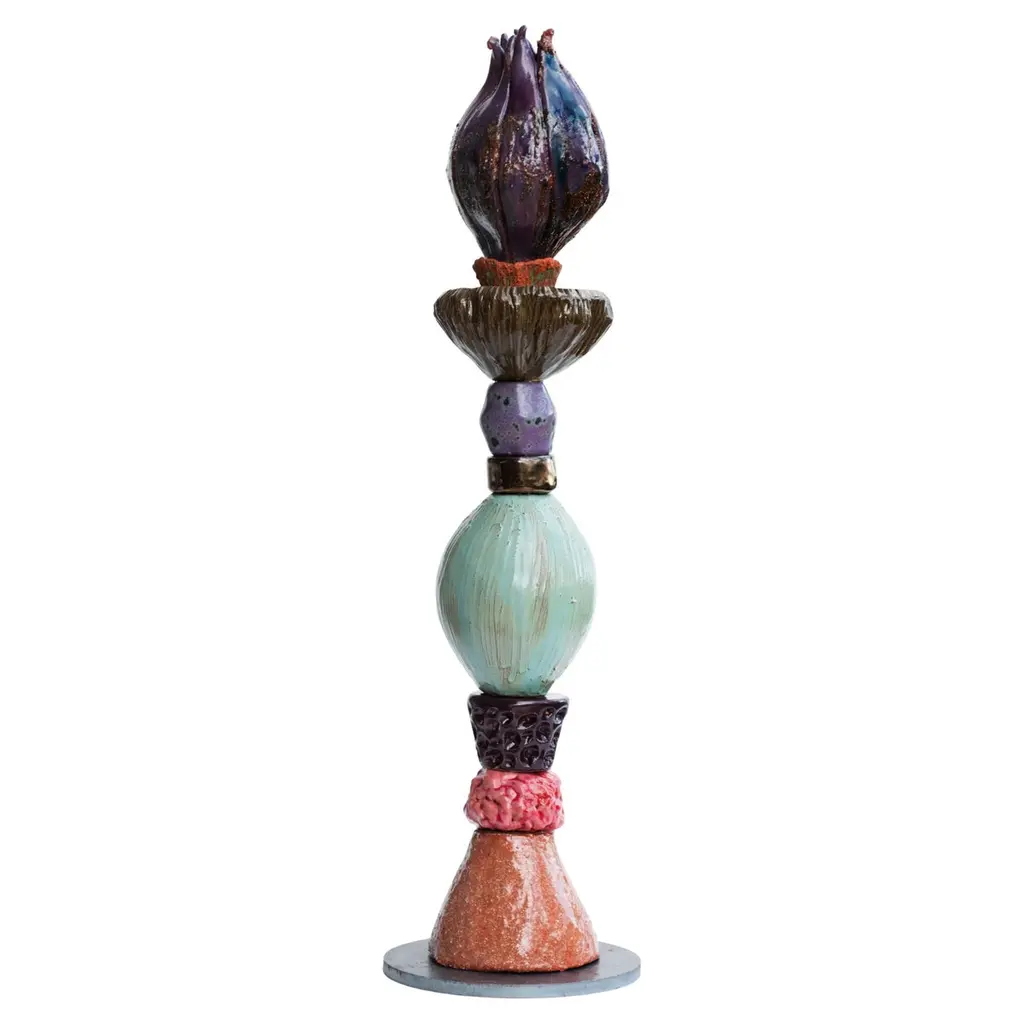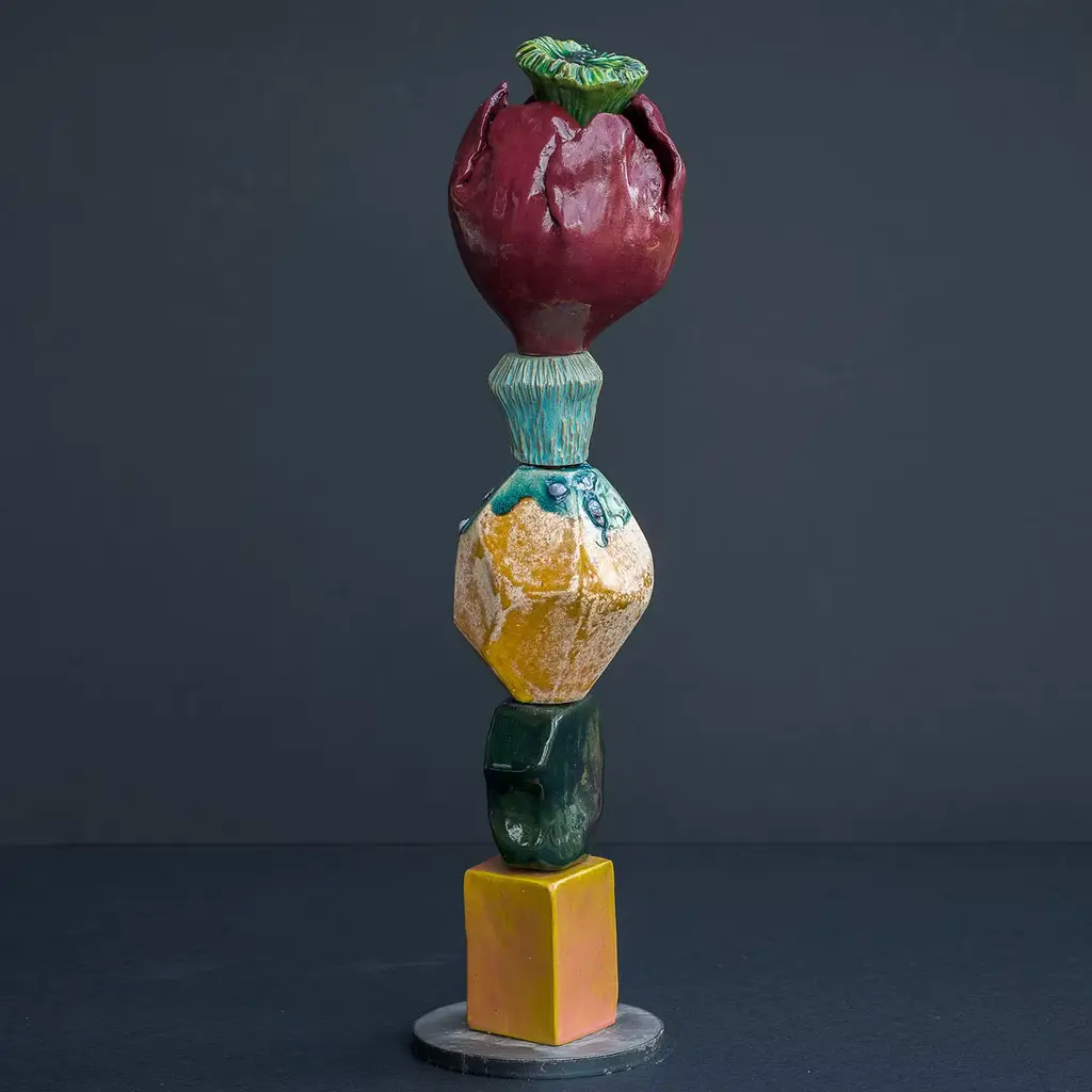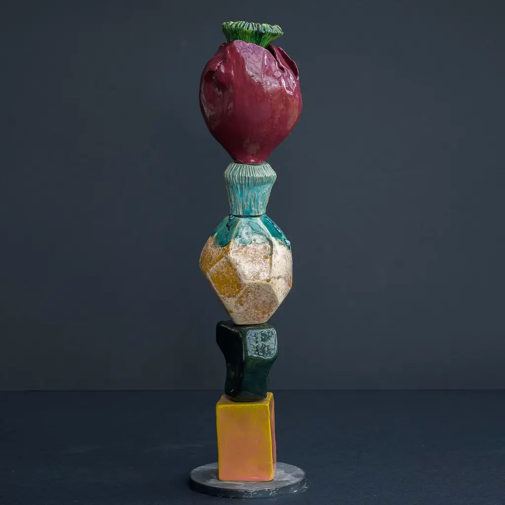 These sculptures are made with different ceramic elements fired individually and then stacked together on an iron base, the piece at the top which is often a giant bloom or seed can contain any sort of flower that can eventually become part of the sculpture. polished and glossy surfaces meet with rustic and rough ones, organic and fluid shapes are here paired with geometric and solid volumes, and bold and shiny colors match with mat and soft tones. Every piece is unique.