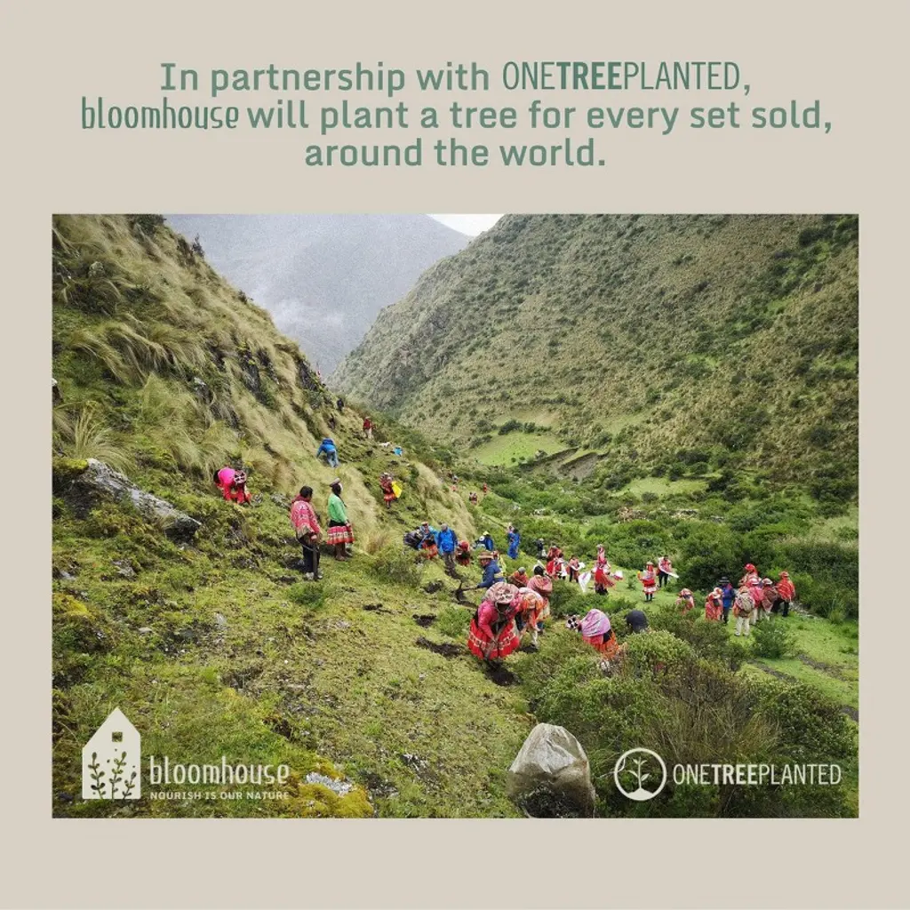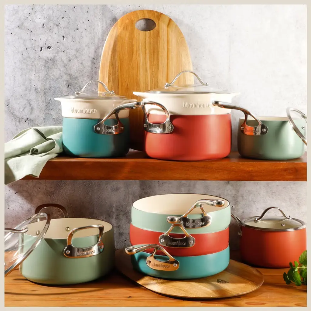 A health-driven, eco-conscious and artisan-inspired suite of pots and pans, the bloomhouse™ 12-piece Enameled Aluminum Cookware Set with Ceramic Steamer Inserts lends a sense of abundance and beauty to any kitchen with full, round-shaped cookware - drawing inspiration from the striking curvature of Colombian sculptures. Crafted from high-quality, heavy-gauge aluminum, this kitchenware set efficiently distributes heat to serve up delicious culinary perfection without cool spots and uneven results. The ceramic nonstick interior is made without PTFE, PFOA, PFAS, lead or cadmium to ensure safer and health-conscious cooking. Designed with Supreme Fusion Technology for long-lasting durability and everyday use, this non-toxic ceramic nonstick cookware is 10x stronger than the standard coating typically found in ceramic nonstick cookware pots and pans. The extended cast handles provide a safe and comfortable grip when lifting, transferring and serving. For healthier cooking styles, use the Cook-to-Serve ceramic steamer insert to prepare your favorite flavors in a manner you feel good about. Our beautifully-crafted cookware will help you prepare meals for sharing and celebrating, while encouraging mindful lifestyle choices that nourish people and the planet. The aluminum cookware is hand wash recommended and oven safe up to 500°F (400°F with glass lids) and the ceramic steamer inserts are dishwasher and oven safe up to 350°F. It comes with 12 protective care bags to store the pieces safely when not in use and to preserve the quality for generations to come. bloomhouse™ is a collection of modern-day kitchen and dining pieces that empower spirits, honor our Earth and celebrate its people. Driven by a responsible, nature-positive ethos, bloomhouse™ aspires to share a lifestyle that's good for you and good for the planet. With a mission rooted in purpose, bloomhouse™ will plant a tree on your behalf with every set sold in partnership with the non-profit organization One Tree Planted.
