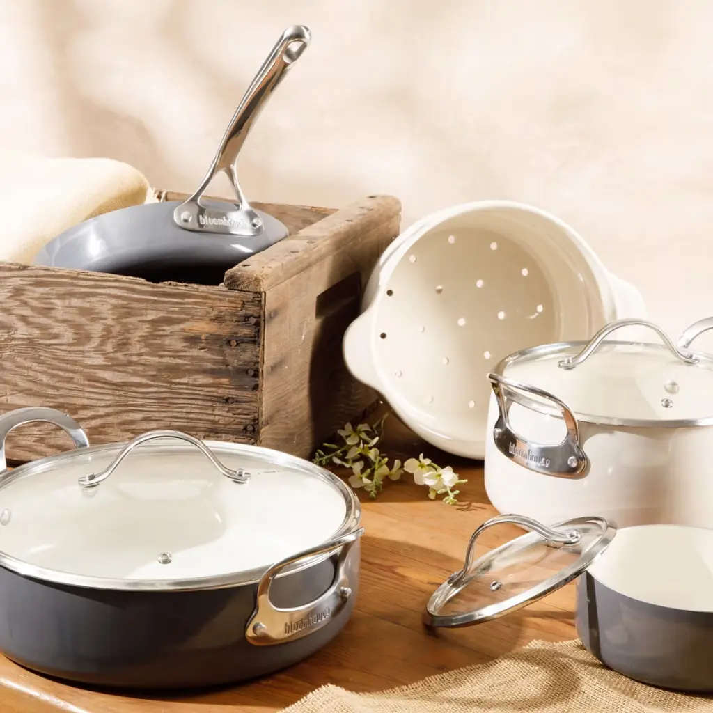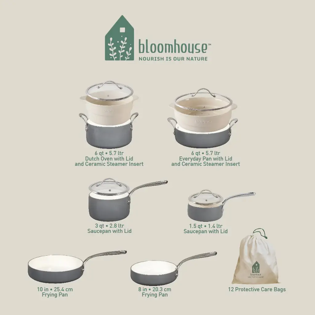 A health-driven, eco-conscious and artisan-inspired suite of pots and pans, the bloomhouse™ 12-piece Glossy Enameled Aluminum Cookware Set with Ceramic Steamer Inserts lends a sense of abundance and beauty to any kitchen with full, round-shaped cookware - drawing inspiration from the striking curvature of Colombian sculptures. Crafted from high-quality, heavy-gauge aluminum, this set efficiently distributes heat to serve up delicious culinary perfection without cool spots and uneven results. The ceramic nonstick interior is made without PTFE, PFOA, PFAS, lead or cadmium to ensure safer and health-conscious cooking. Designed with Supreme Fusion Technology for long-lasting durability and everyday use, this non-toxic ceramic nonstick interior is 10x stronger than the standard coating typically found in ceramic nonstick cookware. The extended cast handles provide a safe and comfortable grip when lifting, transferring and serving. For healthier cooking styles, use the Cook-to-Serve ceramic steamer insert to prepare your favorite flavors in a manner you feel good about.