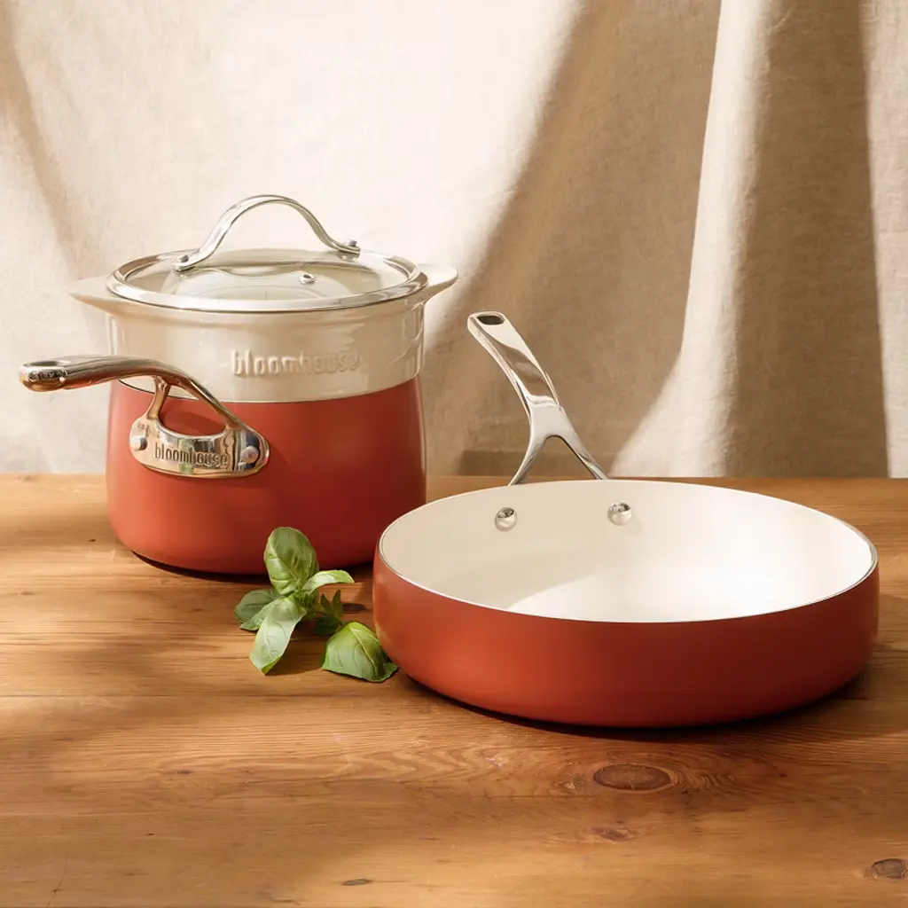 aller-size cookware sets open up your kitchen to a well-curated collection according to your culinary style and space. The bloomhouse™ 3-piece Matte Enameled Aluminum Cookware Set is a compact cooking starter kit that's small in size but big in design and function. It lends a sense of abundance and beauty to any kitchen with full, round-shaped cookware - drawing inspiration from the striking curvature of Colombian sculptures. Crafted from high-quality, heavy-gauge aluminum, this pot efficiently distributes heat to serve up delicious meals and seasonal flavors without cool spots and uneven results. The ceramic nonstick interior is made without PTFE, PFOA, PFAS, lead or cadmium to ensure safer and health-conscious cooking. Designed with Supreme Fusion Technology for long-lasting durability and everyday use, this non-toxic ceramic nonstick surface is 10x stronger than the standard coating typically found in ceramic nonstick cookware. Extended cast handles provide a safe and comfortable grip when lifting, transferring and serving. For healthier cooking styles, use the Cook-to-Serve ceramic steamer insert to prepare your favorite flavors in a manner you feel good about. Safe to use on gas, electric, ceramic, glass and halogen stovetops, our beautifully-crafted cookware will help you prepare meals for sharing and celebrating, while encouraging mindful lifestyle choices that nourish people and the planet. The aluminum cookware is hand wash recommended and oven safe up to 500°F (400°F with the glass lid) and the ceramic steamer insert is dishwasher and oven safe up to 350°F. It comes with 4 protective care bags to store the pieces safely when not in use and to preserve the quality for generations to come.