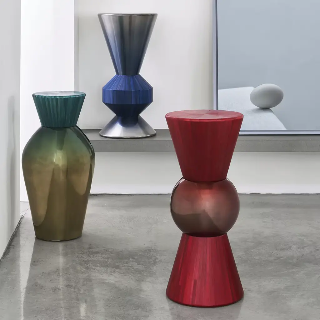 In ancient times, amphoras were used to transport precious materials. Drawing inspiration from this long-gone tradition is the Blue Amphora Sculpture by Luca Barengo. Reimagined as a metaphoric container of surprising ideas and refined techniques, the sculpture is crafted with exquisite straw marquetry for a multi-tonal effect, alongside liquid metal to exudes timeless elegance in any design context.