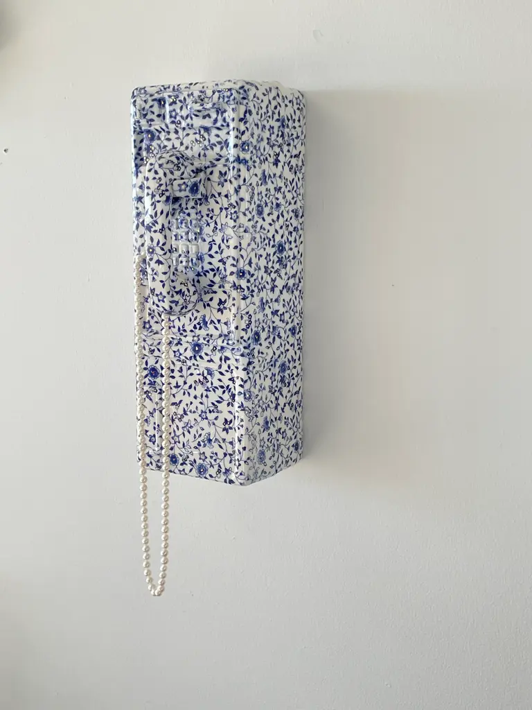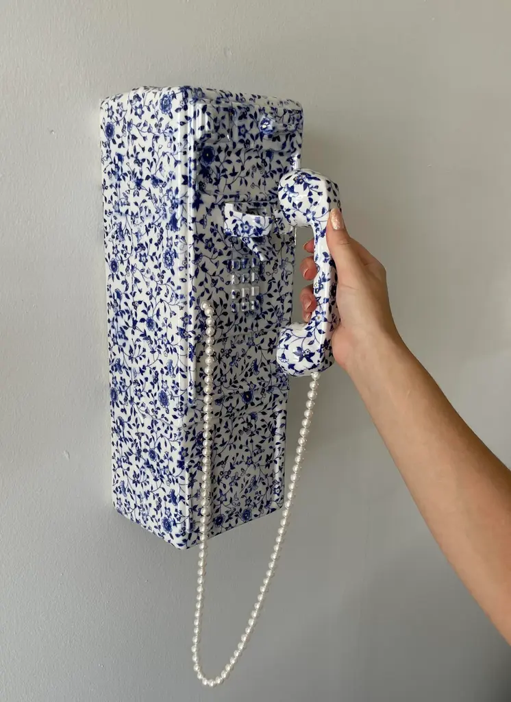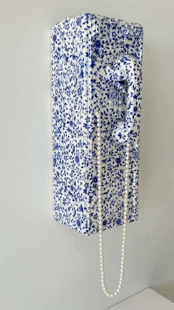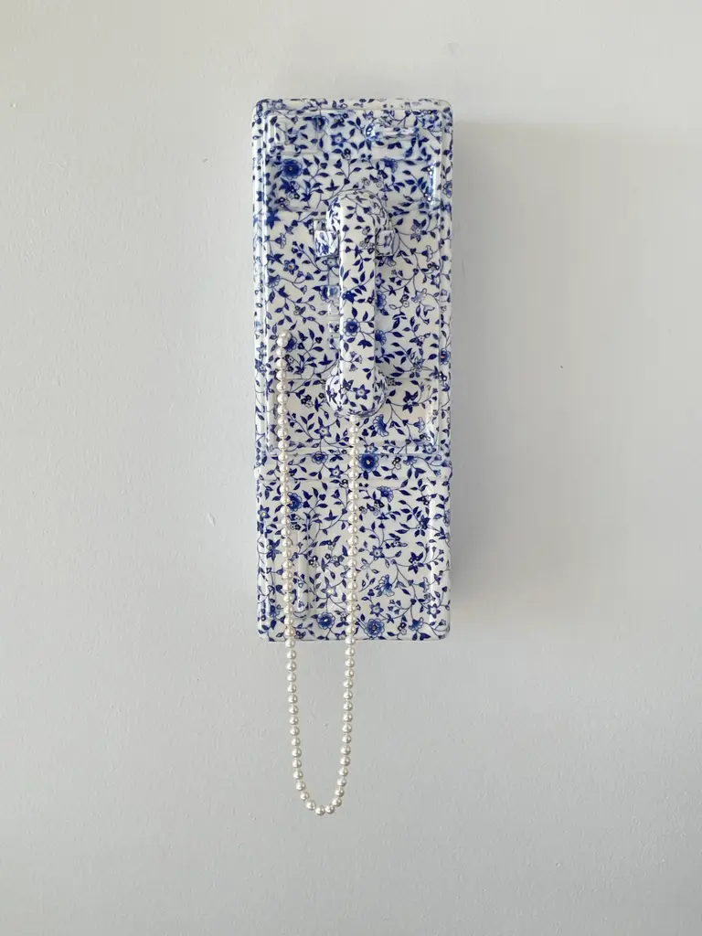 This porcelain sculpture of a payphone is a captivating fusion of art and nostalgia. Its sleek, elegant design is adorned with a timeless blue and white pattern, evoking a sense of vintage charm. The clean lines and delicate porcelain construction make it a striking piece, while the classic payphone shape brings back memories of a bygone era. This sculpture is a testament to the enduring beauty of classic design and the artistry of porcelain craftsmanship. porcelain, cobalt oxide, glaze, gold luster, AAA freshwater pearls, silk thread 17.5” (24" w. cord) x 5.25” (7.5" w. handset) x 6.5” Brock DeBoer is a ceramic sculptor specializing in porcelain. He lives and works out of his studio in Joshua Tree, CA.