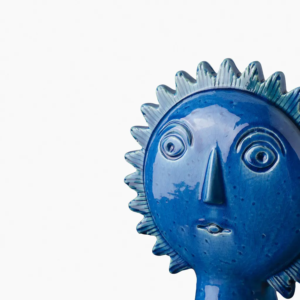 This striking sculpture represents a sun and is executed in white clay with a vivid blue finish and engravings representing the face of the sun, while geometrical decorations engrave the base. The rays of the sun are poetically evoked by a crown of lighter blue triangles surrounding the top of the piece that was designed by Bitossi's then artistic director, Aldo Londi, in 1953.