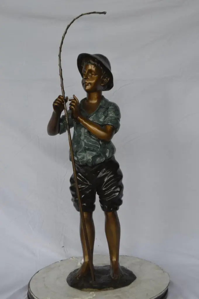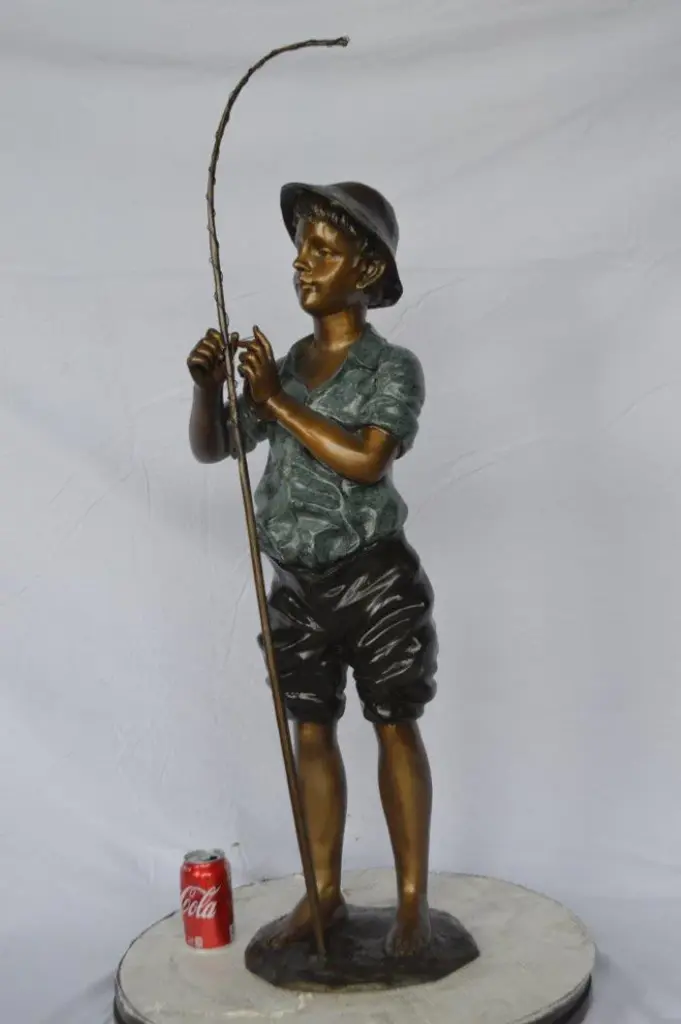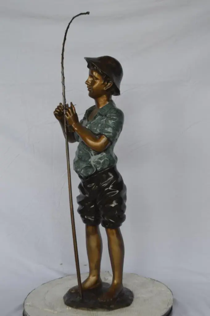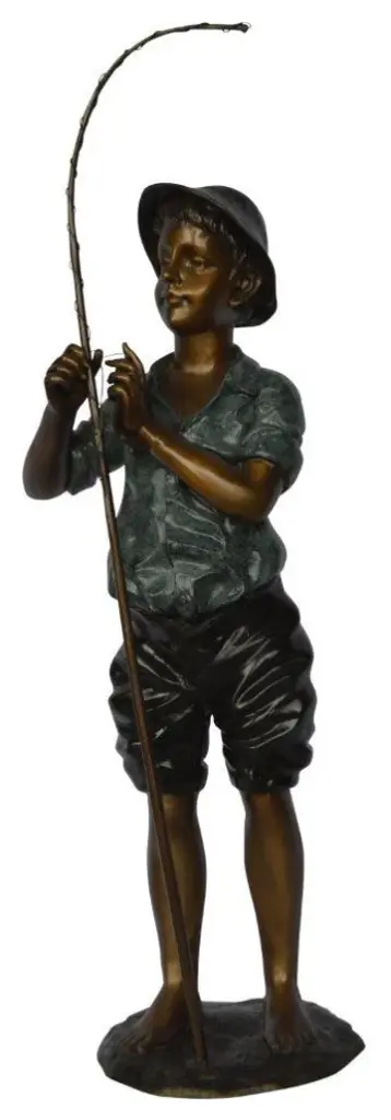 This young boy is interacting with his fishing rod. As evidenced by his hat and the size of his rod, he is ready to catch some large fish. This beautiful bronze statue is cast using the "Lost Wax" method and is covered with a patina finish. This bronze statue is particularly great for any fan of fishing, nature, or art. This is sure to make any observer reminisce about a simpler, more youthful time. Size: 11"L x 14"W x 44"H. Weight is: 31Lb
