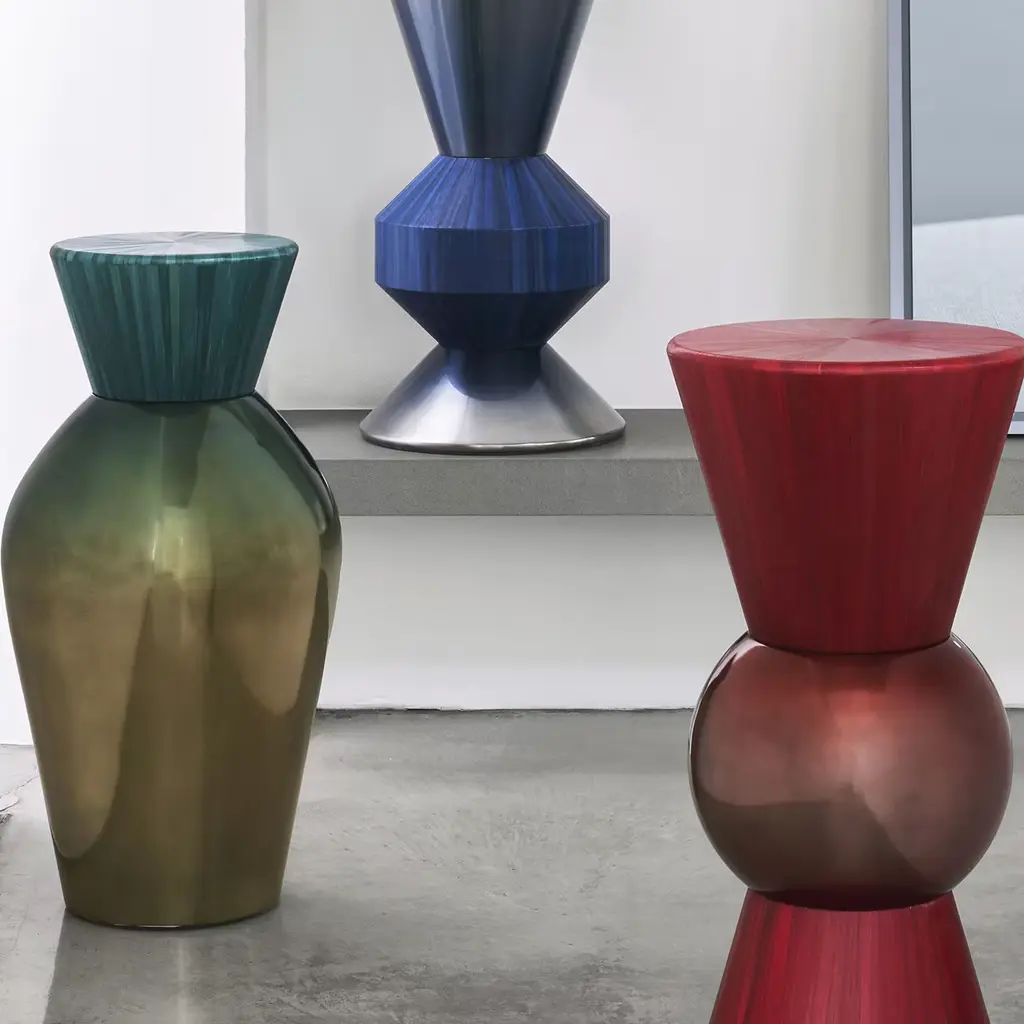 Drawing inspiration from ancient amphoras, once used to transport precious materials, is the Brass Amphora Sculpture by Luca Barengo. Crafted as a metaphoric container of surprising ideas and refined techniques, the sculpture is accented with exquisite straw marquetry for a multi-tonal effect, alongside liquid metal to exudes timeless elegance in any design context.