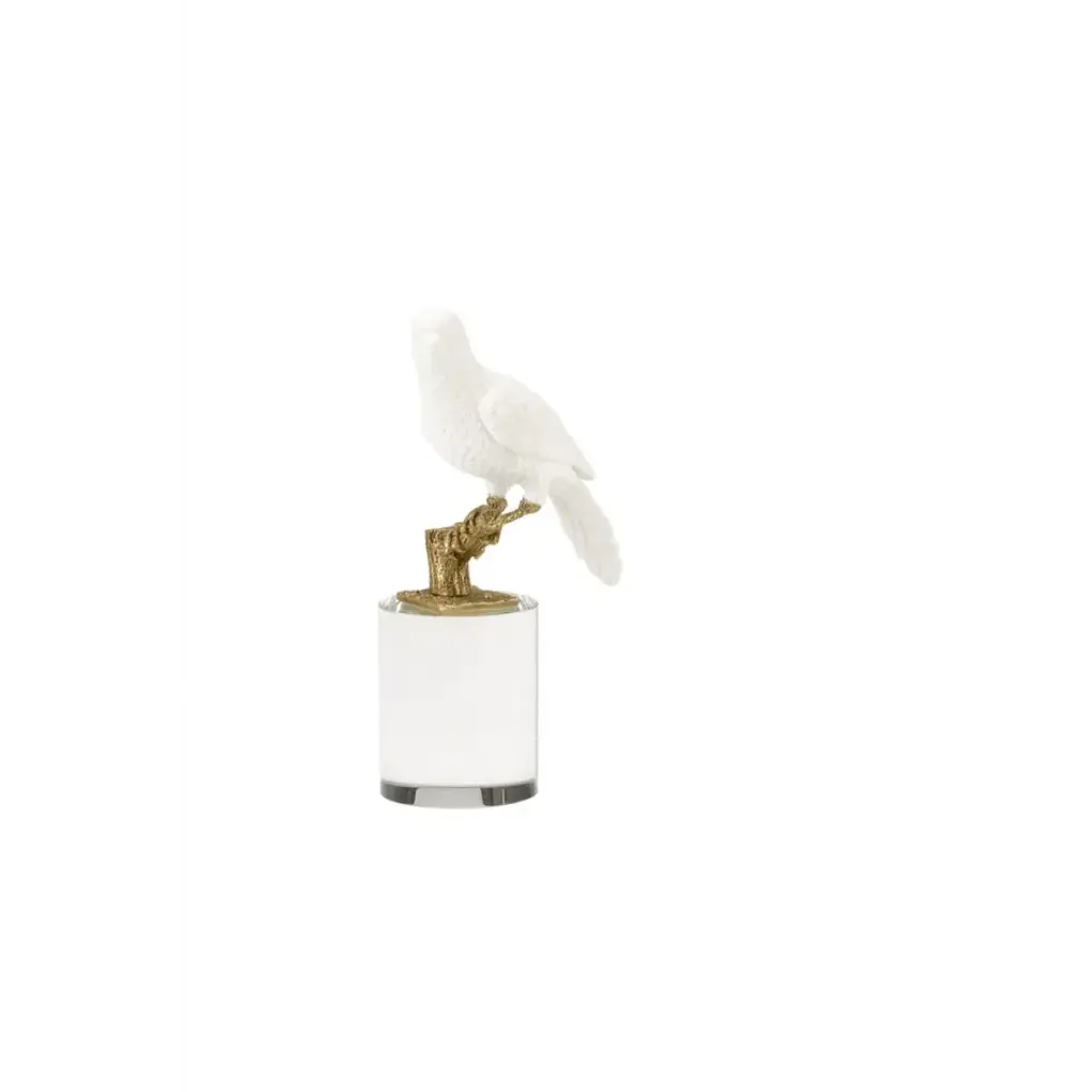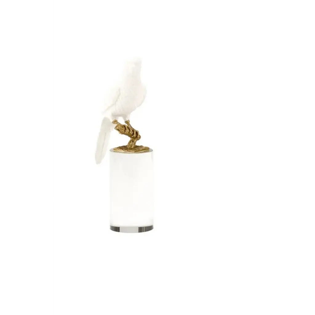 A gorgeous accent that serves as an effective focal point in any home décor, this sculpture showcases textural depth to result in a wealth of visual interest. Crafted from brass and represented in stunning detail, a bird perches atop a branch that is supported by a raw natural quartz stone. This gorgeous stone is mounted to a cubic base of white marble, creating an opulent color scheme that will greatly elevate an interior space. The Brass Bird and Quartz Sculpture is also available in an alternate variant, opening up possibilities for a stunning custom arrangement.