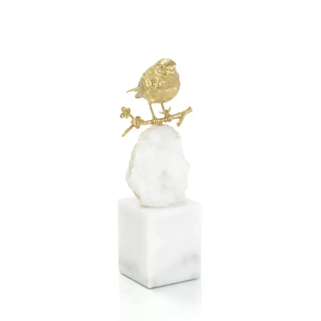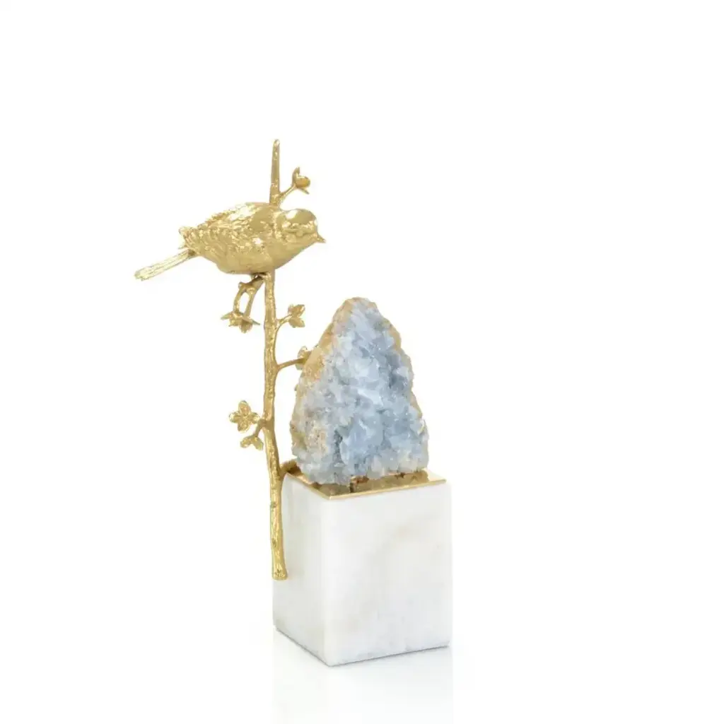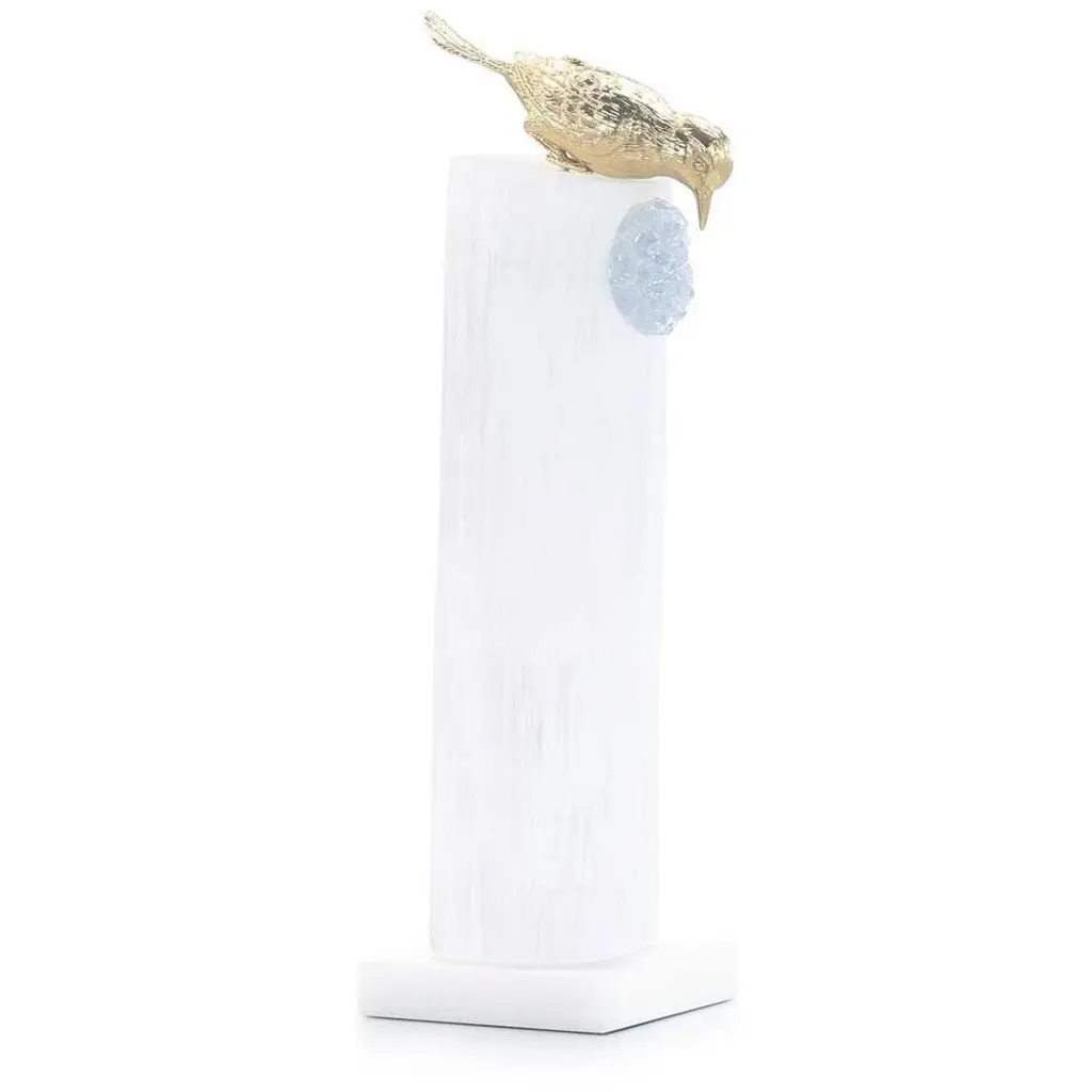 This gorgeous decorative accent showcases a brass bird with intricate detailing as it roosts itself atop an organically shaped selenite tower. The natural selenite stone features a blue gemstone near the top, contributing cool blue tones to the ornate color palette. A square base of white marble completes the look.
