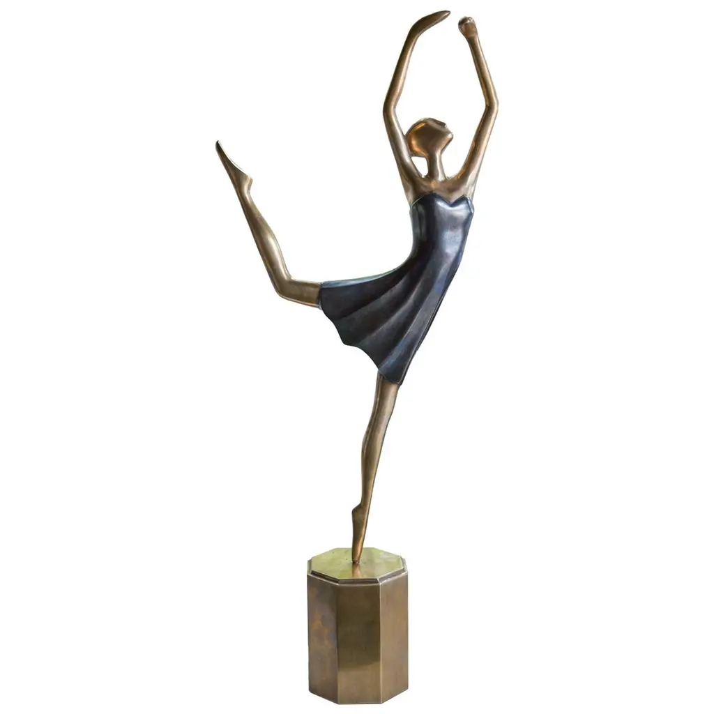 The Brass Dancer Sculpture is a playful decorative accent that introduces a light, breezy atmosphere to an interior space. Crafted from brass, a detailed human figure strikes a dance pose atop an organically shaped selenite stone.