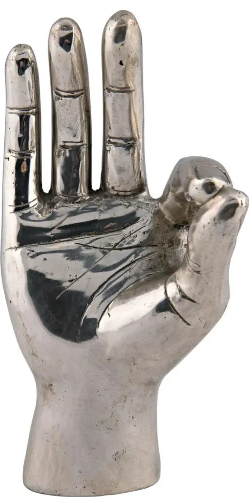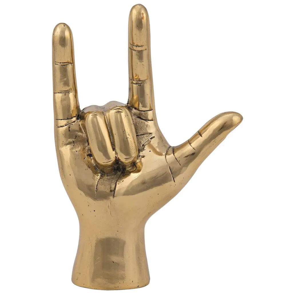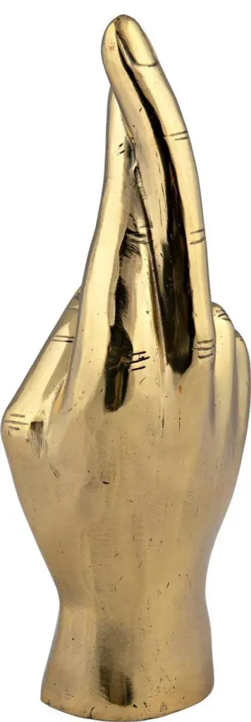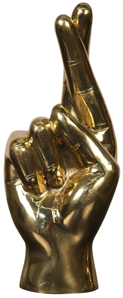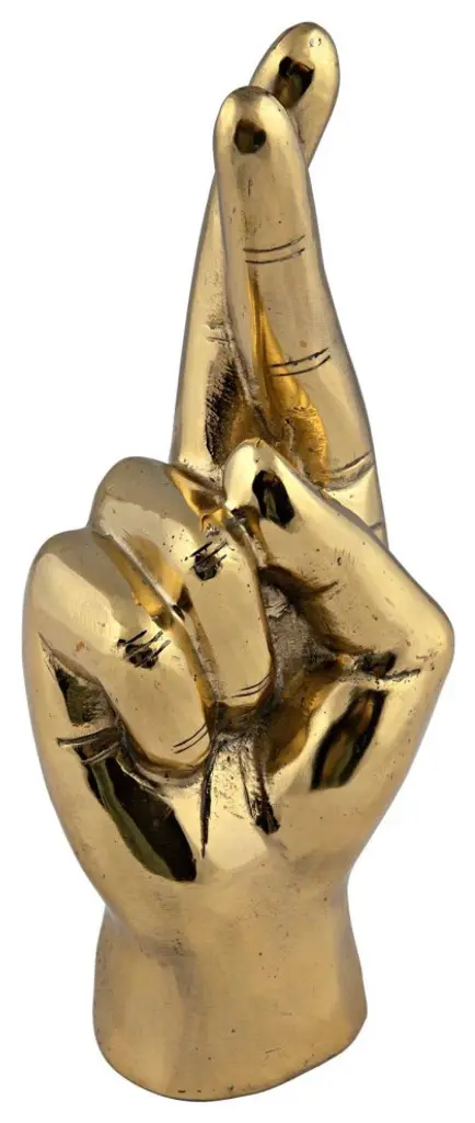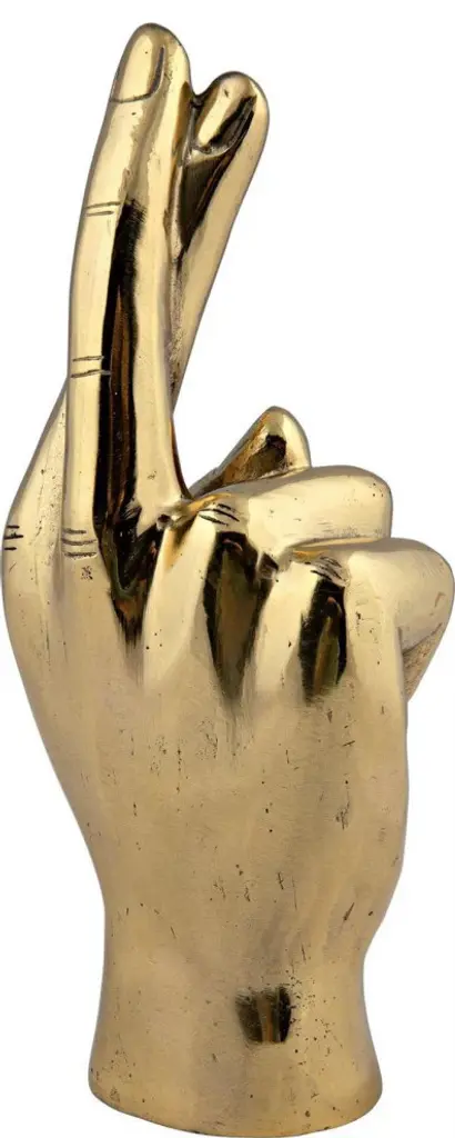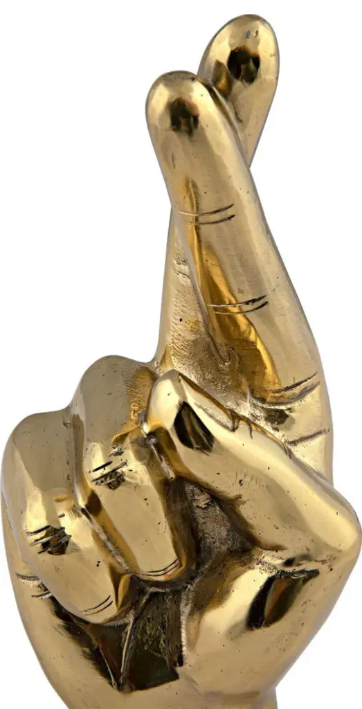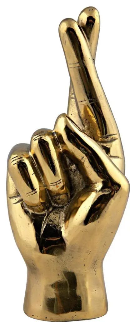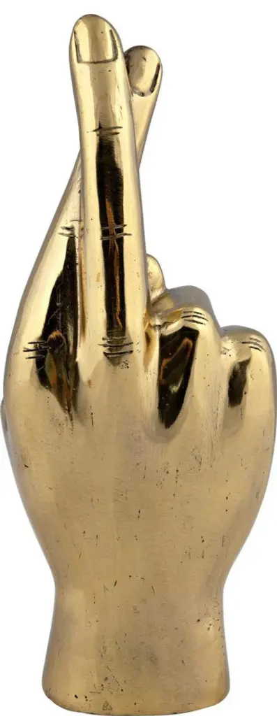 Introducing a distinguished piece of artistry "” our Brass Fingers Crossed Sculpture. Fusing traditional craftsmanship and modern aesthetics, this sculpture is a tribute to the timeless art of metalwork. Standing gracefully at 9.50 inches with a width of 4 inches and a depth of 3 inches, it commands attention with its intricate representation of the fingers crossed gesture, known universally as a charm for good fortune. The sculpture boasts a lustrous antique brass finish, making it an exquisite addition for lovers of elegant and vintage-inspired decor. Made from a premium metal alloy, this piece embodies durability and style, making it a delightful highlight in any room setting. Its versatile dimensions allow it to fit perfectly atop a desk, bookshelf, or display case. Whether as a personal symbol of optimism or an artistic conversation starter, this sculpture is sure to leave a lasting impression. - Dimensions: 9.50H 4W 3D - Elegant Antique Brass finish - Constructed from a Metal Alloy for durability - Traditional style with a symbolic design - Ideal for vintage and classic interior themes