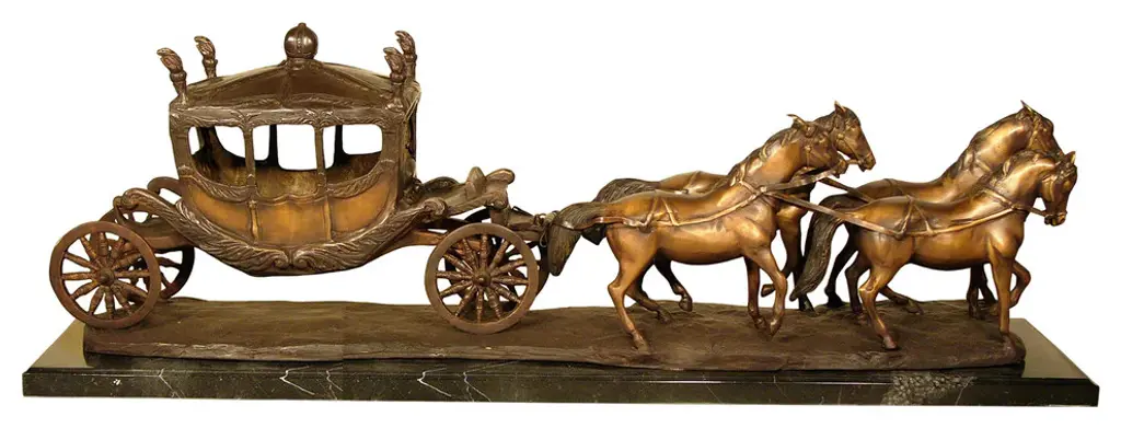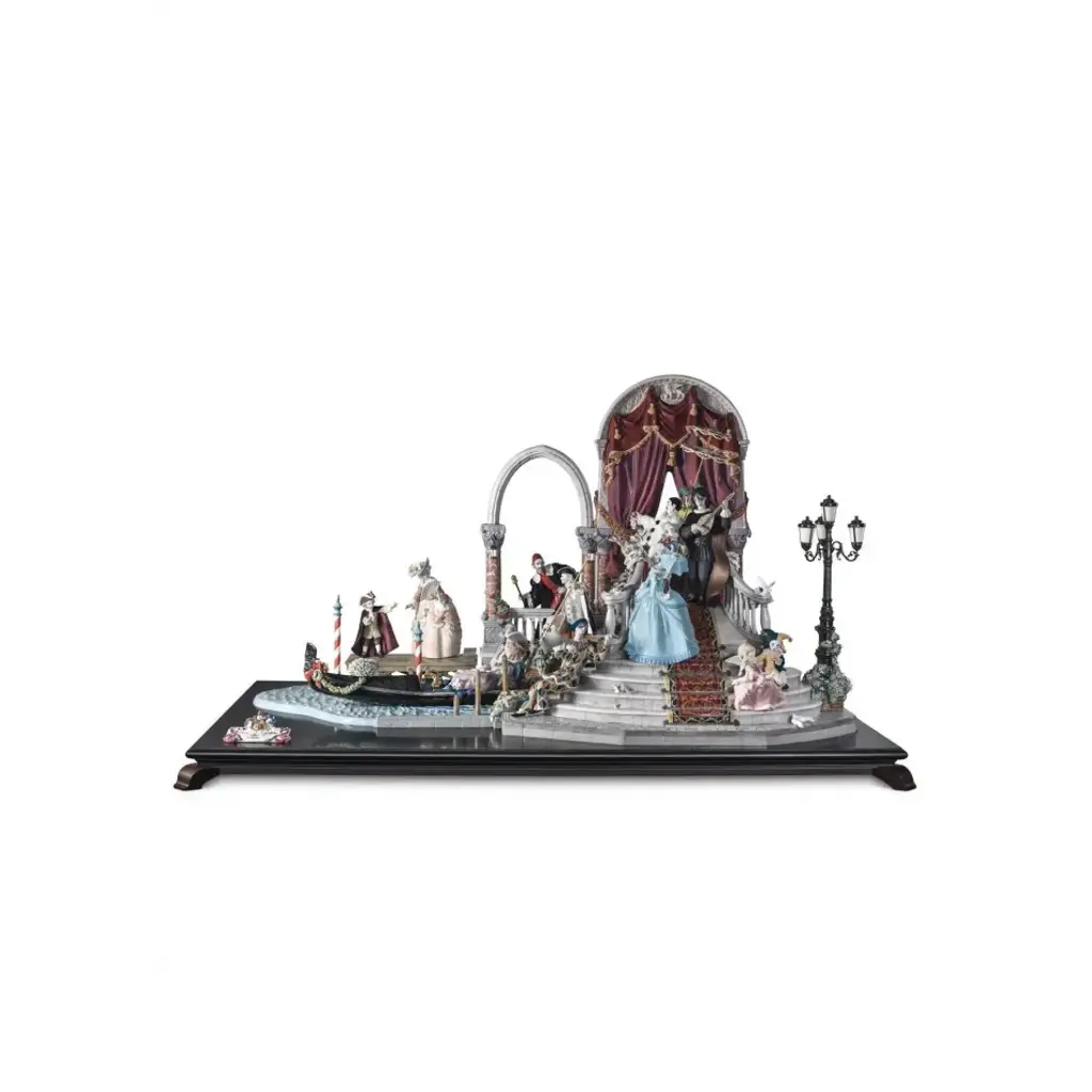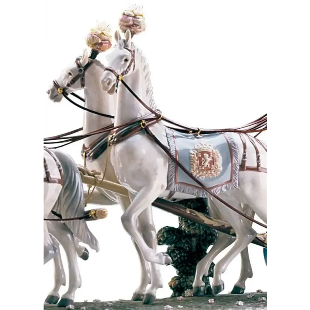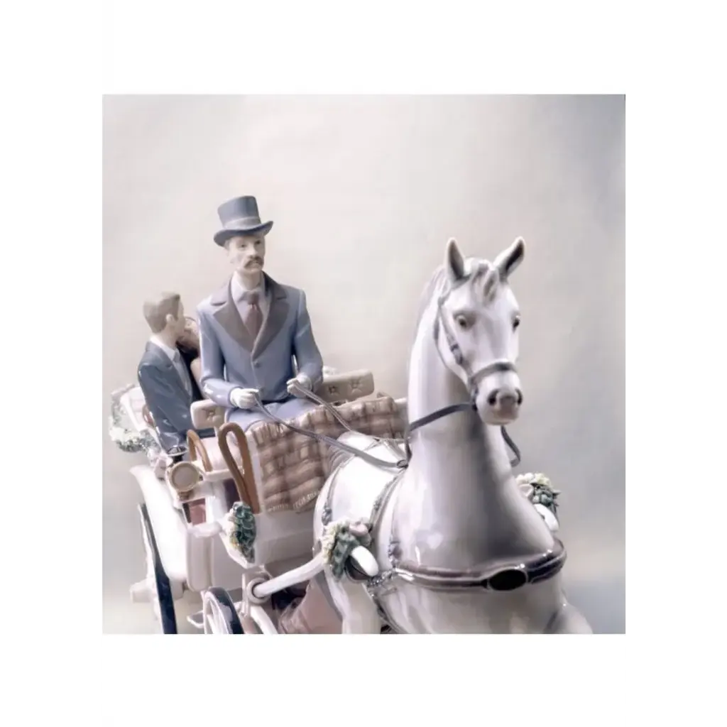 Limited edition sculpture of a couple with a carriage and handmade flowers in gloss finish porcelain. An iconic Spanish brand, Lladro is a world leader in the creation of porcelain art. Started by brothers Juan, Jose and Vicente Lladro in 1953, the ceramic figurines were initially inspired by the works of great European manufacturers like Meissen and Sevres. Over time, a unique style was forged, consisting of elongated lines, a revolutionary single-firing method, and soft pastel tones.
