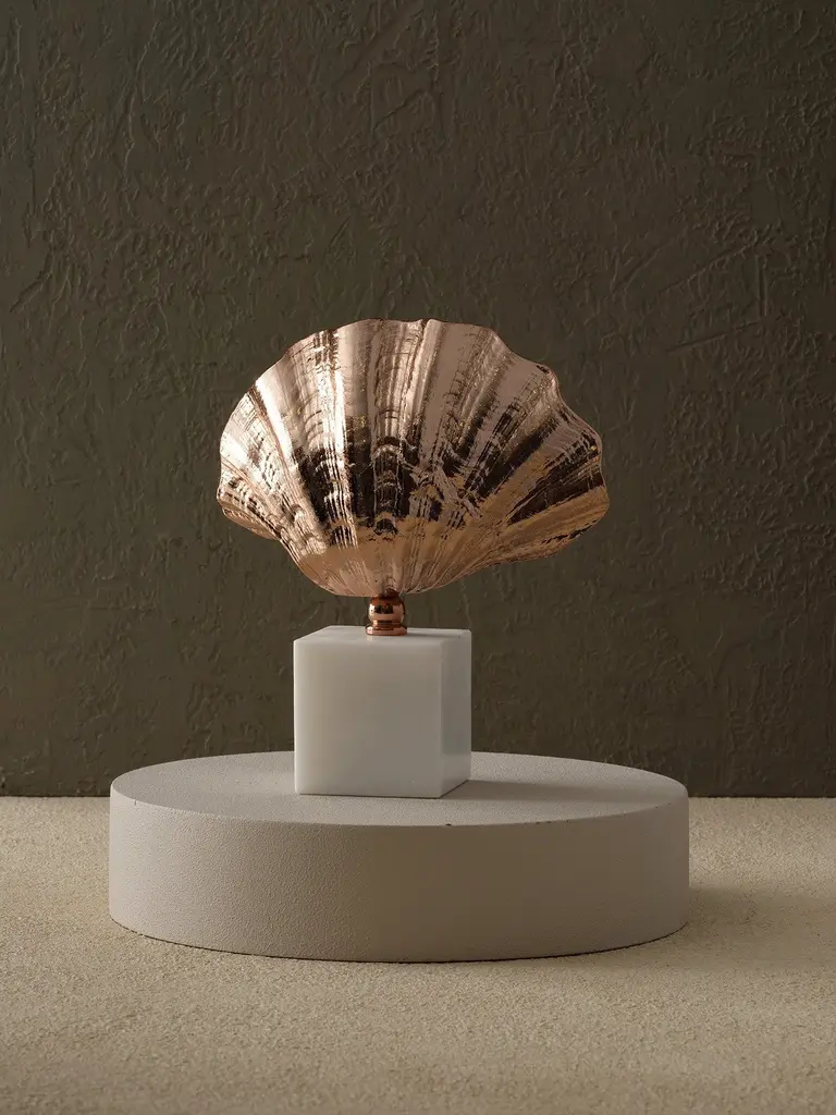 A celebration of the sea in sculptural form, the Bronze-Finish Shell Sculpture with White Marble Base captures coastal elegance with artistic precision. The shimmering bronze-toned shell is delicately textured to reflect natural ridges and curves, evoking the beauty of ocean treasures. Mounted on a solid white marble cube, this piece offers striking contrast and stability. Perfect for display on consoles, bookshelves, or side tables, it brings a refined coastal spirit and tactile luxury to both modern and classic interiors.