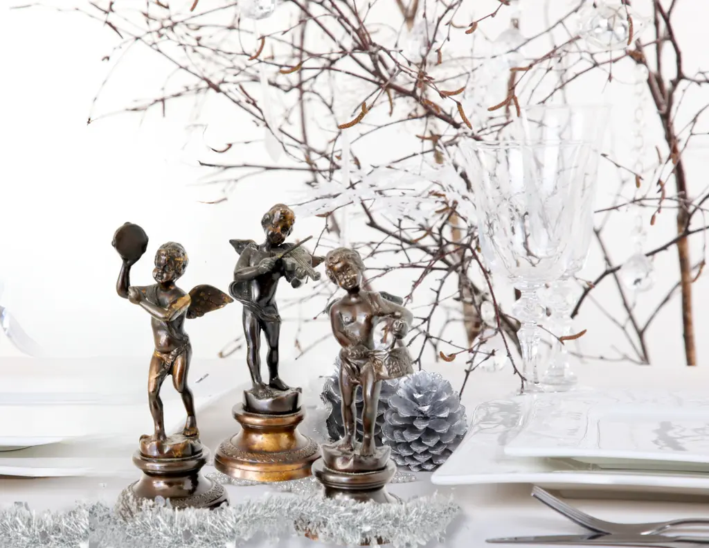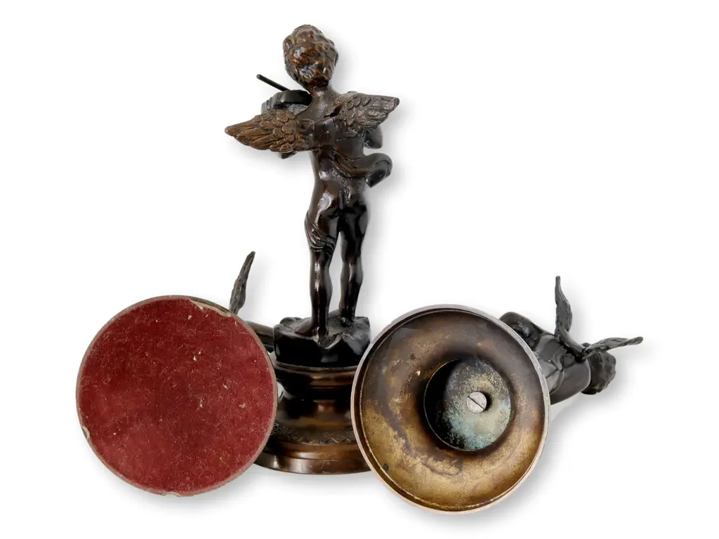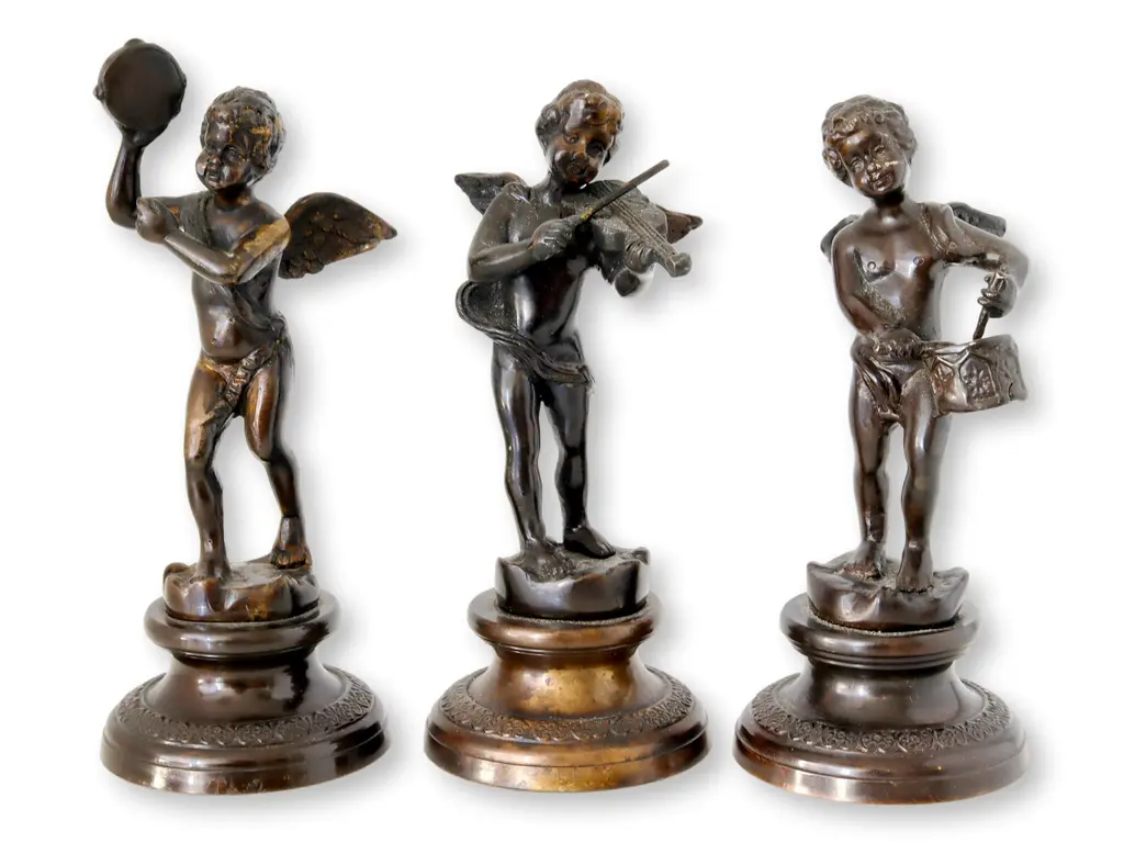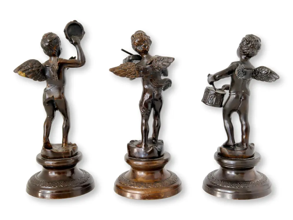 Embrace old-world charm with these bronzed metal cherub musicians. Made circa1980s they are reproductions of antique sculptures. They capture the essence of a bygone era where craftsmanship met artistry. Add a touch of classical elegance to your decor with these enchanting cherubs, a testament to the enduring beauty of the past. No maker's marks.