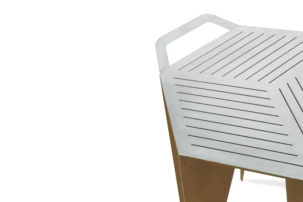 The spark of the original fire, the joyful fire or the spiritual fire. Fire is our home. this first series produced by les choses is an aesthetic exploration of the primary element. With its bold lines and brutalist design, the brasero n°1 reflects designer yoan claveau de lima's commitment to not let form be dictated by function. These pieces, conceived as true sculptures, are steel monoliths that embody the age-old human need to rationalize the natural power of flame. after several months of prototyping, yoan claveau de lima was able to find the ideal composition and the right assemblies in order to obtain pieces resistant to temperature rise. The use of corten steel, thanks to its predisposition to self-patina, inscribes the pieces in a long time. the meeting between the tension of the lines, the brutality of the material and the sensuality of the flames, offers to this series an accuracy at the same time aesthetic and functional. Here more than a symbolic opposition, a translation of being one with the element and sharing with his loved ones: anchoring in the ground, multiplication of the faces of the object, proximity of the hearth, food. the robustness of the pieces, the unalterable material and the sincerity of their creation make them subjects inscribed in an intergenerational temporality. the publishing house les choses, in collaboration with ycl, has taken up the challenge of satisfying the tastes of aesthetes and gourmets. the brasero n°1 is a monumental piece perfectly adapted to large spaces: terrace, beach, park. in all seasons, thanks to its width and its great resistance, it can receive the generous fires we all dream of. the brasero n°1 is made of 6mm corten steel. The grill is made of 3mm stainless steel. imprinted by maker,imprinted by maker