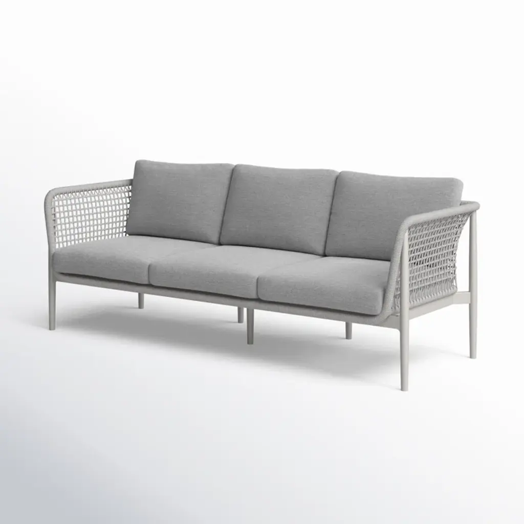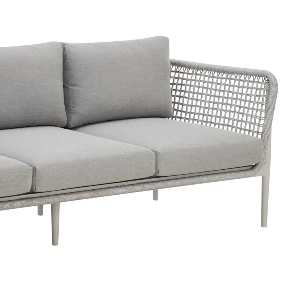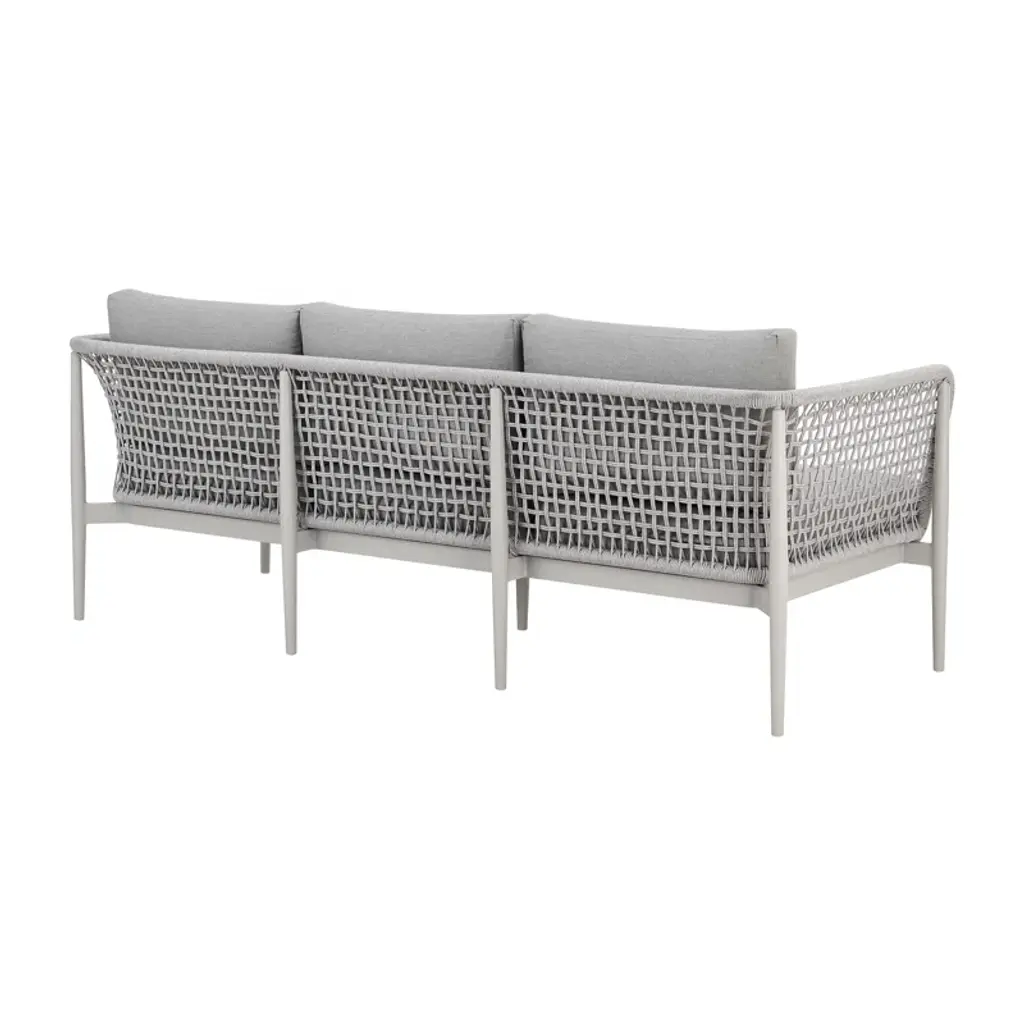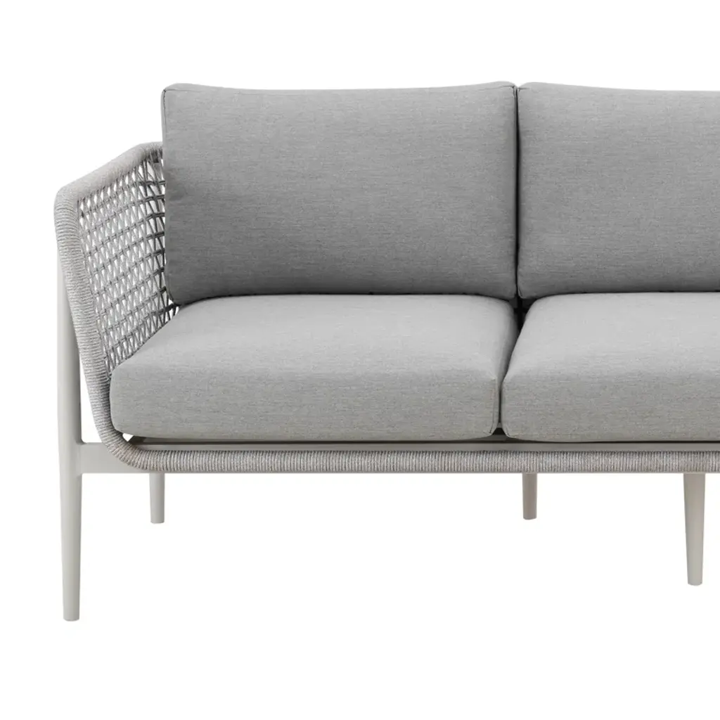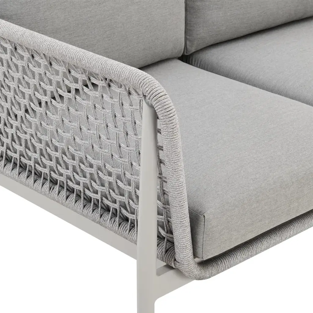 Introducing the Cayli outdoor patio sofa – an embodiment of contemporary design and outdoor indulgence meticulously crafted to redefine your lounging experience. This sleek outdoor sofa seamlessly blends the refined appeal of aluminum with the tactile elegance of light gray rope detailing and the sumptuous comfort of cushions made from solution-dyed acrylic fabric, creating a stylish and enduring centerpiece for your outdoor furniture collection. Crafted with precision, the Cayli outdoor patio sofa features a robust aluminum frame, ensuring both durability and a modern aesthetic that effortlessly complements various outdoor settings. The aluminum frame not only contributes to the sofa's sleek charm but also provides sturdiness, making it a reliable and resilient choice for your outdoor seating needs. Designed for outdoor durability, the Cayli sofa boasts water-resistant and UV-resistant features, standing as a steadfast and stylish seating solution for your patio or garden area. Whether bathed in sunlight or facing unexpected rain, this sofa remains a reliable and eye-catching focal point for your outdoor gatherings. The incorporation of light gray rope detailing adds a unique visual dimension to the design, creating a captivating contrast with the smooth aluminum frame. Paired with removable cushions with a zippered cover, the Cayli sofa invites you to relax in both style and comfort. Solution-dyed acrylic fabric ensures vibrant colors and resistance to fading, providing lasting beauty even in the face of changing weather conditions. Whether you're hosting gatherings or seeking a tranquil retreat, the Cayli outdoor patio sofa offers an inviting and luxurious seating option.
