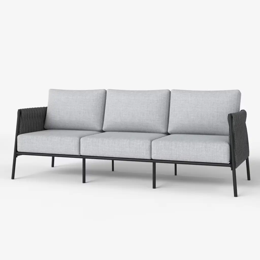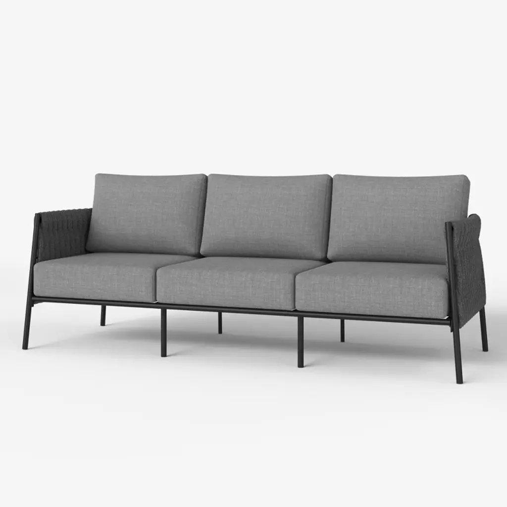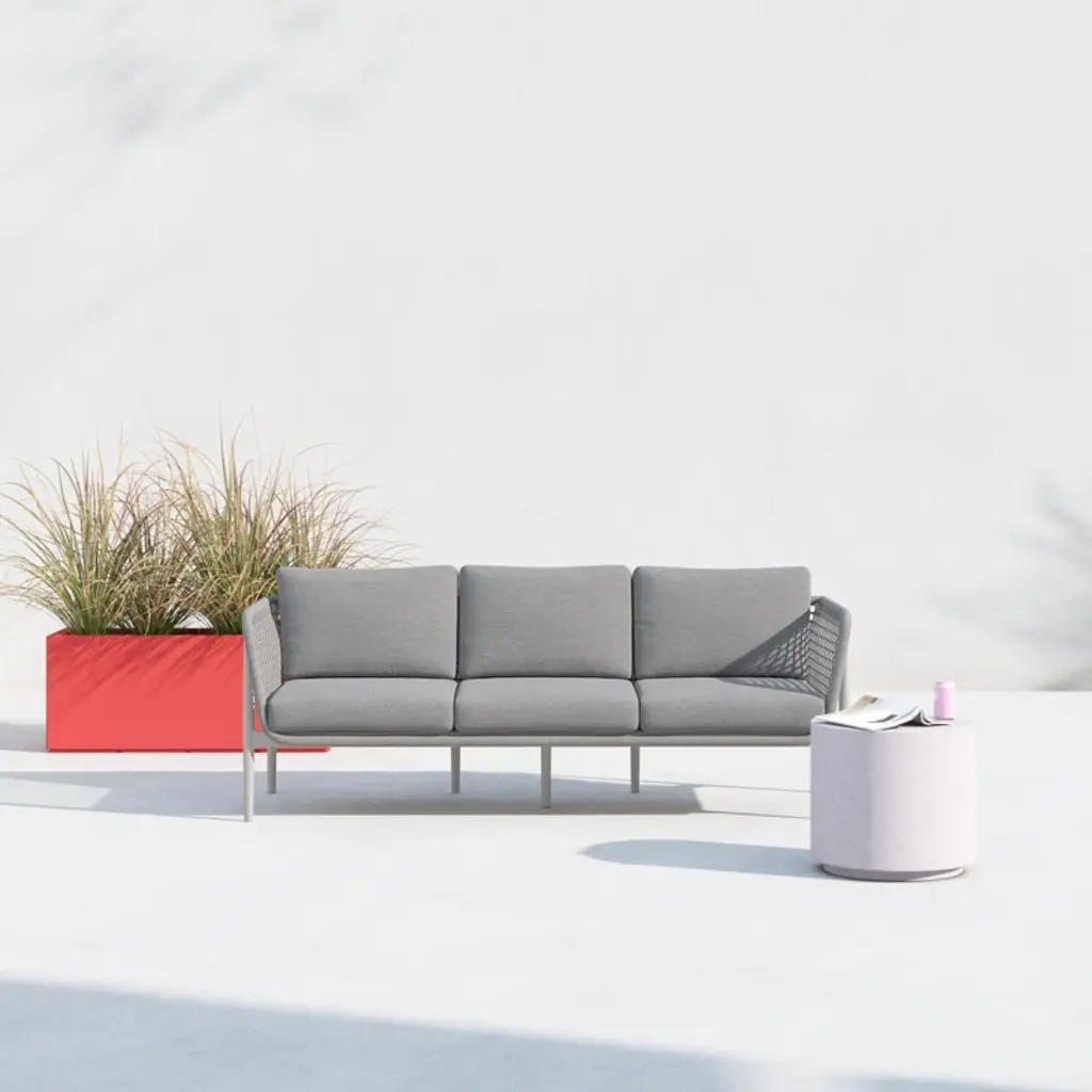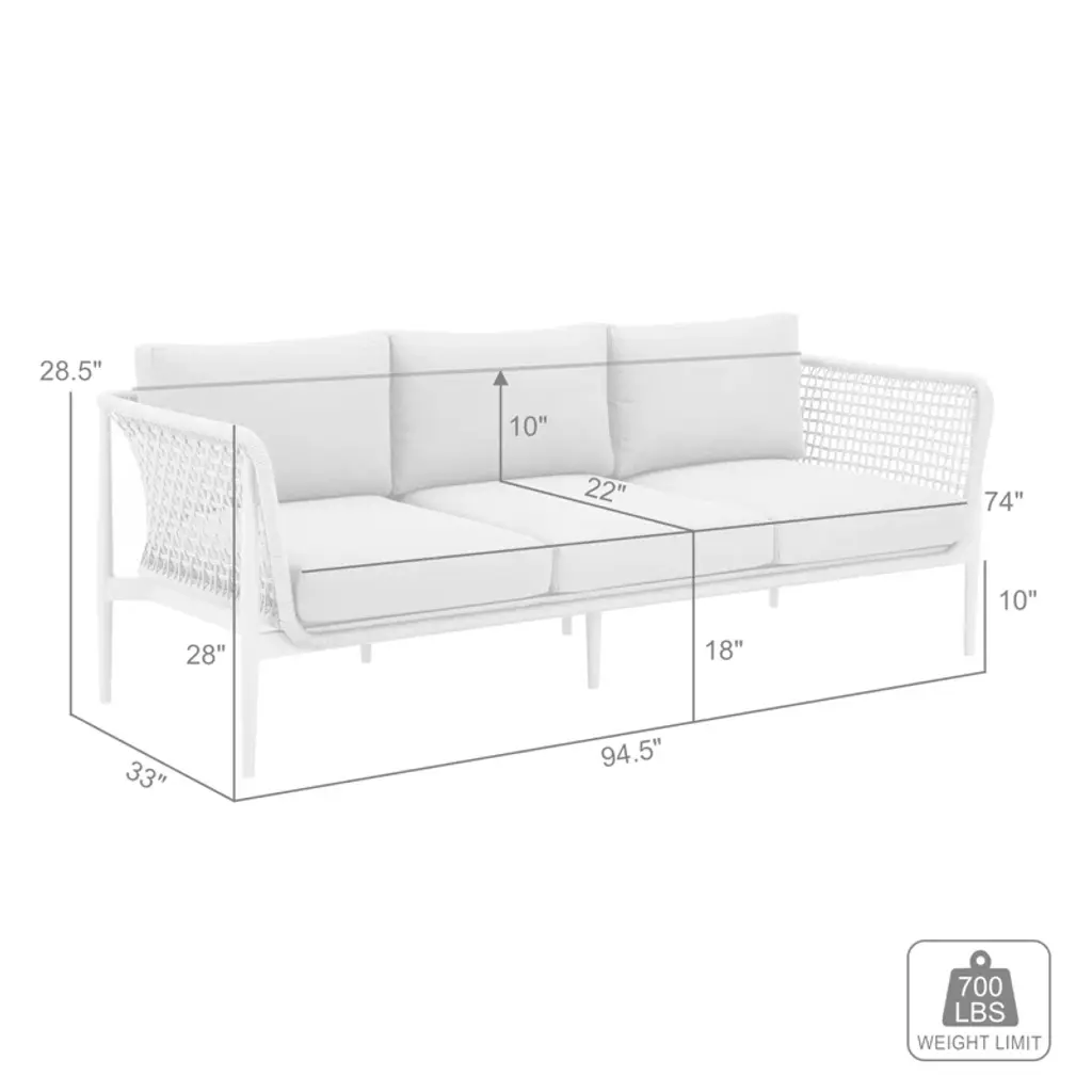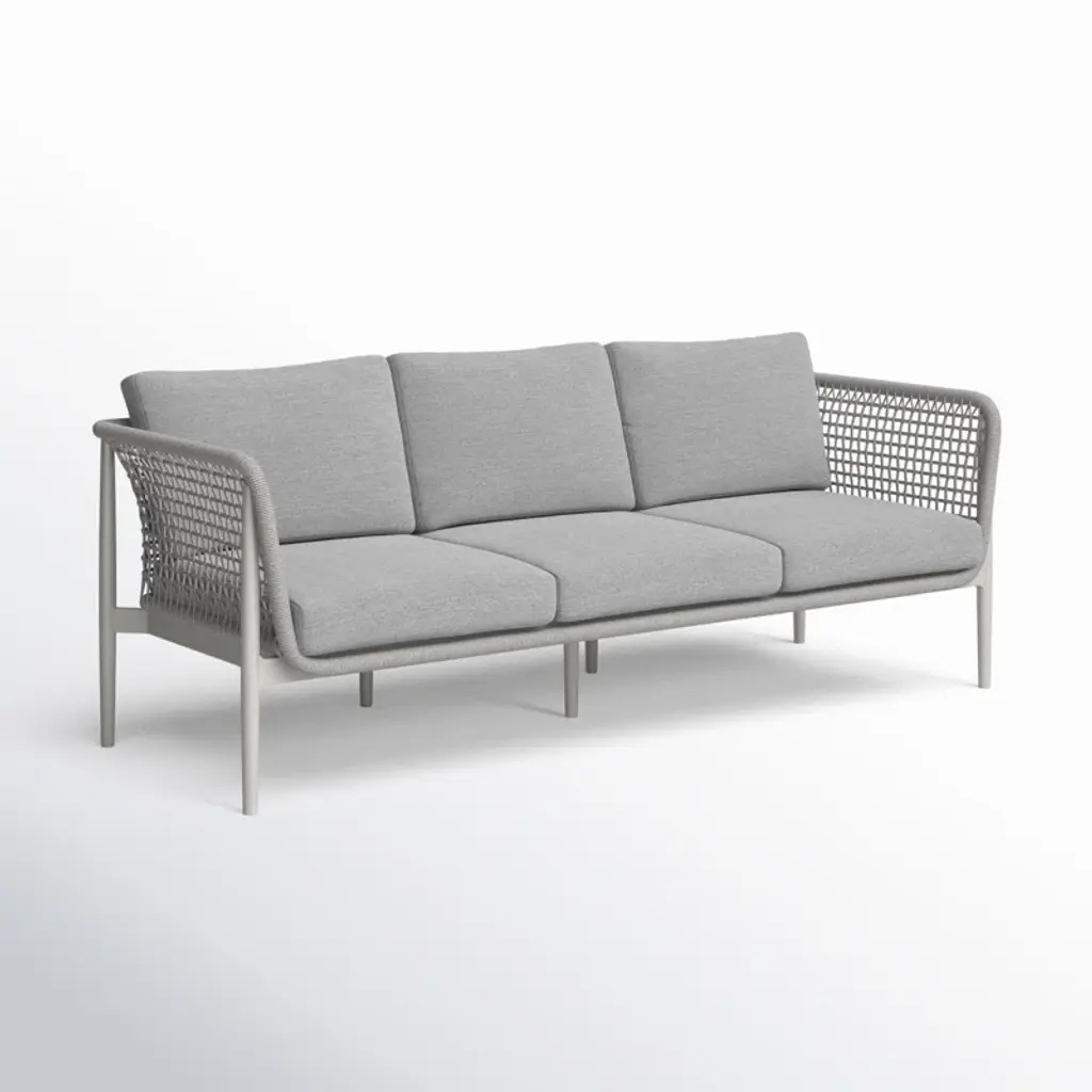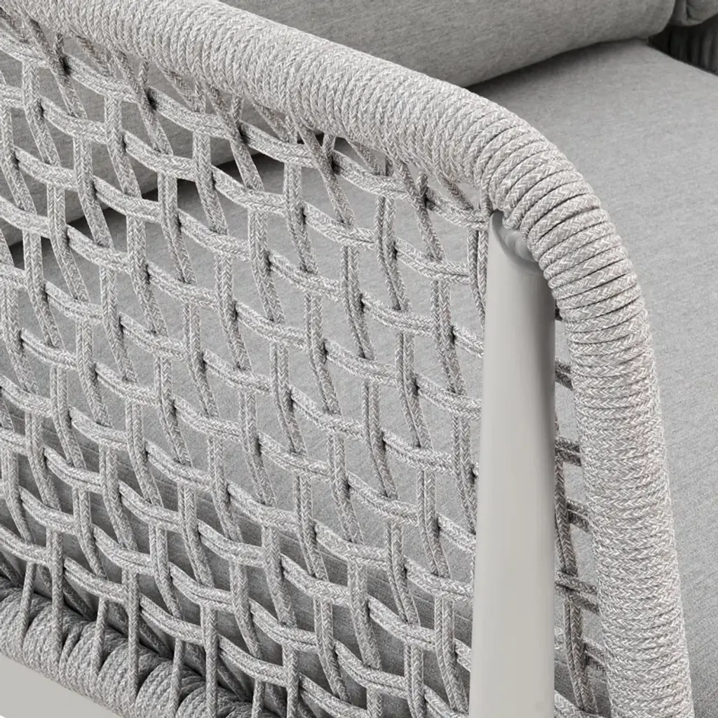 Introducing the Cayli outdoor patio sofa – an embodiment of contemporary design and outdoor indulgence meticulously crafted to redefine your lounging experience. This sleek outdoor sofa seamlessly blends the refined appeal of aluminum with the tactile elegance of light gray rope detailing and the sumptuous comfort of cushions made from solution-dyed acrylic fabric, creating a stylish and enduring centerpiece for your outdoor furniture collection. Crafted with precision, the Cayli outdoor patio sofa features a robust aluminum frame, ensuring both durability and a modern aesthetic that effortlessly complements various outdoor settings. The aluminum frame not only contributes to the sofa's sleek charm but also provides sturdiness, making it a reliable and resilient choice for your outdoor seating needs. Designed for outdoor durability, the Cayli sofa boasts water-resistant and UV-resistant features, standing as a steadfast and stylish seating solution for your patio or garden area. Whether bathed in sunlight or facing unexpected rain, this sofa remains a reliable and eye-catching focal point for your outdoor gatherings. The incorporation of light gray rope detailing adds a unique visual dimension to the design, creating a captivating contrast with the smooth aluminum frame. Paired with removable cushions with a zippered cover, the Cayli sofa invites you to relax in both style and comfort. Solution-dyed acrylic fabric ensures vibrant colors and resistance to fading, providing lasting beauty even in the face of changing weather conditions. Whether you're hosting gatherings or seeking a tranquil retreat, the Cayli outdoor patio sofa offers an inviting and luxurious seating option.