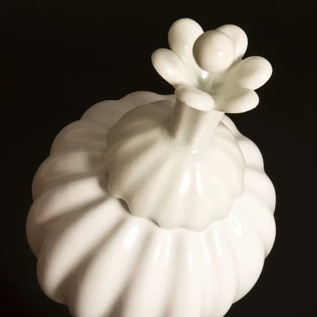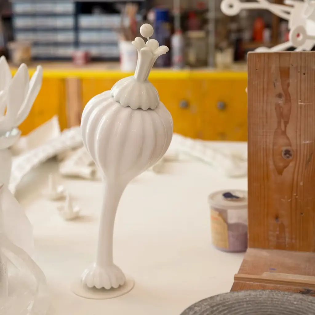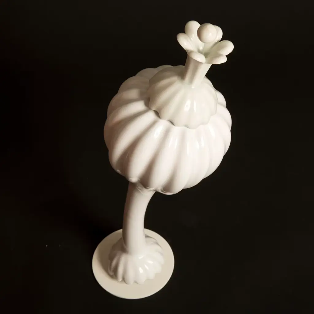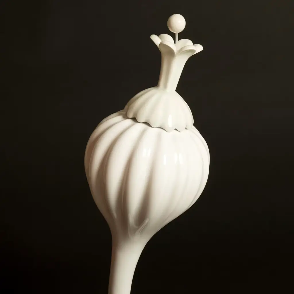 White glazed ceramic ascends gracefully to form an ornamental flower sculpture on a painted metal stand. Handcrafted flawlessly, this elegant design exemplifies the playful but elegant design of master ceramist Roberto Cambi. Colors can be customized.