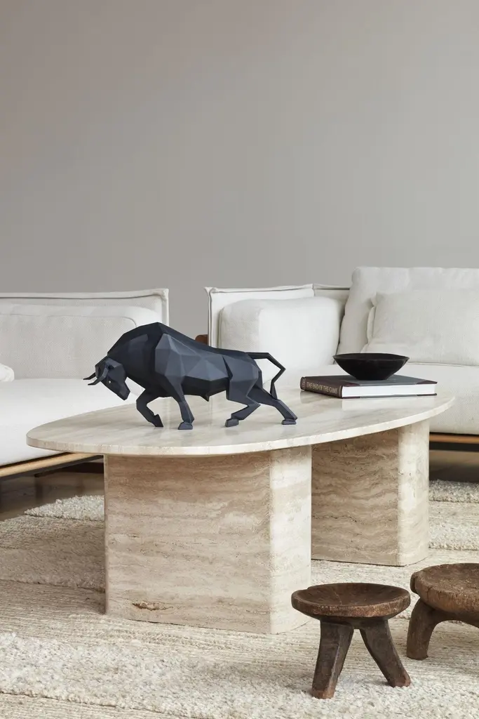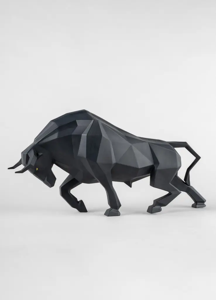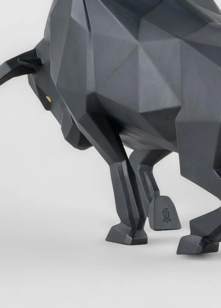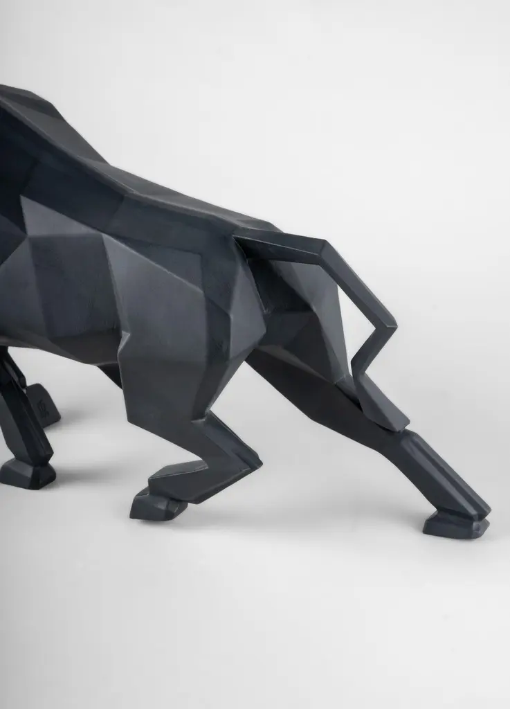 Porcelain sculpture depicting a bull, from the Origami collection. A creation portraying a bull in its typical pose as it prepares to charge. Part of the Origami collection which offers a geometric and conceptual vision of the animal kingdom. This sculpture is handcrafted in matte black porcelain with a touch of color in the animal’s eyes.