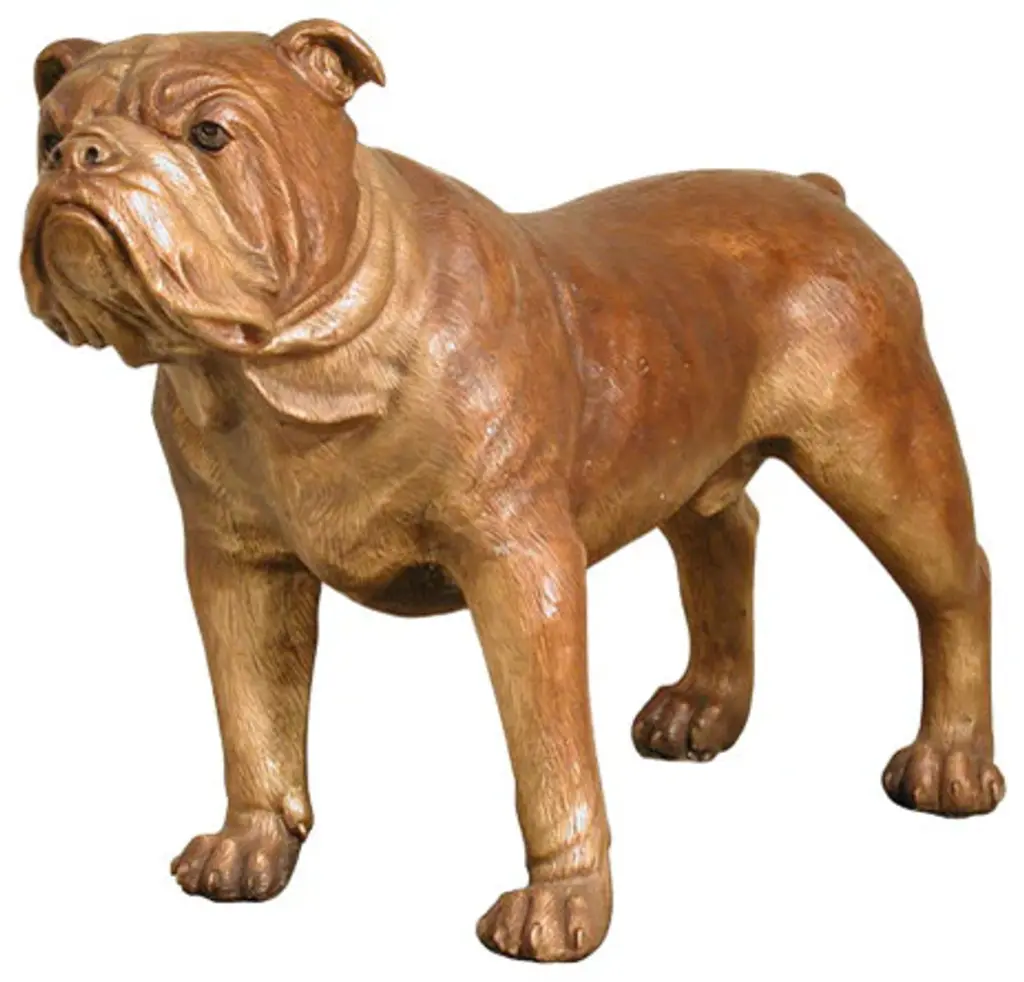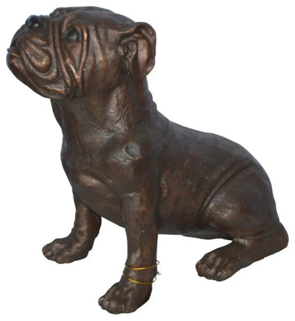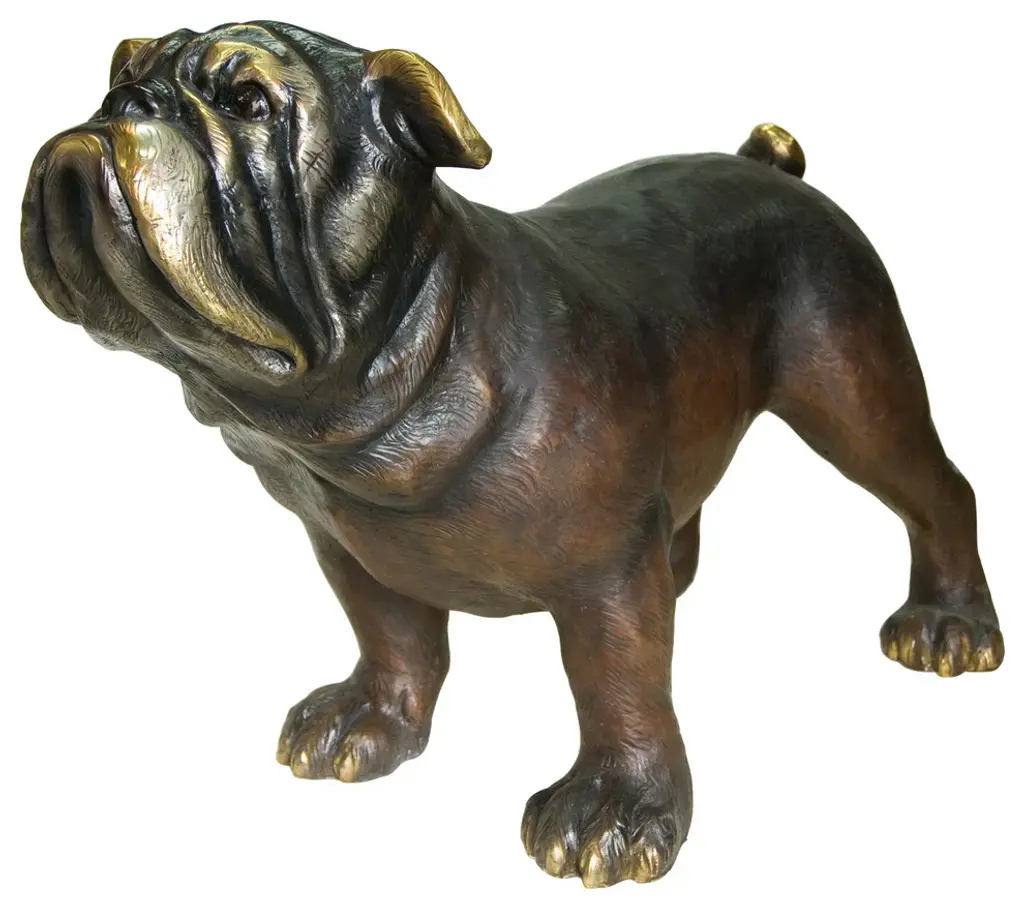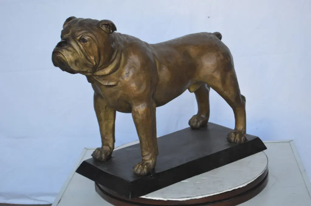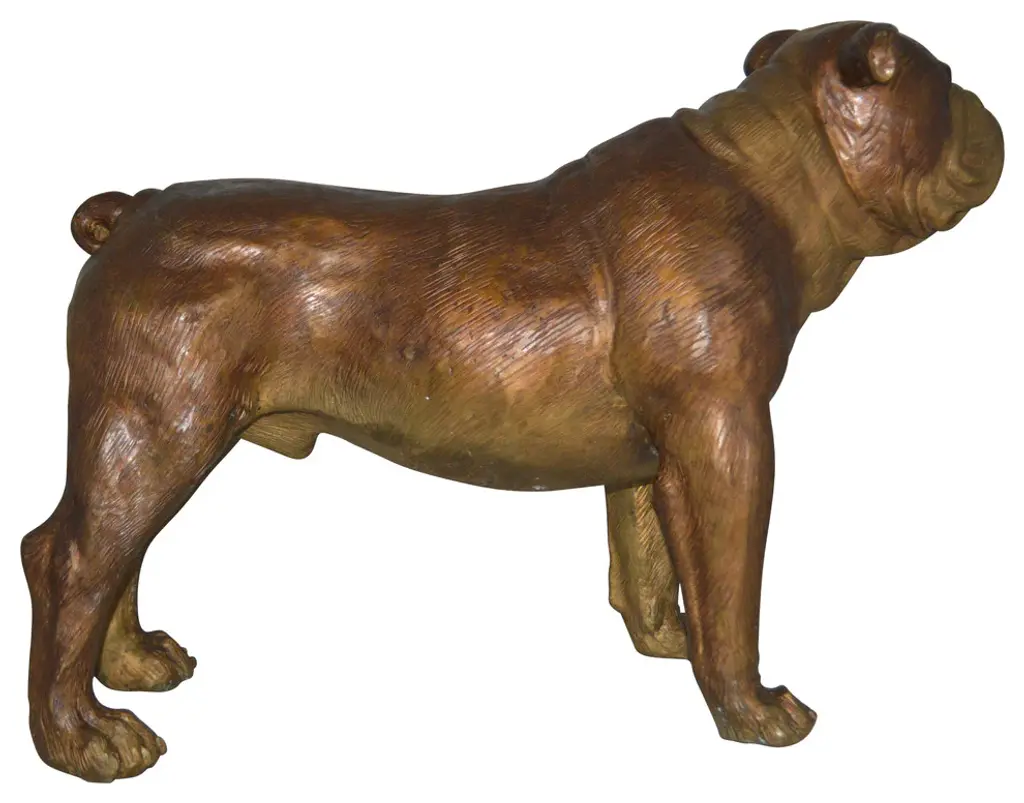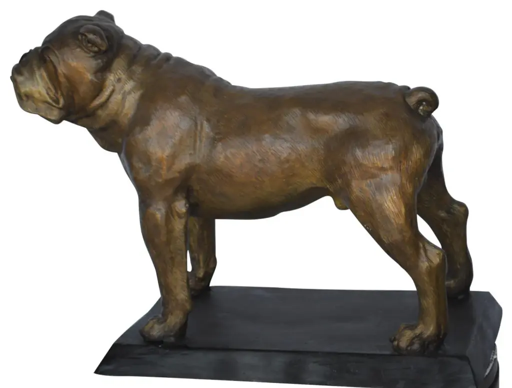 Enjoy this life size bronze statue of a Bulldog AKA British Bulldog mounted on a bronze base. British Bulldogs is a muscular, hefty dog with a wrinkled face and a distinctive pushed-in nose. Bulldogs have a longstanding association with English culture and to many the Bulldog is a national icon, symbolizing pluck and determination. This British Bulldog bronze statue would be a great addition to your home or garden. Size: 32"L x 10"W x 21"H. Weight is: 50Lb