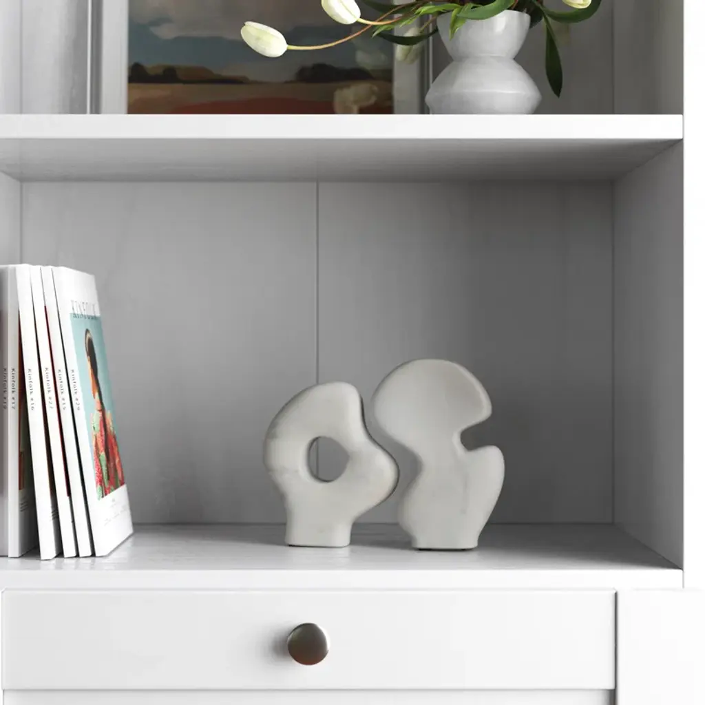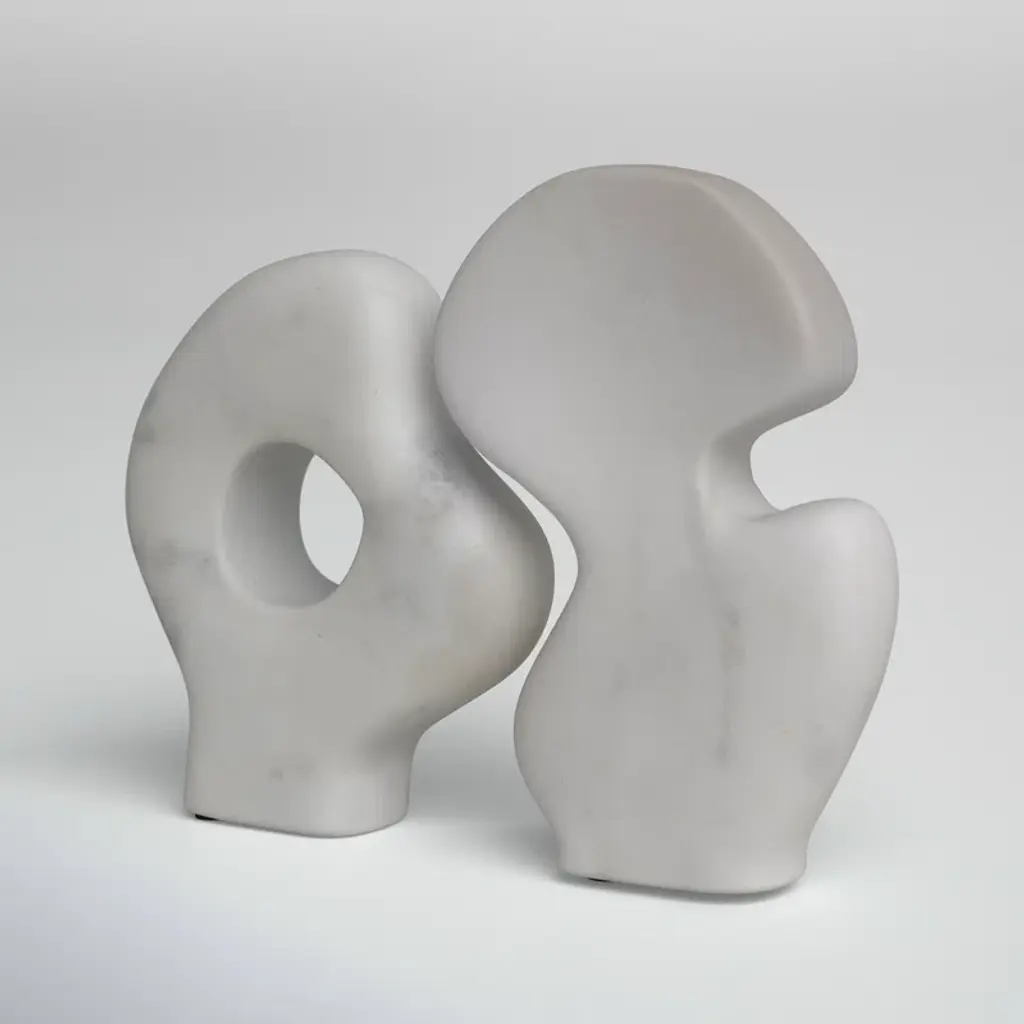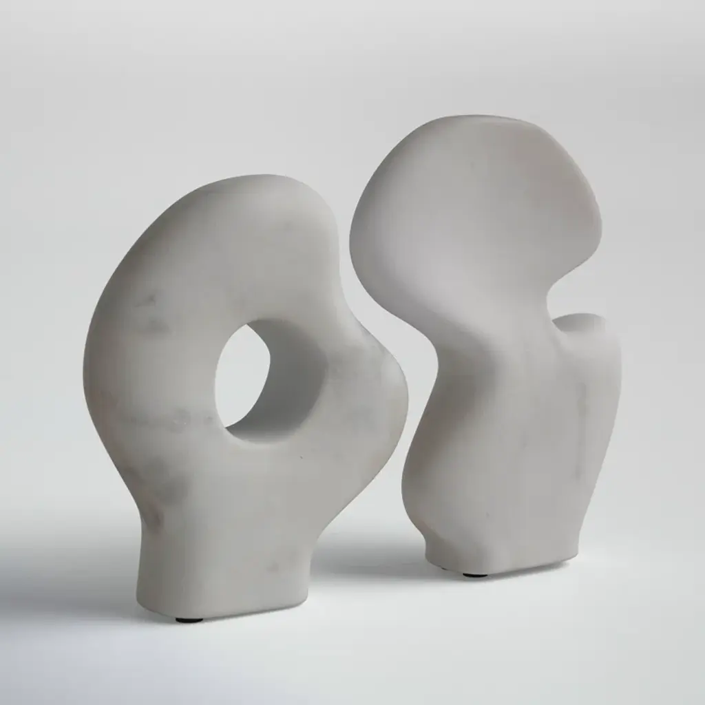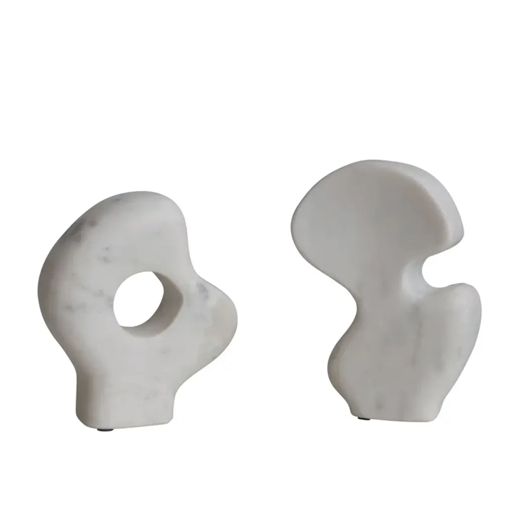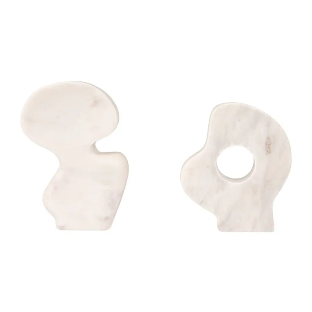 Organic elegance. This 2-piece sculpture set features abstract organic silhouettes crafted from polished white marble. These eye-catching figurines bring a modern edge to any tabletop or mantel, effortlessly elevating your home office, entryway, or lounge. The weight of the marble adds a sense of substance and sophistication to your space. Let these artful accents speak for themselves or pair them with other decorative pieces for a curated look.