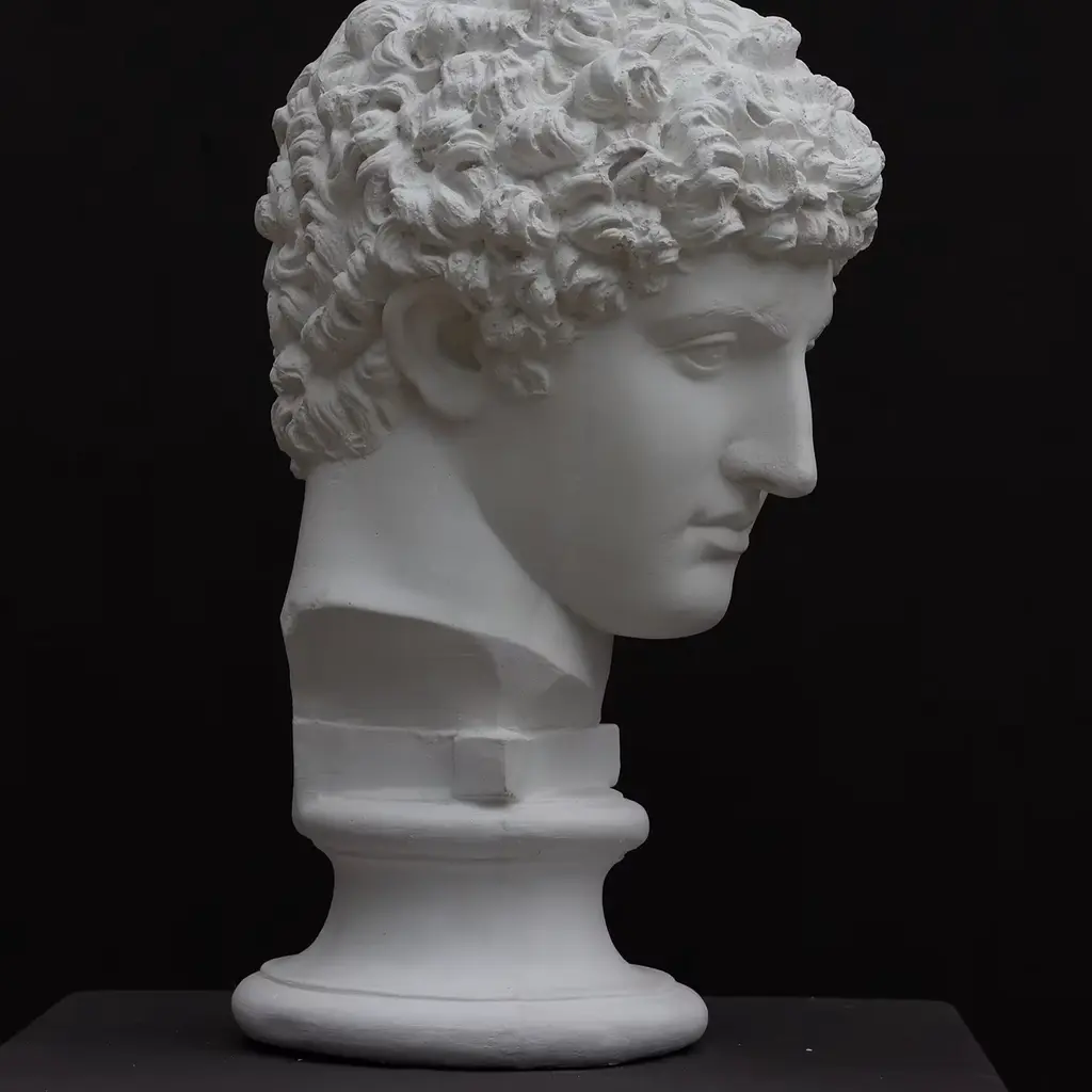 This plaster sculpture was created by hand by the artists of Galleria Romanelli. it depicts the young Greek Antinous, famous for his relationship with Roman emperor Hadrian. The bust captures the young man's features rendered in stunning detail.