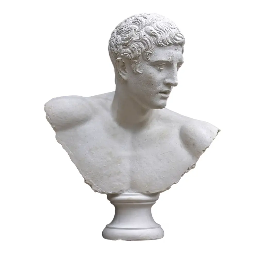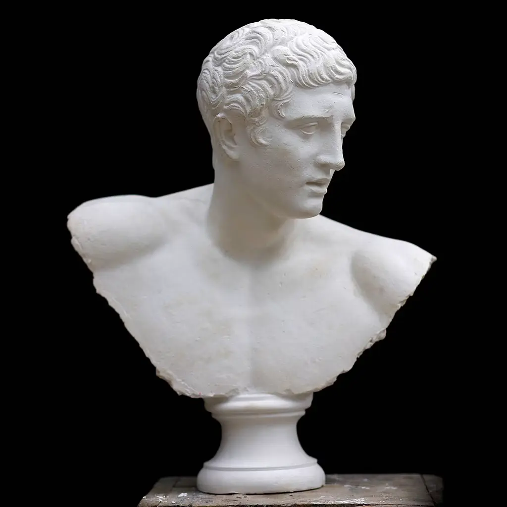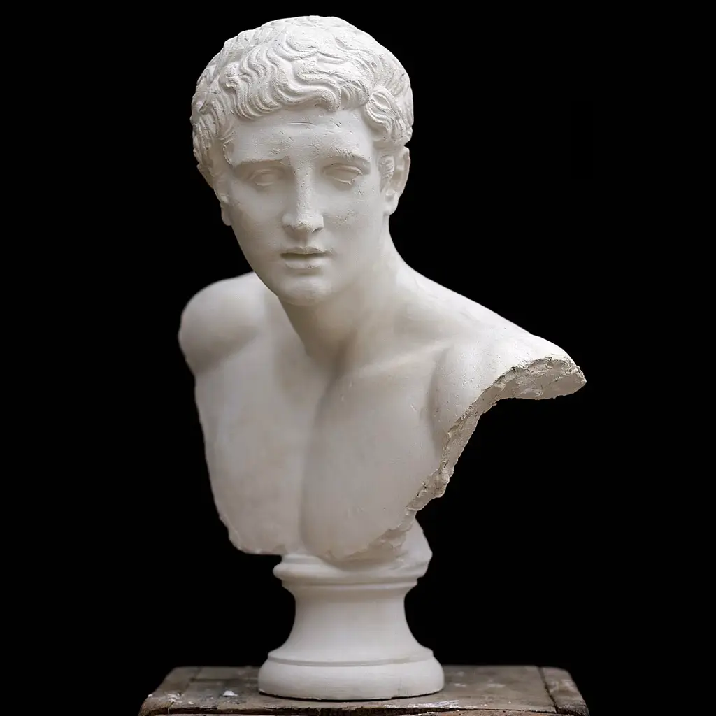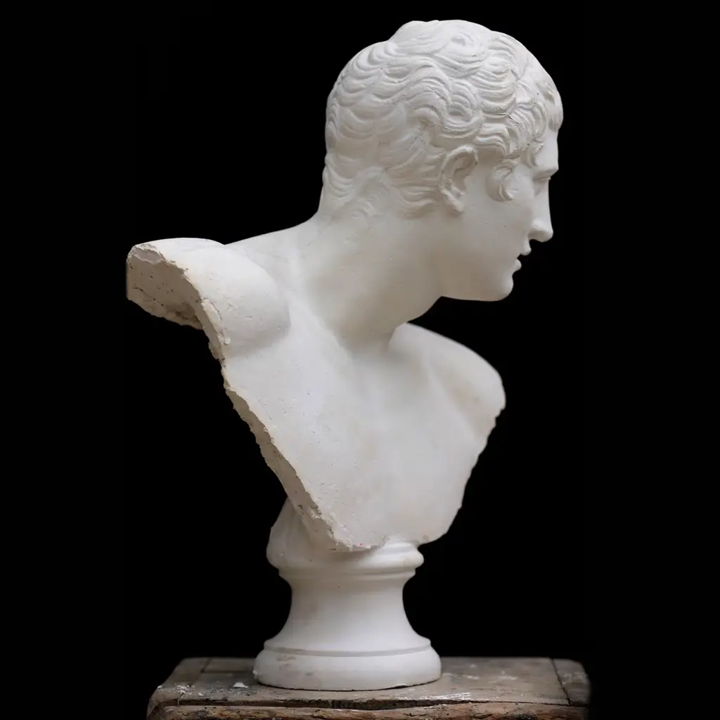 This exquisite bust is an exact depiction of the face of the Discobolus, the famous Greek sculpture whose celebrated Roman copies are housed in the National British Museum and the Museo Nazionale Romano. Hand-sculpted by the artists at the Studio Galleria Romanelli, the irregular cut of the fragment contrasts with the perfect definition of the face and hair. The bust can be customized in white or with an antique effect, please ask the Concierge for details.