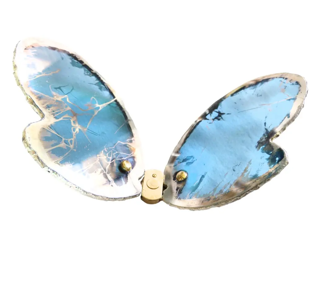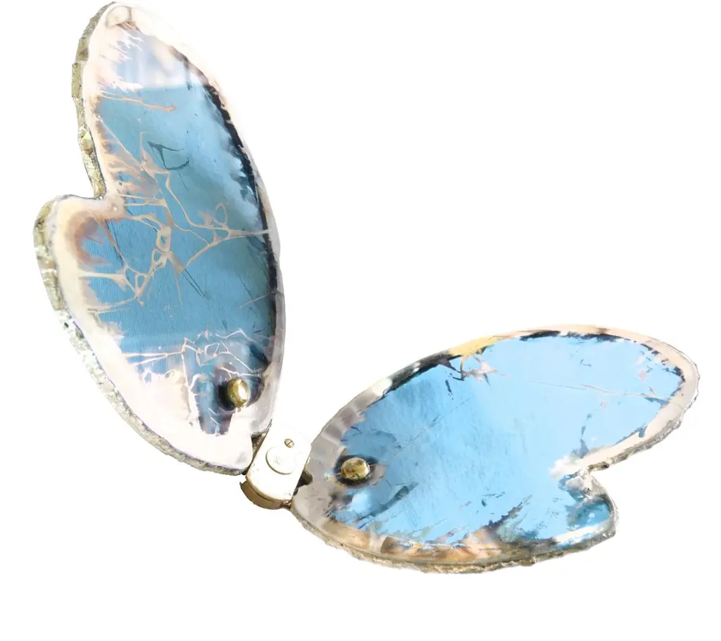 BUTTERFLY light blueThe free dance movementFor more than 22 years, Sabrina Landini pays homage to glass surfaces in her expression of silvered masterworks, the hallmark of her collection.Since the beginning thanks to the Italian hand-made used in our workplace, each unique item is a testament to our commitment to craftsman-ship, with attention to detail and the finest materials.Capture your dream and let your imagination soar with Butterfly, the ethereal light object inspired by the sense of freedom. Symbol of joy, optimism and wonder, the Butterfly takes flight with breathtaking colored wings. To highlight traditional handworks, this magnificent creation features colored hand cut and hammered glass, sprinkled across silvered tones spanning over its surface irregularly with the polished brass body, encrusted as a natural skin, finally embellished with the crystal drop. An artful blend of the iconic collection Sabrina Landini, well known for the innovative creativity. Something brilliant awaits, experience Butterfly!Available in a wide range of silvered glass colors:jade, sun, crystal, smoky grey, aquamarine, rose Electrified : US, EU, UK , 2xG9 lamp holders, dimmable.