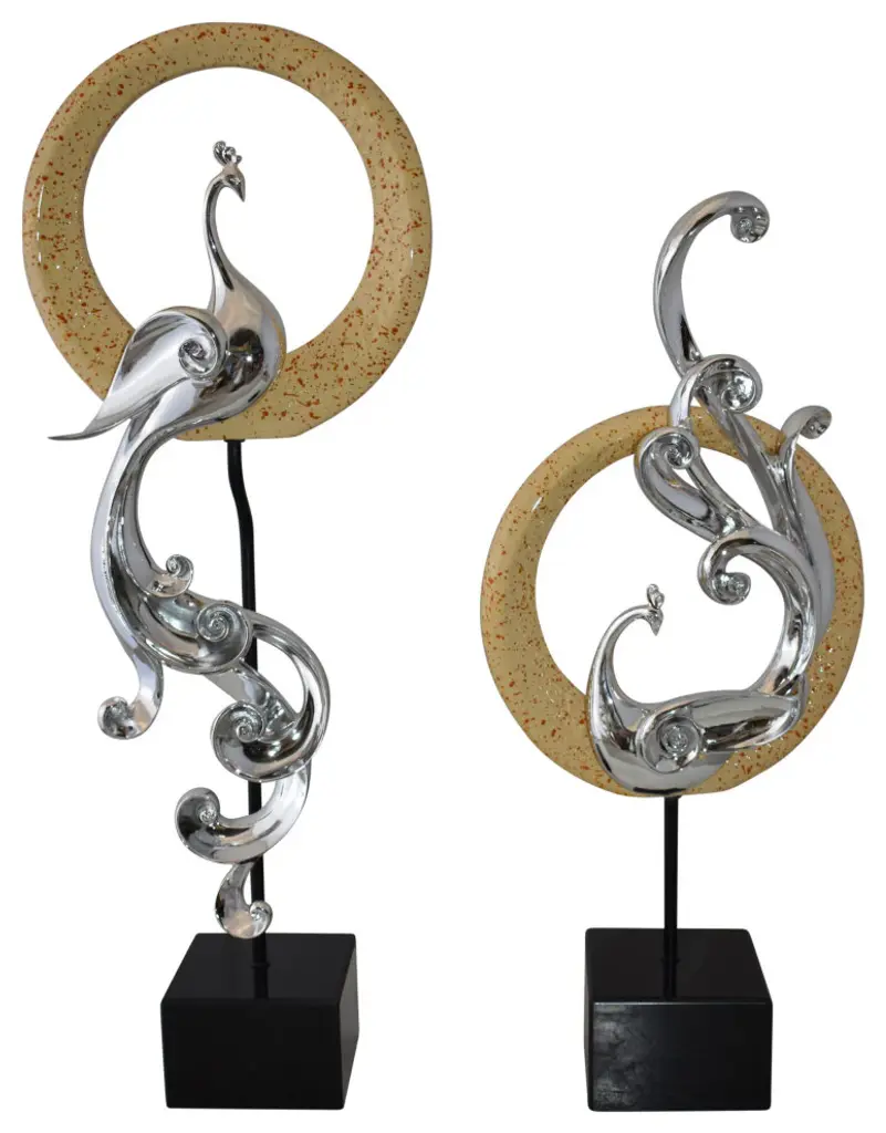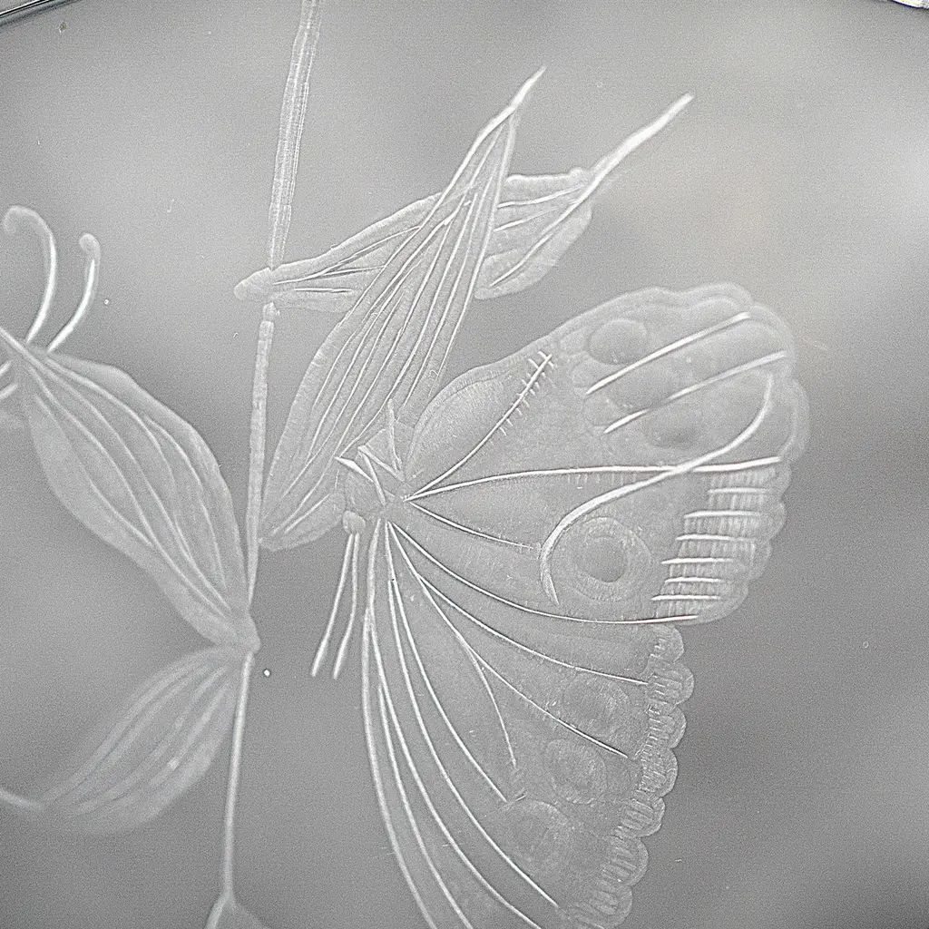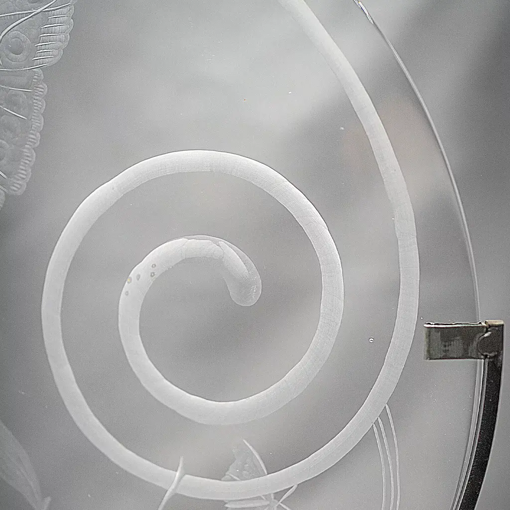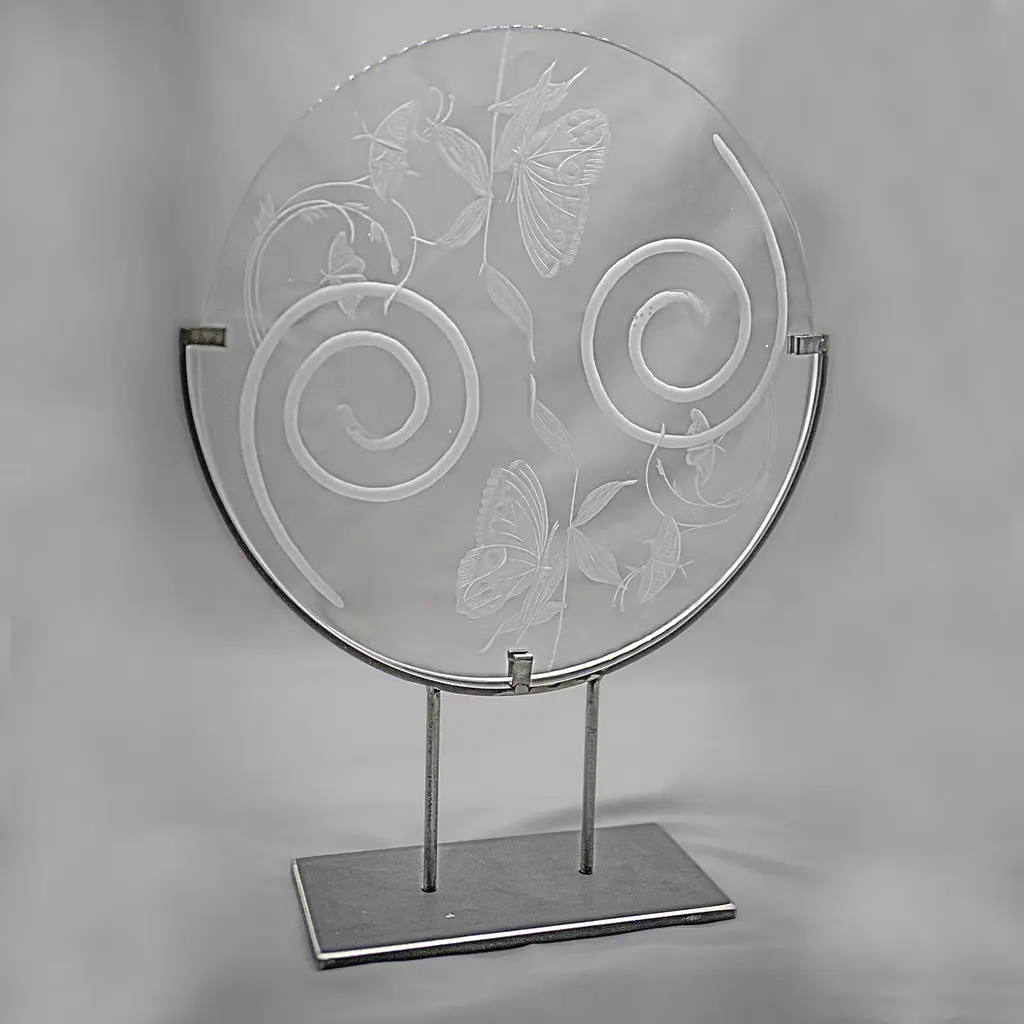This singular sculpture boasts an essential yet elegant hand-wrought iron base brimming with effortless decorative charm. A thin crystal disk (Ø 37cm, 24% lead oxide) boasts the minute etching of butterflies and willowy stems in the midst of two satin spirals. It is best coupled with a light source that will highlight its intricate details.