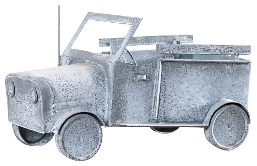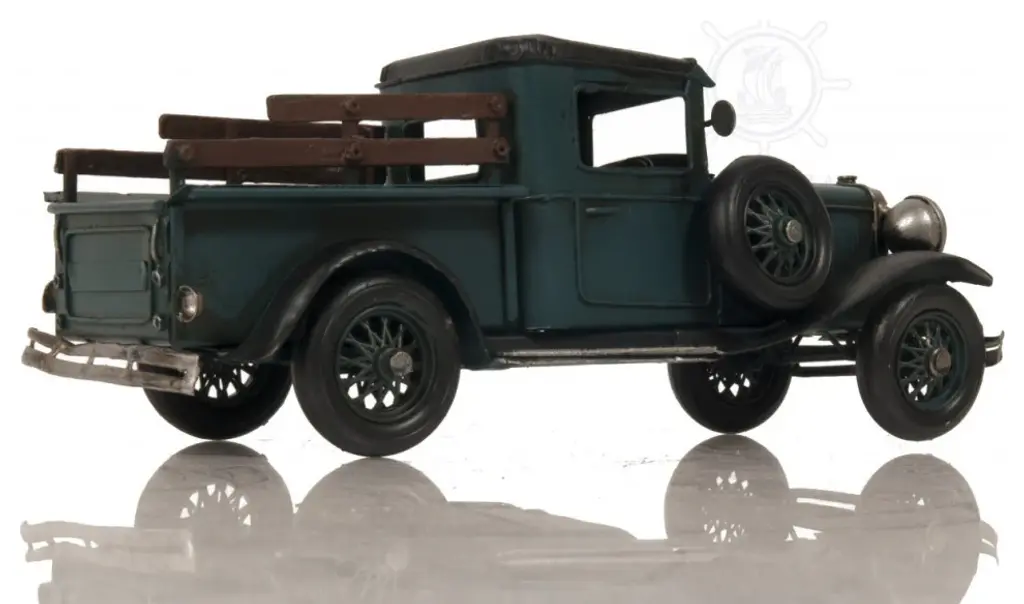 An authentic replica of one of the most iconic pickup trucks of the pre-WWII era, the c1928 Ford Model A Pickup Sculpture is a sought-after model for all collectors and automobile enthusiasts. Handcrafted from metal and meticulously detailed, this model features rolling wheels, headlights, a steering wheel, and a rack system. It is a great conversation starter and an excellent piece for any vintage car collection. 4.5'''' x 11'''' x 4"